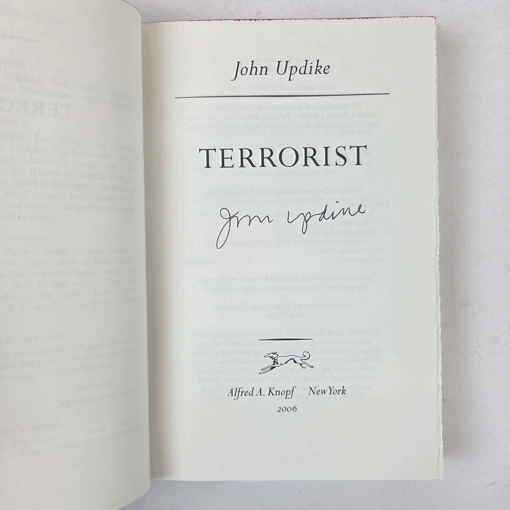 New York, New York: Alfred A. Knopf, 2006. First Edition, First Printing. Hardcover. Octavo, 310 pages. In Very Good condition with Very Good condition dust jacket. Spine is black and purple with white lettering. Dust jacket protected by mylar covering, price uncut: "$24.95" on front flap, Boards fully bound in publisher's blue cloth and have mild shelving wear along spine tail. Textblock head edge dyed magenta. Signed flat on title page by John Updike. Shelved Room C overflow. 1404299. Special Collections.