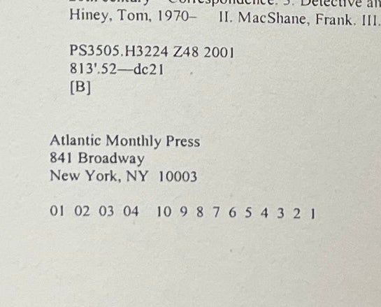 New York: Atlantic Monthly Press, 2001. First Edition. Hardcover. Fine/Fine. Fine in an about Fine jacket, unclipped ($25.00), bumped at the edges. Brown paper on the boards with gilt lettering on the spine. Square and firmly bound, clean internally. A collection of Chandler's correspondence in which he discusses his dislike of James M. Cain's writing, his views on American life, among other topics, paired with his nonfiction writings.