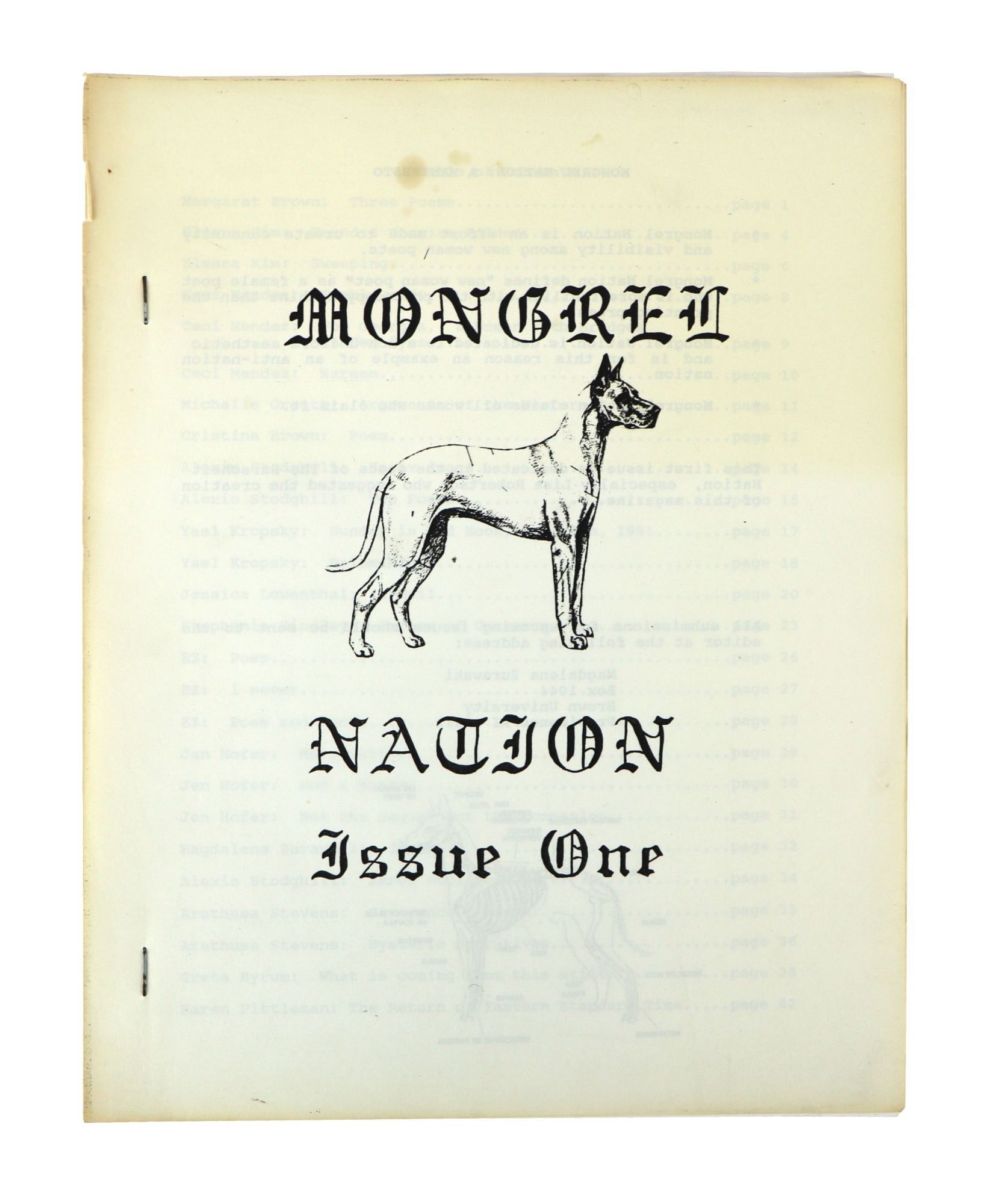 Evidently the only issue published of this DIY poetry zine put together by then-Brown University student Magdalena Zurawski. The contents open with the four bullet points of the Mongrel Nation manifesto: "Mongrel Nation is an effort made to create community and visibility among new women poets / Mongrel Nation defines 'new woman poet' as a female person who is more familiar with the photocopy machine than the printing press."