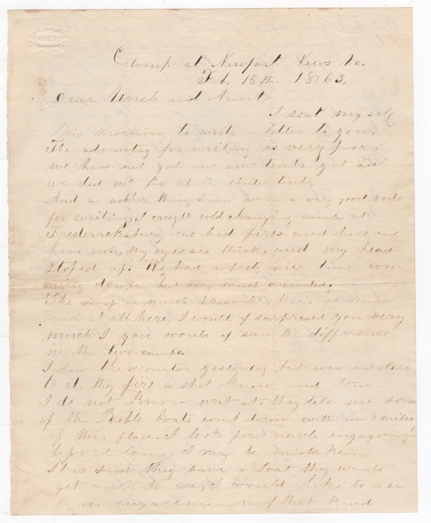 Newport News, VA, 1863. Very good, closed tear along one fold, light soiling, contents faded, but clean.. [2] pp. 8 x 10 inches. February 15th, 1863. R.H. Irwin of Company E, 51st Regiment, 2nd Division, 2nd Brigade, 9th Army Corps. of the Pennsylvania Infantry. Irwin writes to his uncle & aunt, and, after commenting on his march from Fredericksburg, tells them of the improved camping conditions at Newport News, and of his seeing the a monitor. "I caught cold changing camp at Fredericksburg ... We had a pretty nice time coming down, but very much crowded...The camp is much pleasanter. There is know mud at all here...