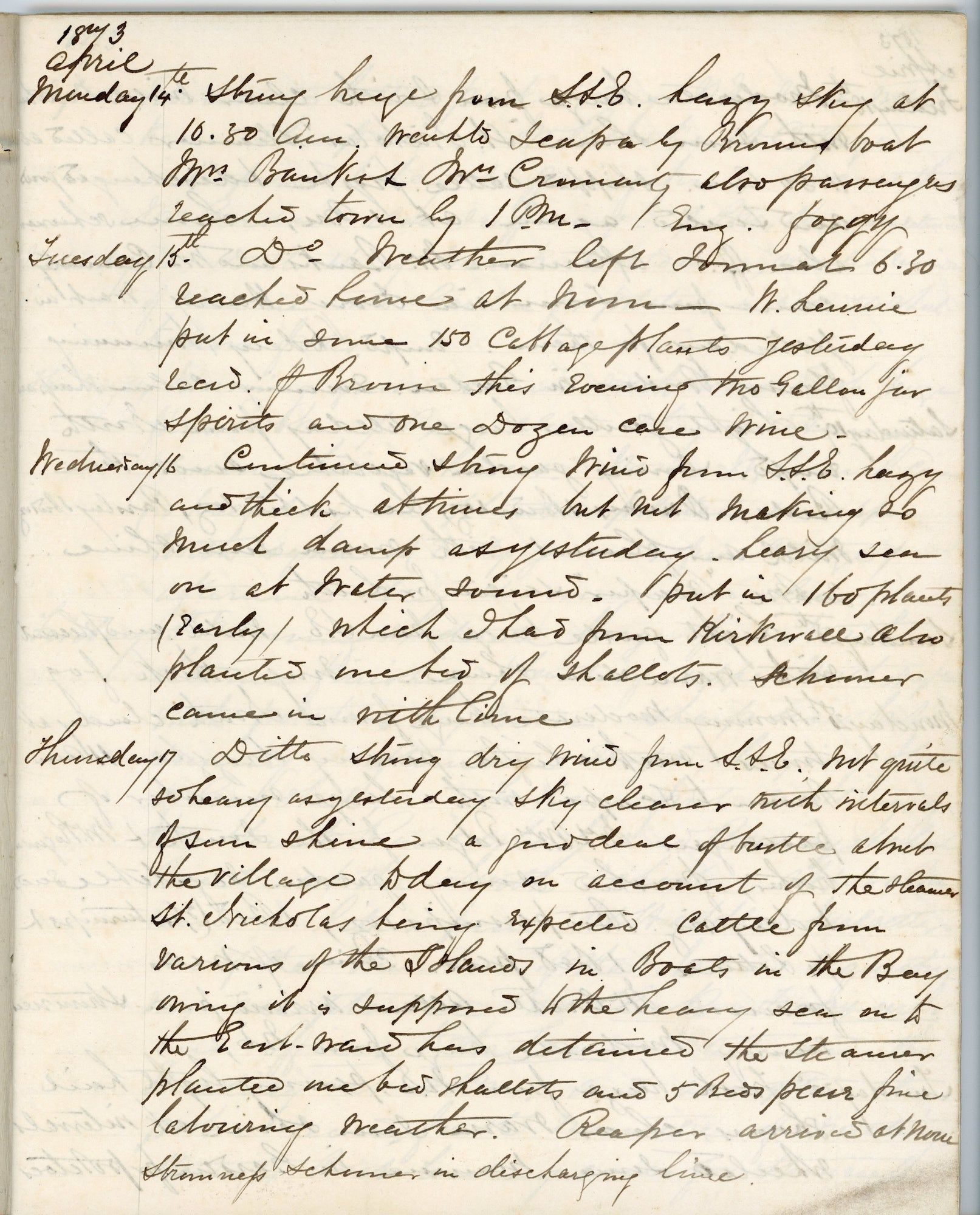 [Kirkwall, Orkney, Scotland], 1873. Paper wrappers. A near fine copy.. [56 pp.]. 4to. A rare daily diary from April 14th 1873 to January 27th, 1874 detailing the weather, storms, the growing of crops, cattle shipments, plantings, the comings & goings of the islanders, of ships, some large, mostly smaller Reaper class, to & from Inverness, Edinburgh, Wales ,and beyond, including the author's trip to Edinburgh concerning the author's acceptance as clerk, treasurer, and officer of the board of the church. The journal ends with his note that he "must down to Kara [Are of Kara] and brake the sad news to his sister about a death...and followed by "moderate [wind] with a slight drizzling rain." A wealth of information on a remote area of Orkney Islands.
