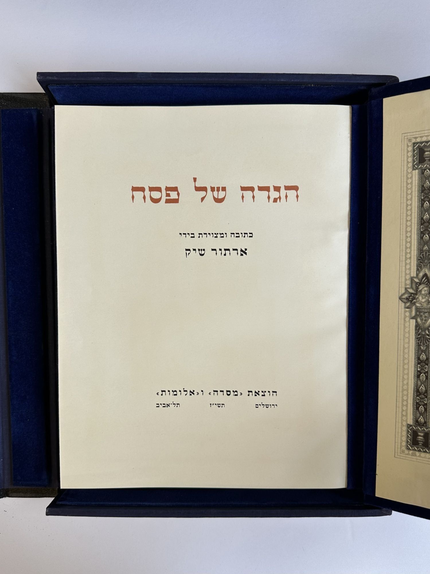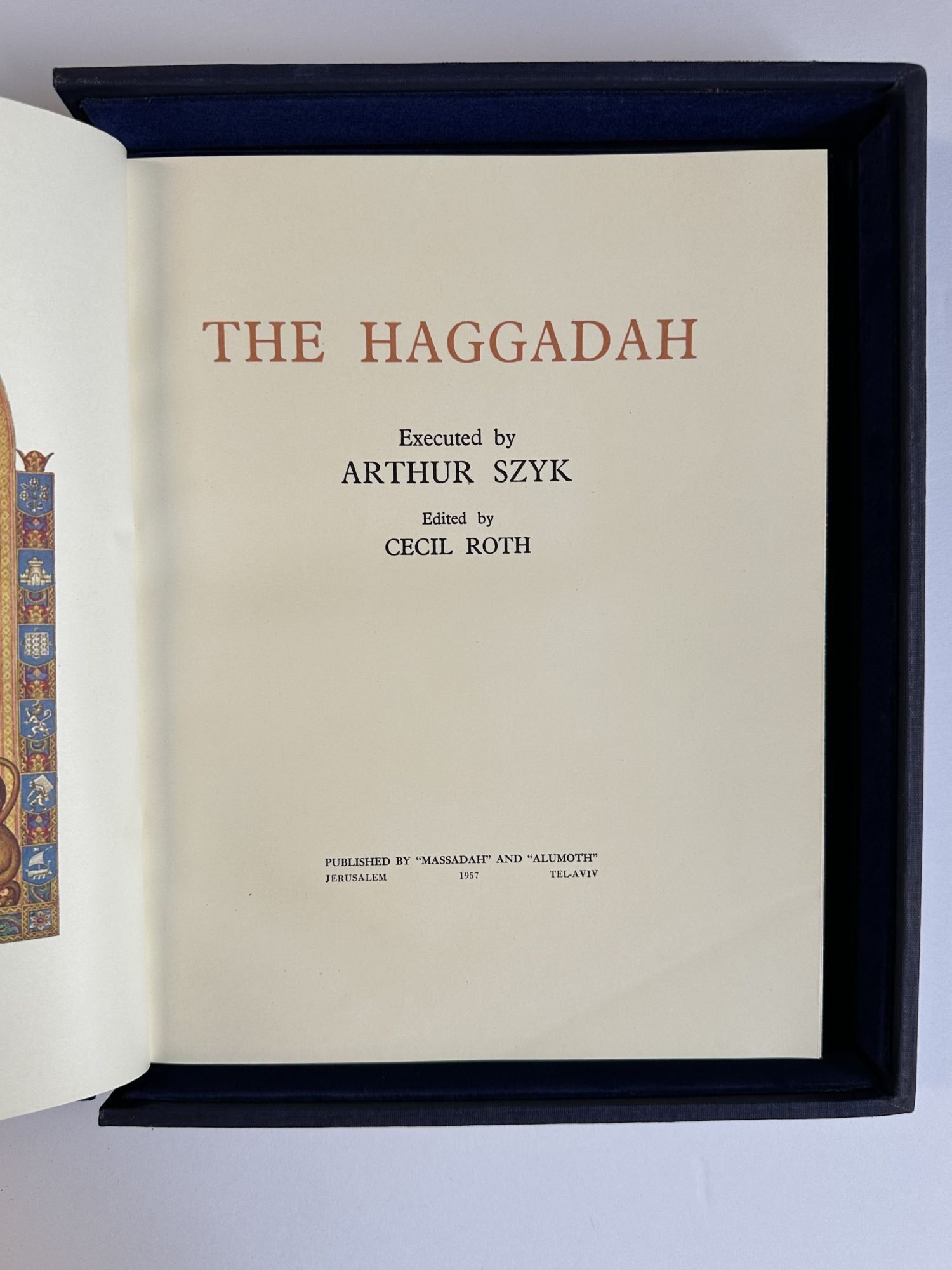 Jerusalem; Tel-Aviv: Massadah and Alumoth, 1957. Reprint. Hardcover. Octavo, Unpaginated. In Very Good condition and housed in publisher's moderately worn and discolored clam shell case. Bound in blue velvet with gilt lettering and decoration. Minor shelf wear. Previous owner's inscription on half title page. Features colored illustrations throughout by Szyk. Text in English and Hebrew. Shelved on Front Table. 1404368. Shelved Dupont Bookstore.