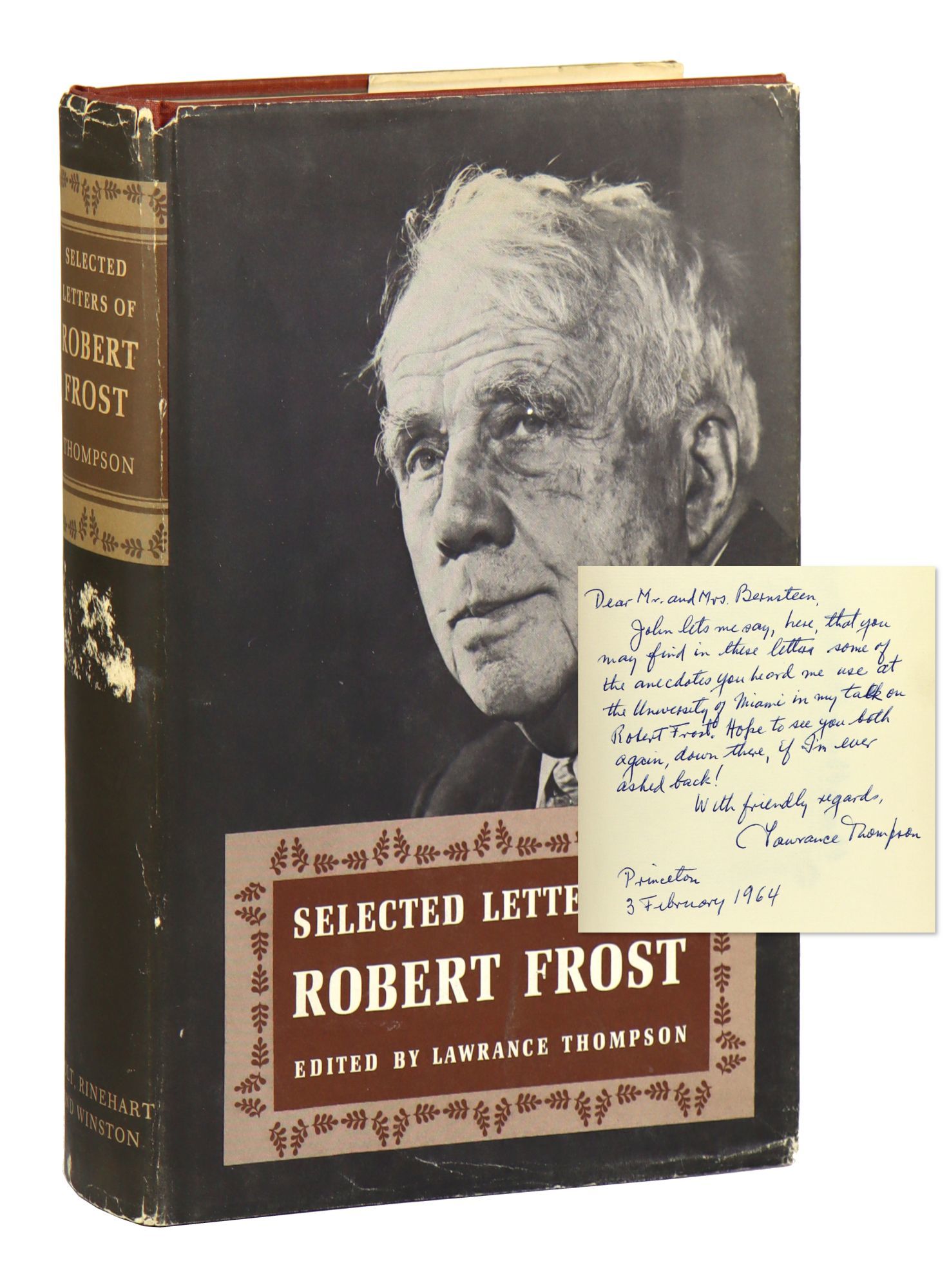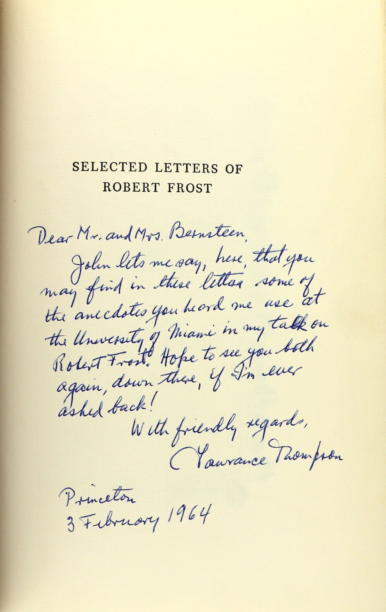 Signed by editor Lawrance Thompson on half title with inscription: "Dear Mr. and Mrs. Bernsteen, / John lets me say, here, that you may find in these letters some of the anecdotes you heard me use at the University of Miami in my talk on Robert Frost. Hope to see you both again, down there, if I'm ever asked back! / With friendly regards, / Lawrence Thompson / Princeton / 3 February 1964.