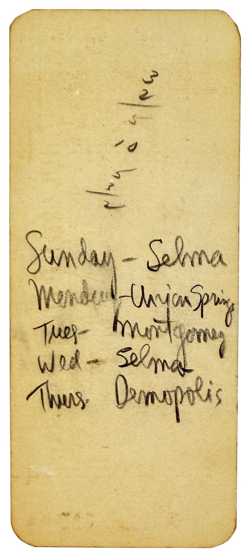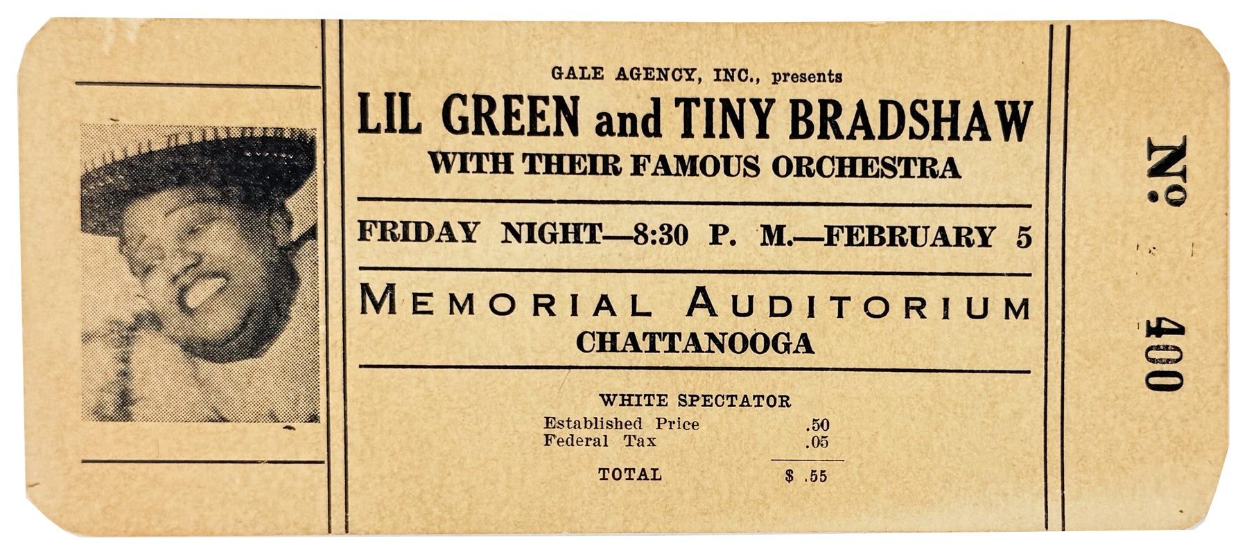 Chattanooga, TN: Gale Agency, Inc, 1943. Very Good. Chattanooga, TN: Gale Agency, Inc., [1943]. Printed ticket to see jazz and blues singer Lil Green with bandleader "Tiny" Bradshaw at Chattanooga's Memorial Auditorium in 1943. Ticket features a photograph of Green and is issued for a "White Spectator." At verso in pencil is written a schedule (possibly for the tour?) of stops in Alabama including Montgomery, Union Spring, Demopolis, and two stops in Selma. Light rubbing; Very Good.