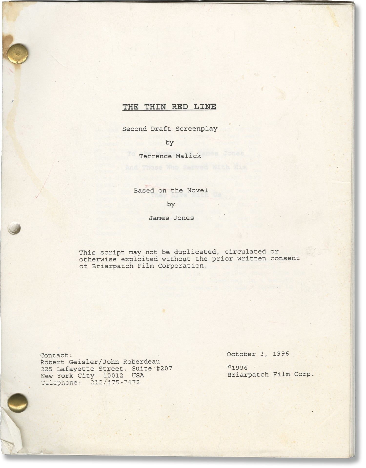Self wrappers. Title page present, dated October 3, 1996, with credits for Malick and Jones. 197 leaves, with last page of text numbered 192. Xerographic duplication, rectos only. Pages about Near Fine, bound with two gold brads.