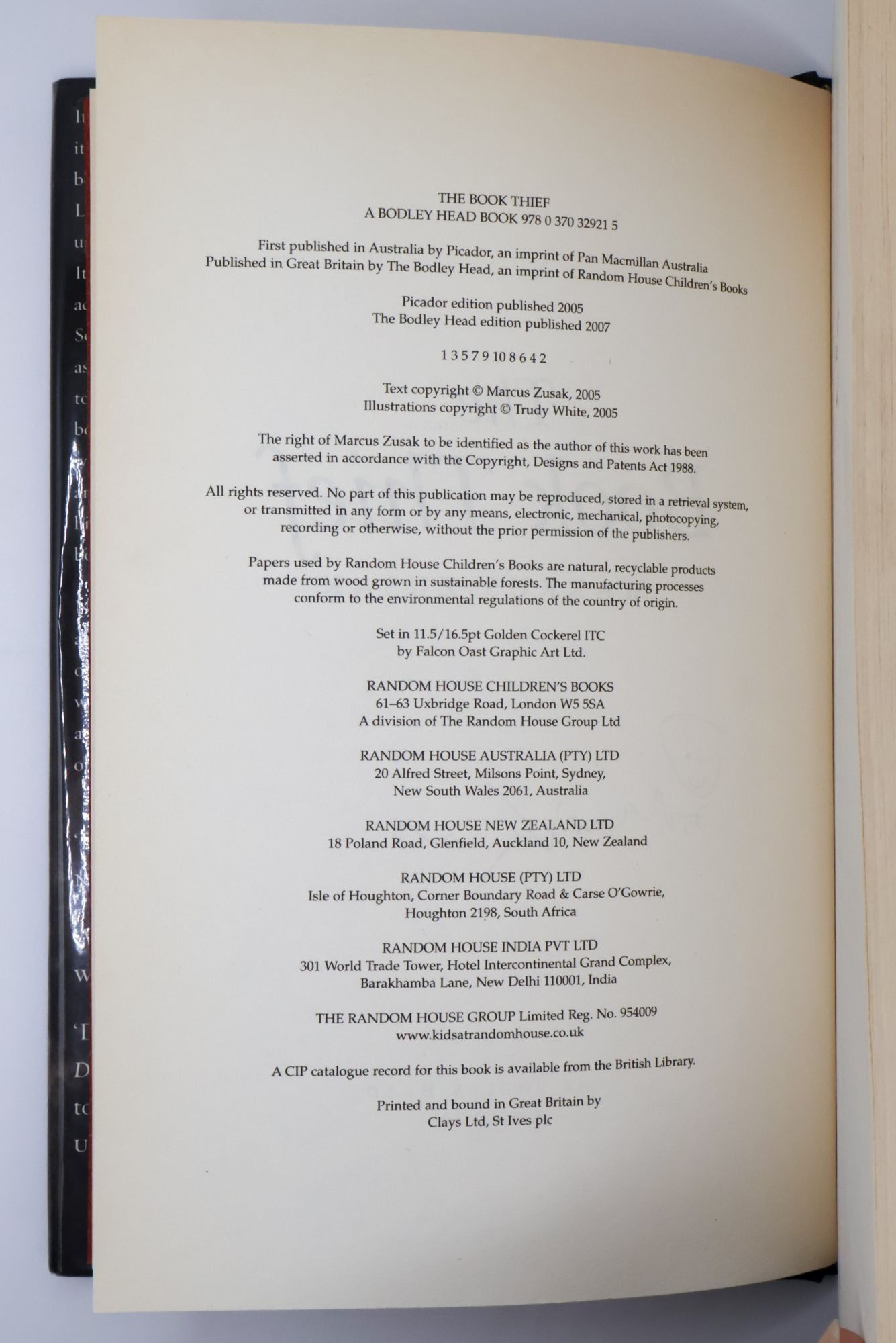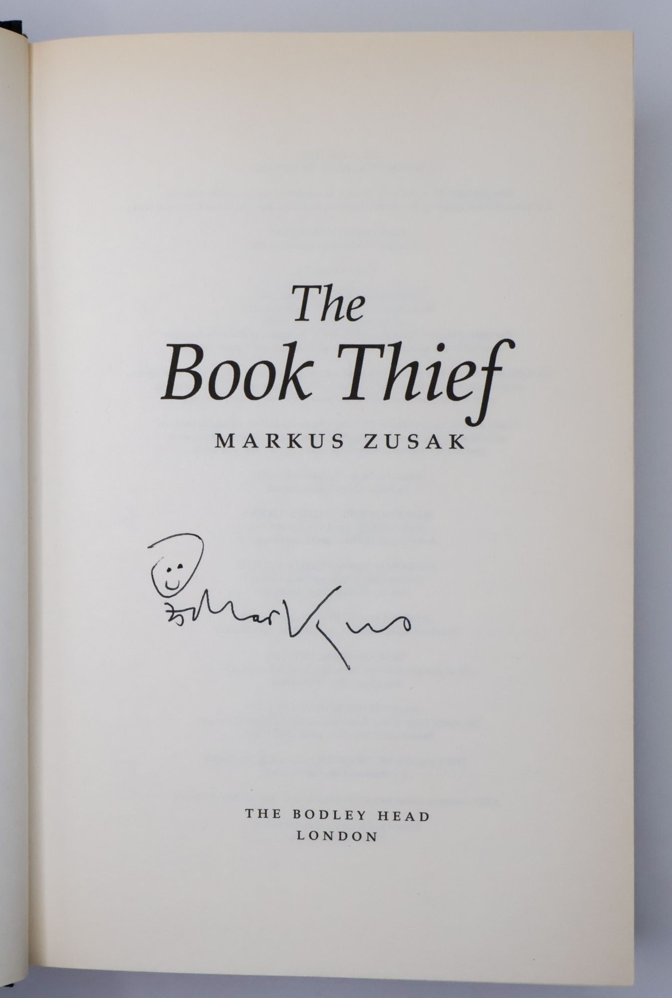 London: The Bodley Head, 2005. First UK Edition, First Printing. Hardcover. Octavo, 584 pages. In Very Good minus condition with Very Good dust jackets. Spine black with yellow and white lettering. Two dust jackets provided; top dust jacket protected with mylar covering, price uncut: "£0.00"; bottom dust jacket protected with mylar covering, price uncut: "£12.99". Minor bumping to corners of boards. Slight scuffing to outer edge of text block. Interior pages clean. Signed with doodle by Zusak on title page. Shelved Case 14. 1404398. Shelved Dupont Bookstore.