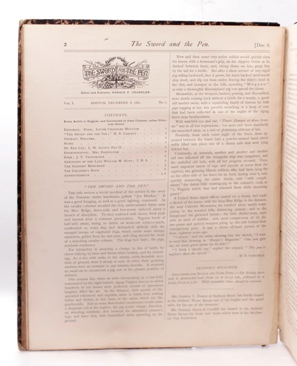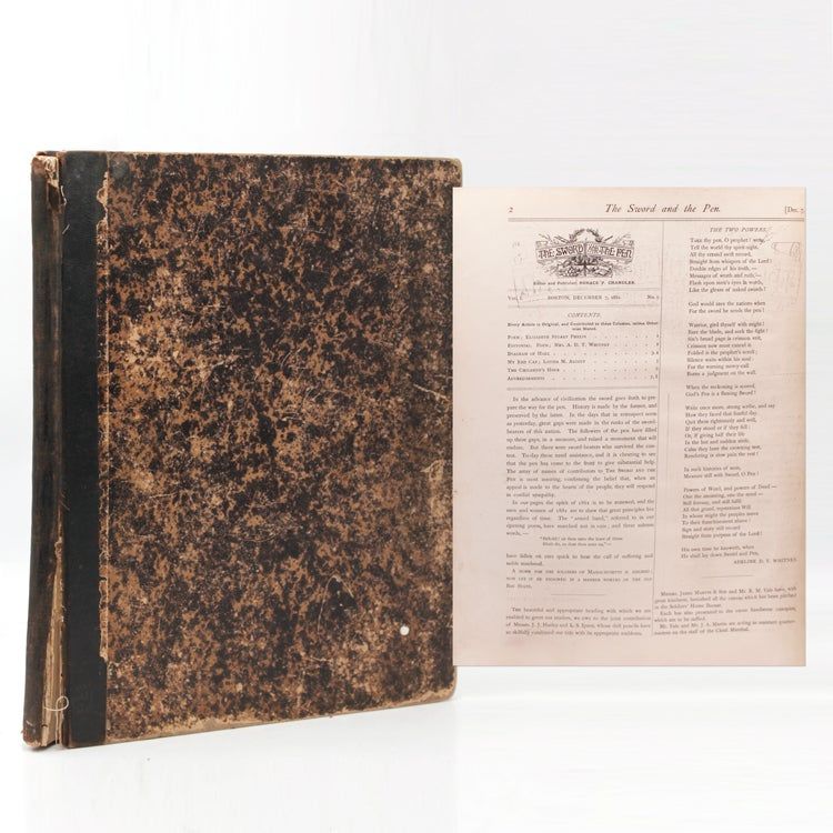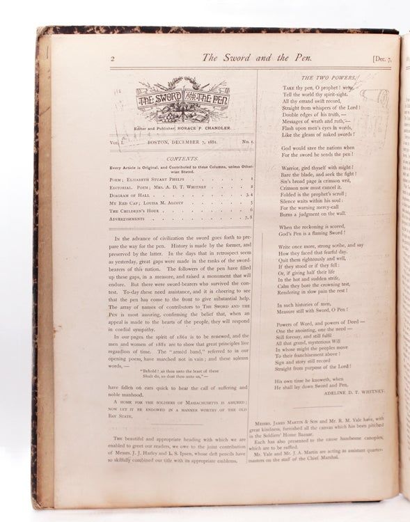Boston: The Sword and the Pen, 1881. First Edition. Illustrated. Large 4to. Quarter cloth and boards, some wear. Ex-Library bookplate only. First Edition. Illustrated. Large 4to. Includes: L.M. Alcott's short story Red Cap in Numbers 1-4. BAL 123 (A Bronson Allcott); 197 (L.M. Alcott)
