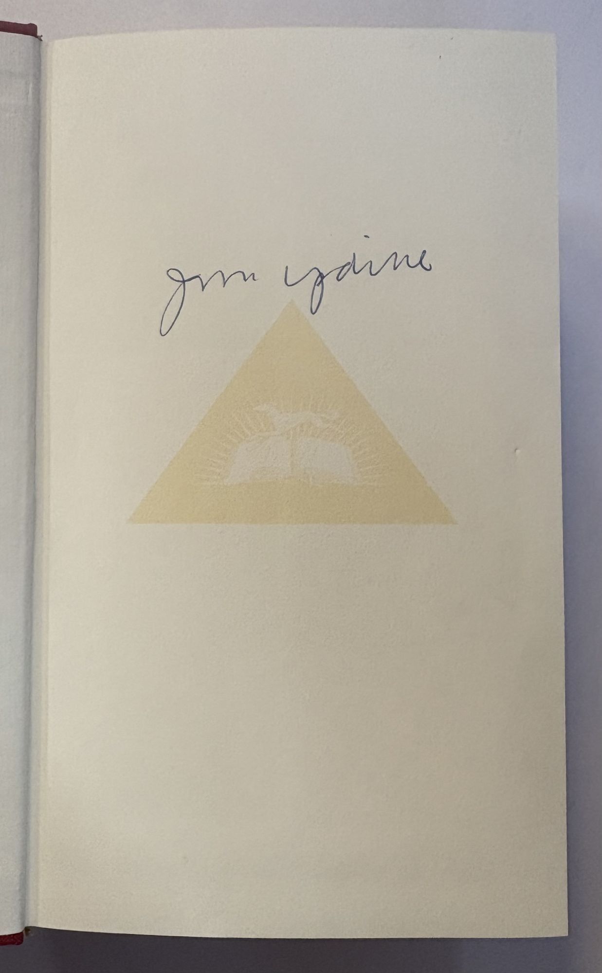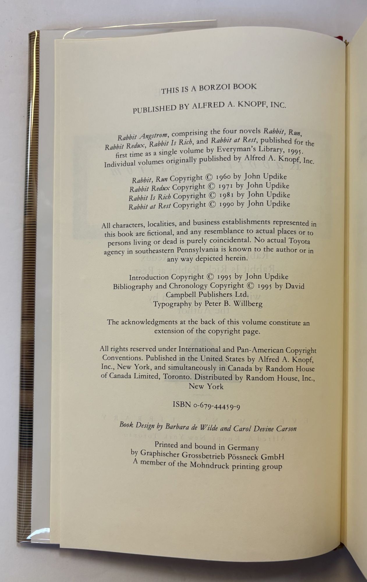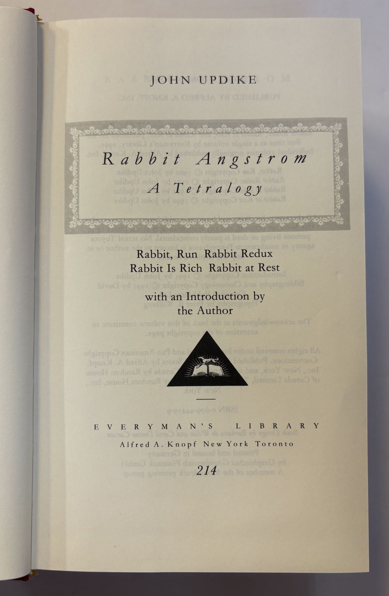New York: Everyman's Library, Alfred A. Knopf, 1995. Everyman's Library Edition. Hardcover. Octavo, 1519 pages. In Very Good minus condition with a Very Good dust jacket. Spine red and black with gold lettering. Dust jacket protected with mylar covering, price uncut: "$30.00". Minor shelf wear. Text block clean. Signed by Updike on front free endpaper. Shelved Hardcover Fiction. Includes the tetralogy of Rabbit, Run, Rabbit Redux, Rabbit is Rich, and Rabbit at Rest. 1404516. Shelved Dupont Bookstore.
