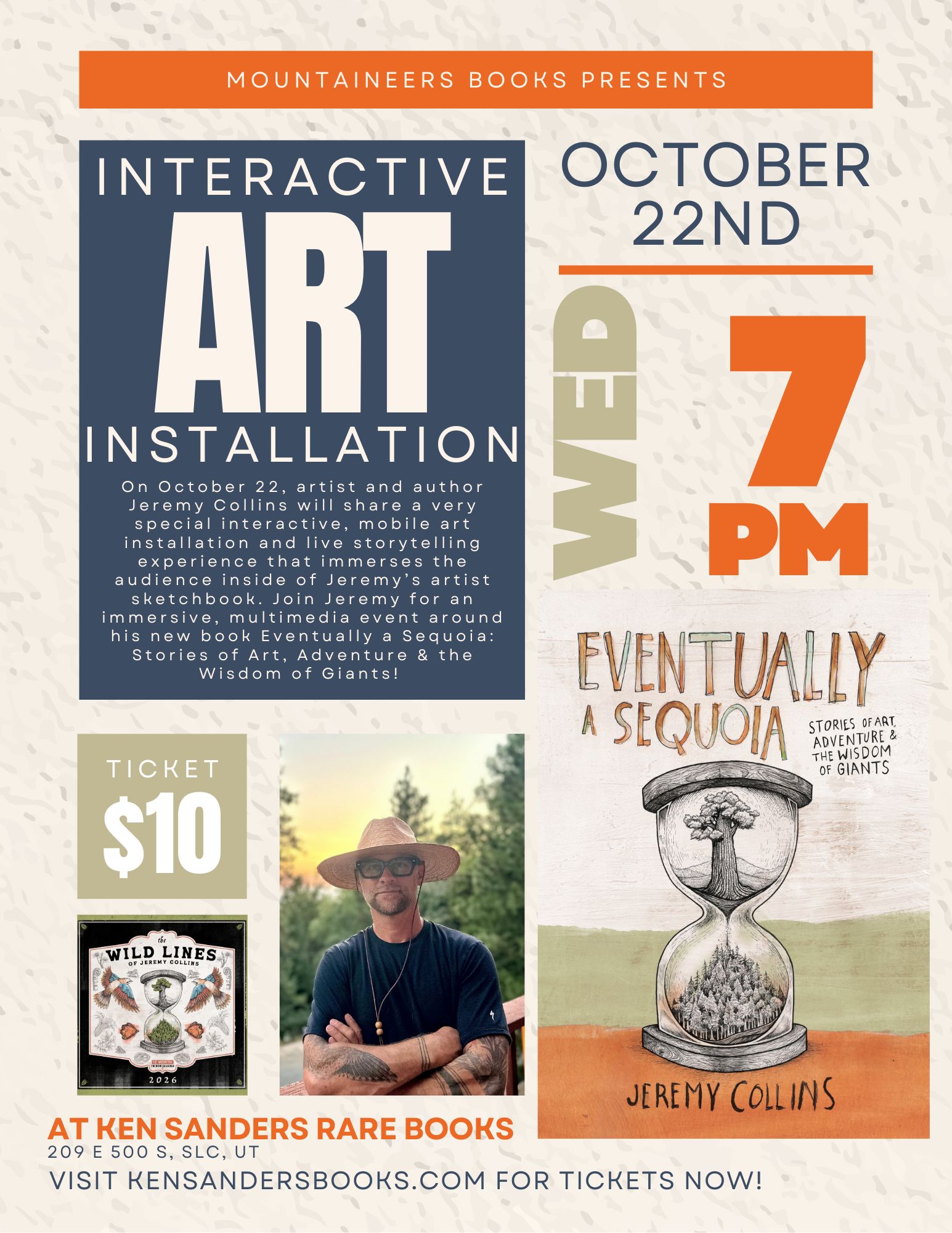 Join artist and author Jeremy Collins for an immersive, multimedia event around his new book Eventually a Sequoia: Stories of Art, Adventure & the Wisdom of Giants! Based on Jeremy’s extensive, art-filled travel journals, Eventually a Sequoia is an inspirational and vivid exploration of the natural world and how it can empower an individual to grow, change, heal, and thrive. Part memoir, part manifesto, Eventually a Sequoia is an invitation for all of us to develop a deeper appreciation for the natural world and our place in it. On October 22, Jeremy will share a very special interactive, mobile art installation and live storytelling experience that immerses the audience inside of Jeremy’s artist sketchbook. This presentation will be followed by time for audience Q&A and a book signing.