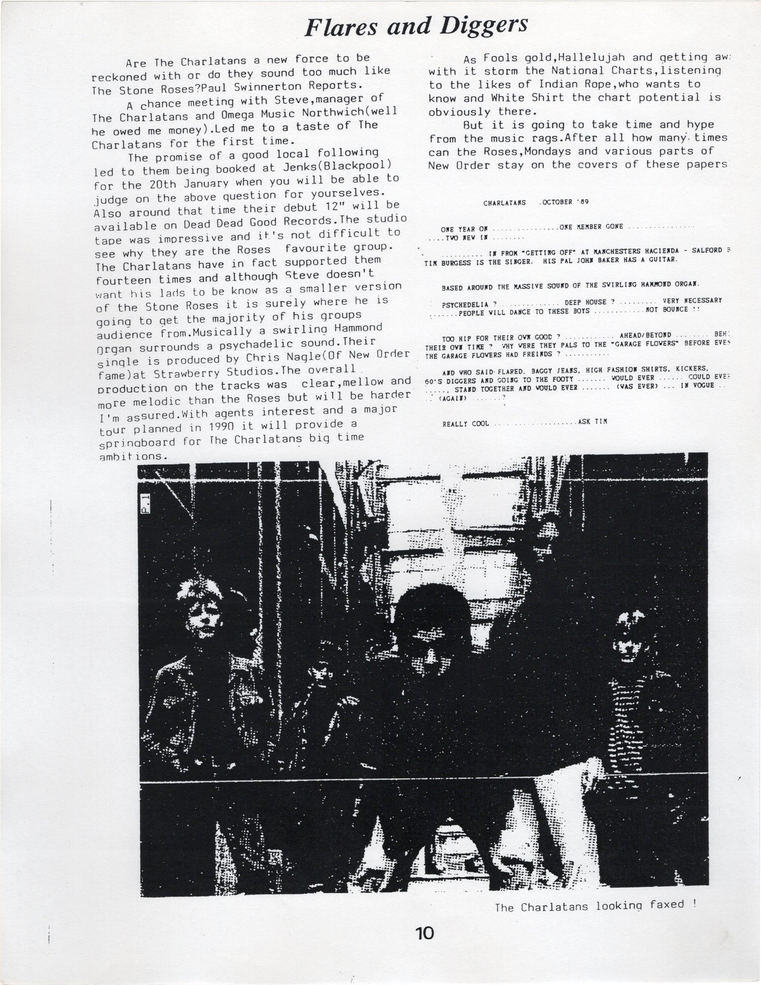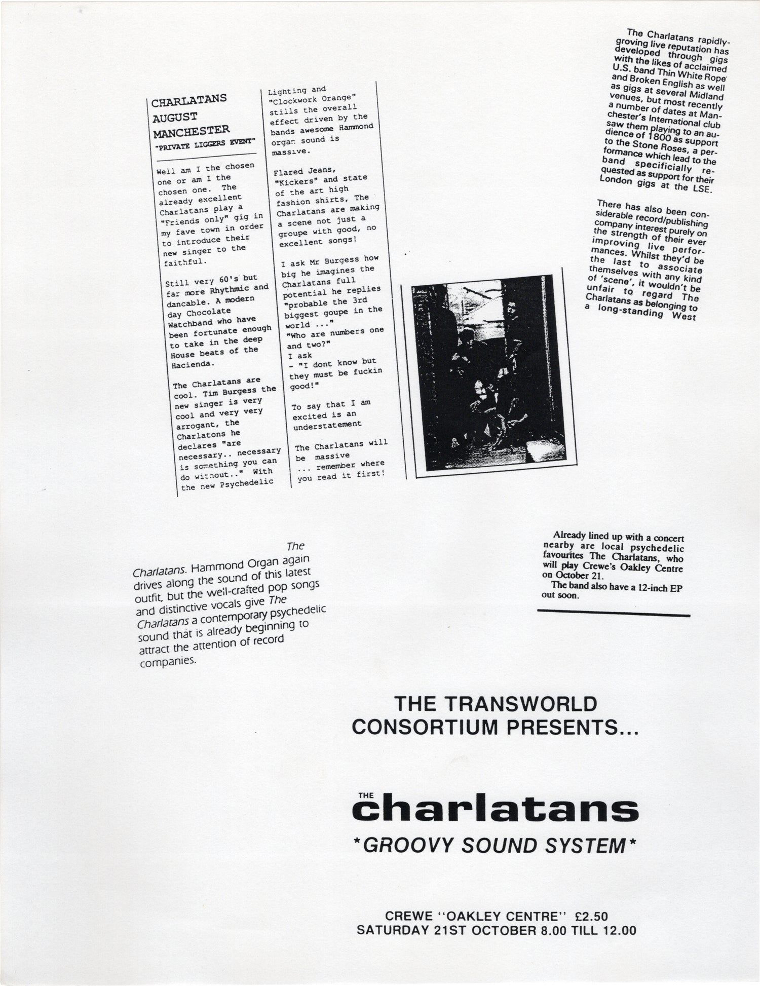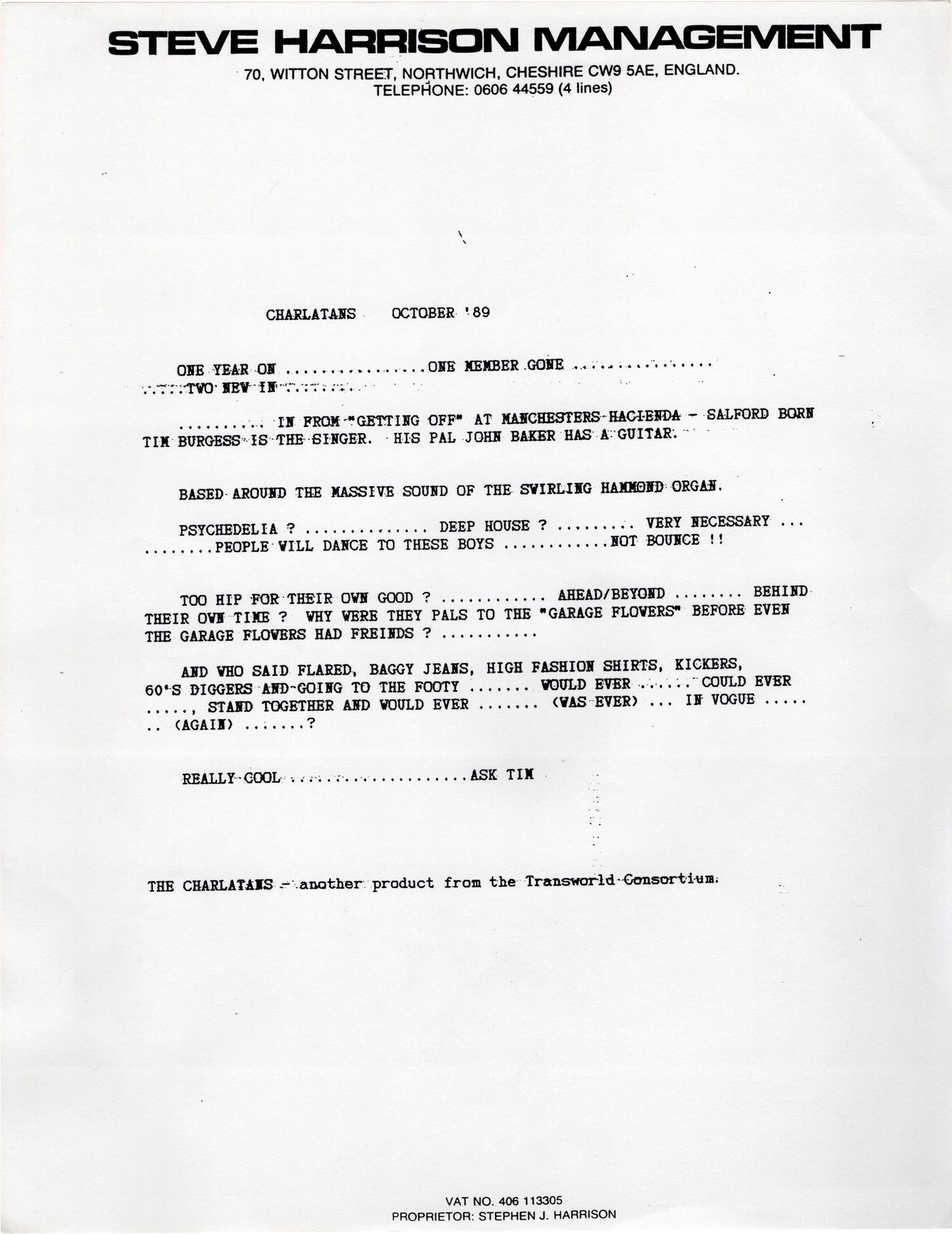 The "October '89" press release from Steve Harrison announced the addition of guitarist John Baker and singer Tim Burgess, who had replaced singer and guitarist Baz Ketley, who had left an early incarnation of the band in the late summer of 1989, and notes the band being "another product from the Transworld Consortium," an early incarnation of Harrison's management agency, which appears to have only been briefly used for The Charlatans in 1989-90.