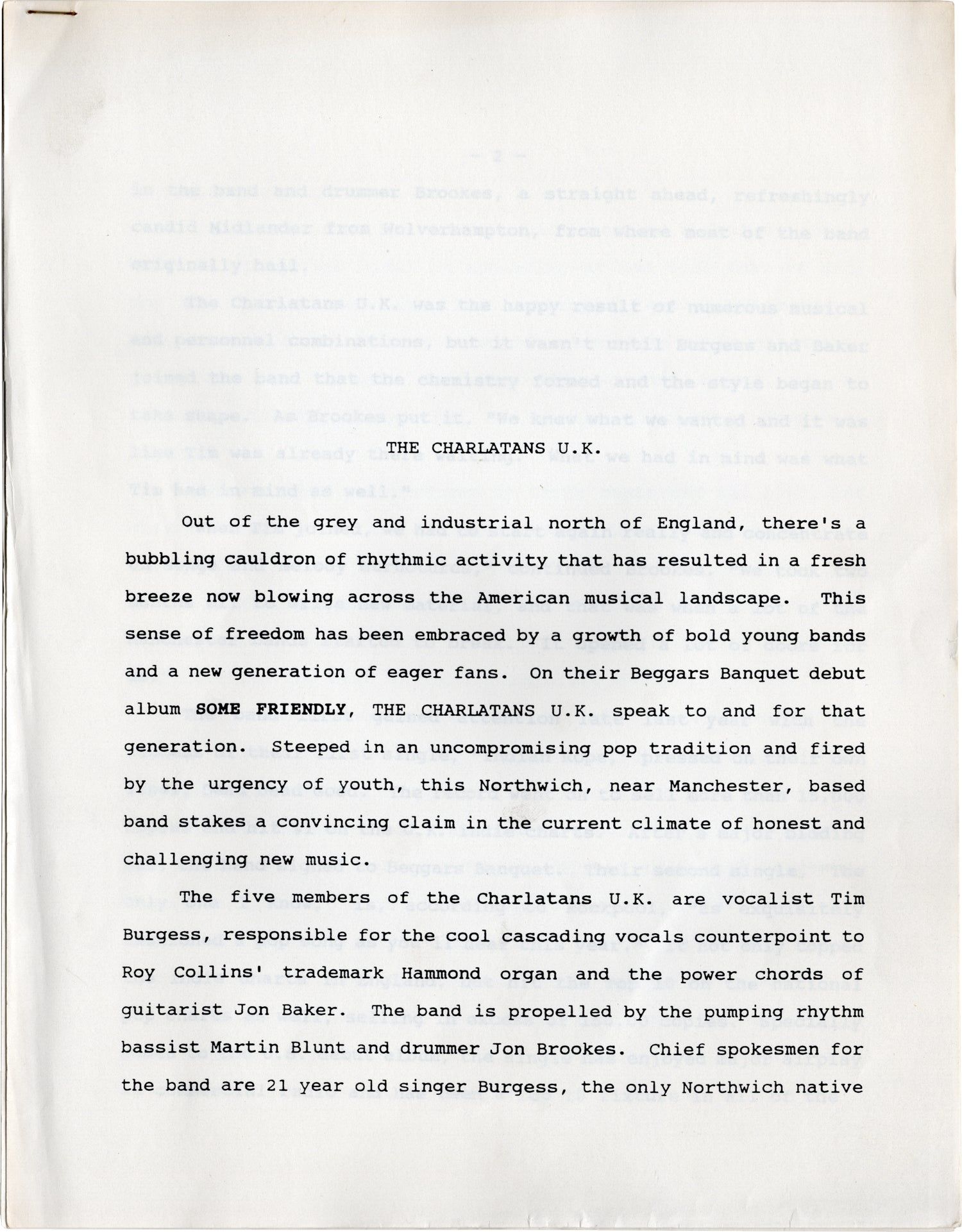 The six page biography, undated, was written after the release of their first two singles, "Indian Rope" and "The Only One I Know" (both released in early 1990), to introduce the band to the US market and in promotion of the upcoming October 1990 "Some Friendly" release, and includes a Xerographically reproduced copy of the first page of a New Musical Express article "Charlatans Aesthetic," dated September 15, 1990.