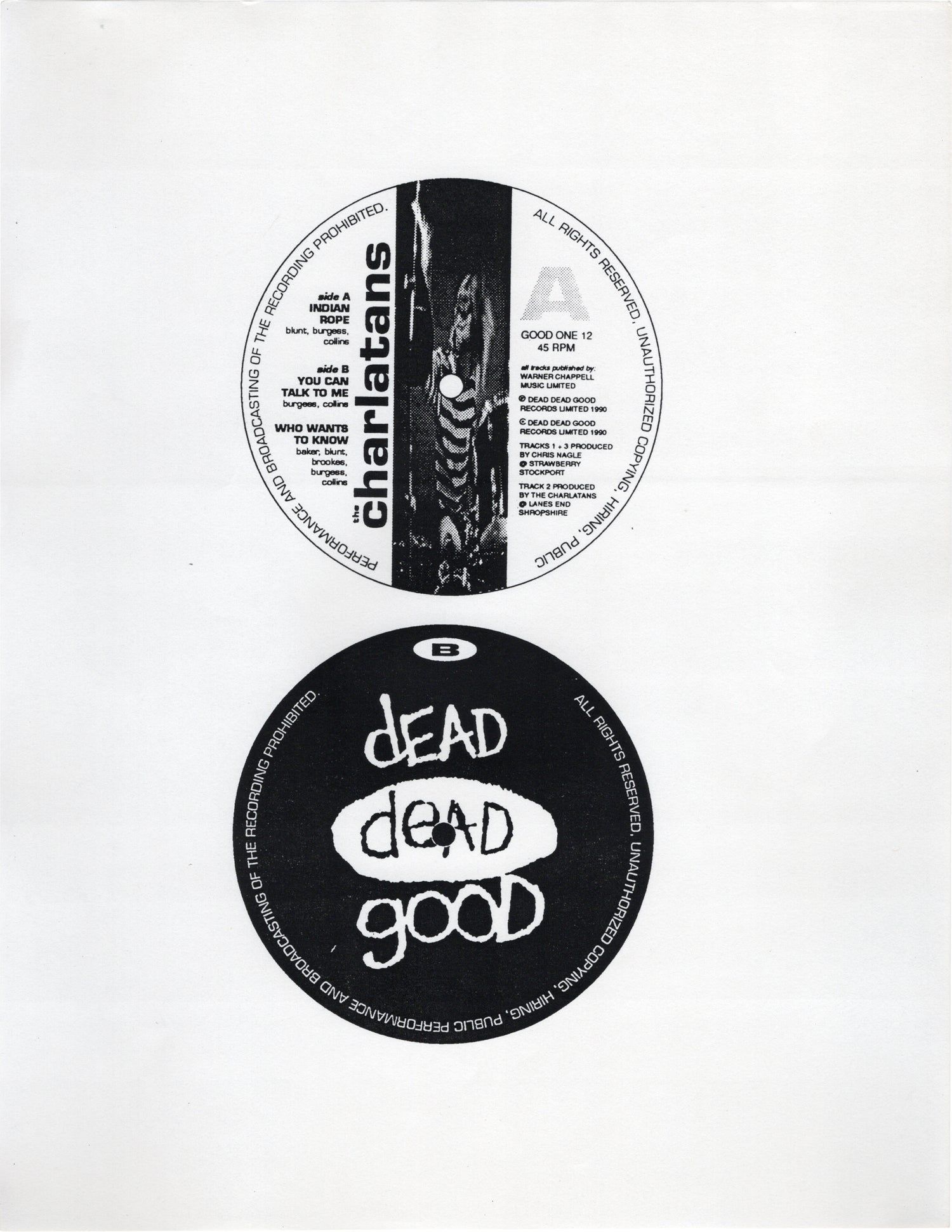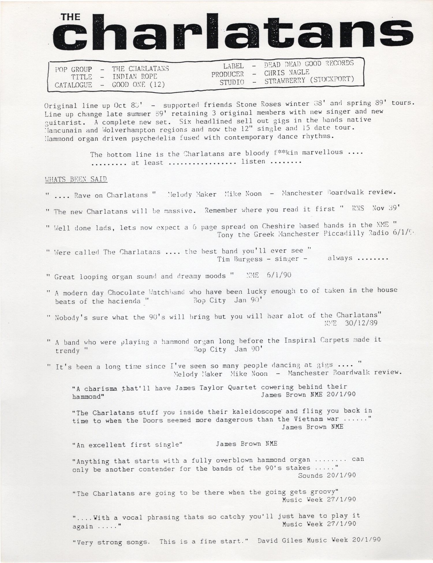 The Xerographically reproduced material in the archive includes: A full page press release announcing the release of their first single, the independently released "Indian Rope" in January 1990. Proposed label art for the "Indian Rope" single and their record label Dead Dead Good Records. A full page graphic for The Charlatans from Transworld Consortium. An image of "The Charlatans / Smash Hits / Poster," released in June 1990. And articles, reviews, music charts, and concert announcements from publications such as New Music Express, Melody Maker, The Sun, Sounds, Ears, Bop City, Lime Lizard, Daily Mirror, Evening Sentinel, Manchester Evening News, and Bolton Evening News, all dating between October 1989 and September 1990.