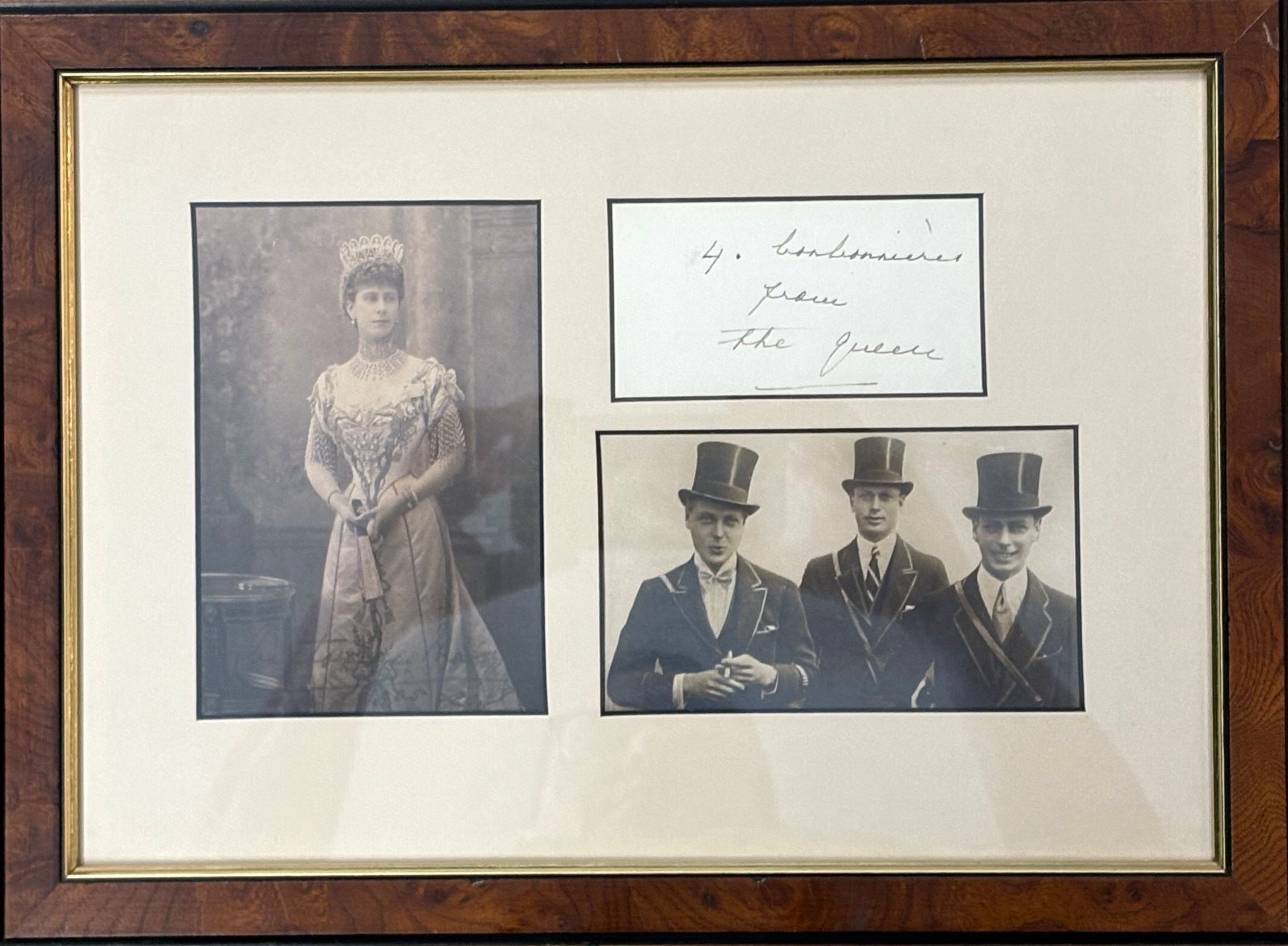 framed. near fine. Photograph of Mark of Teck. Signed "Victoria Mary 1905". Framed with a card likely written some years later, inscribed "from the Queen". Also framed is a photograph of her sons (date unknown). Please inquire for more information.