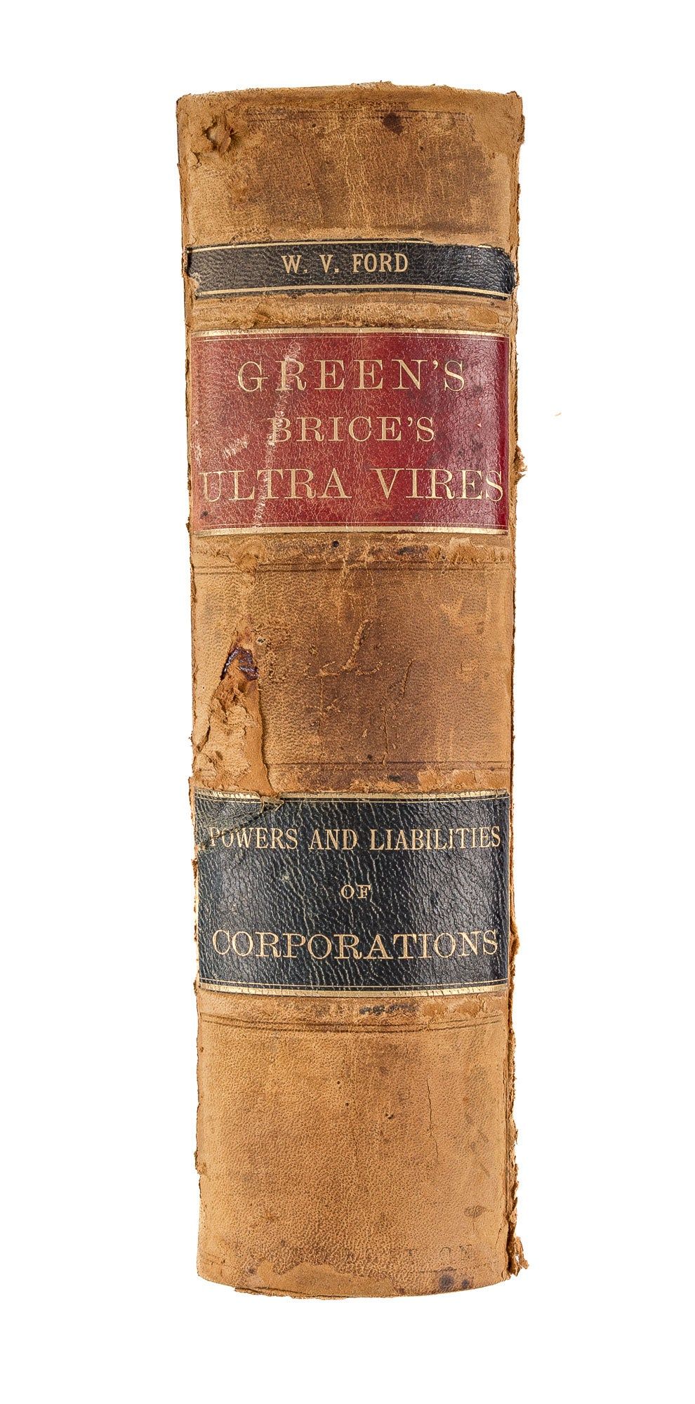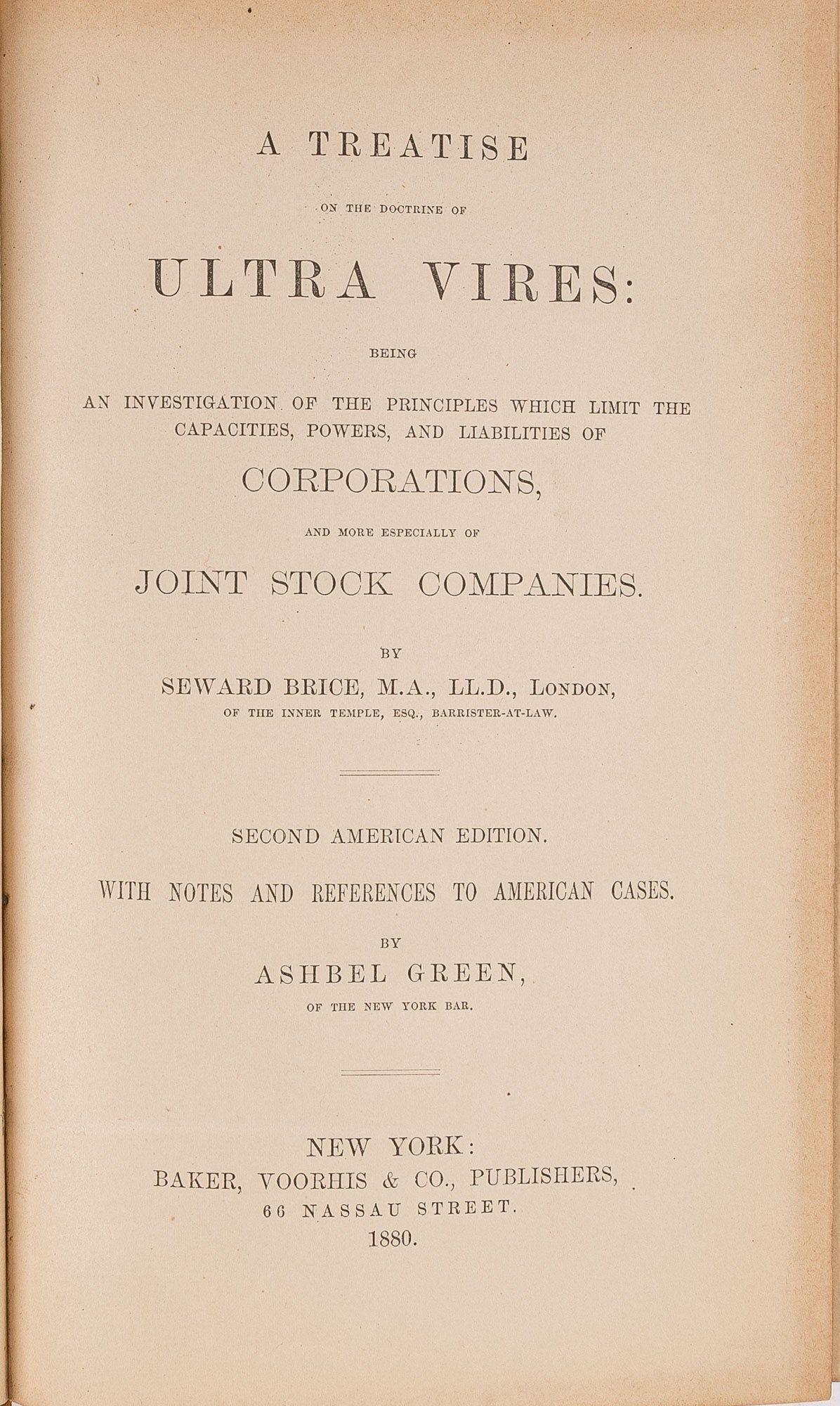 1880. Brice, Seward; Green, Ashbel. A Treatise on the Doctrine of Ultra Vires: Being an Investigation of the Principles Which Limit the Capacities, Powers, and Liabilities of Corporations, And More Especially of Joint Stock Companies. New York: Baker, Voorhis & Co., 2nd American edition, with notes and references to American cases, by Ashbel Green. 1880. lxvi, 858 pp. Octavo (6" x 9"). Contemporary tan cloth. Red and black spine lettering pieces. Light rubbing to boards, light wear to extremities, front joints starting but secure, hinges cracked but secure. Previous owner's signature to front pastedown. A solid copy of an uncommon title. $250. * Seward Brice's (1846-1914) Treatise on the Doctrine of Ultra Vires (1874) was written for practitioners of corporate law and covers the role of the doctrine in corporate transactions, along with its impact on the rights and liabilities of corporations. Utra vires, Latin for "beyond the powers," relates to actions outside the legal authority of a corporation. The treatise summarizes major cases in both American and English law. (Scholarship.law.wm.edu).