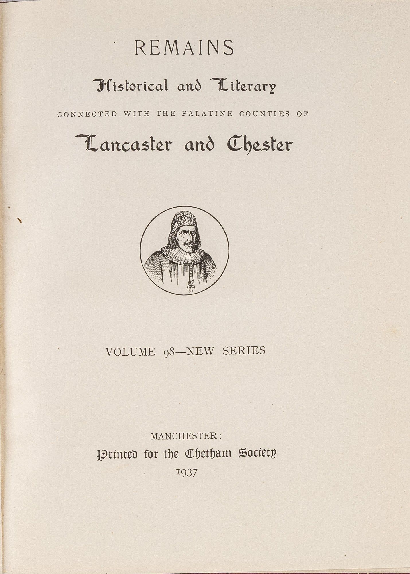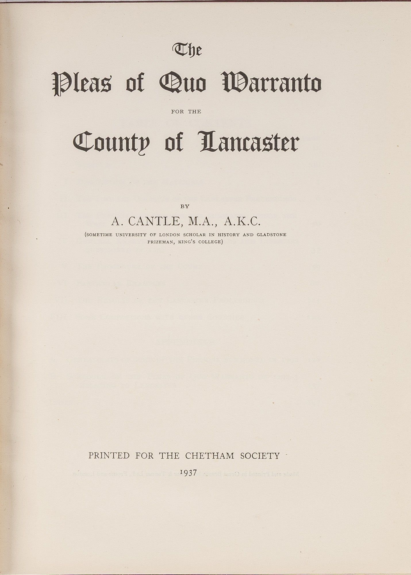 1937. Cantle, Albert. The Pleas of Quo Warranto for the County of Lancaster. Manchester, Chetham Society, 1937. xvi, 178, v pp. Publisher's original decorative burgundy cloth, with gilt stamped spine. Light shelfwear, spine faded. Internally clean. A very good copy. $45. * Remains, Historical and Literary, Connected with the Palatine Counties of Lancaster and Chester, New Series - Vol. 98.