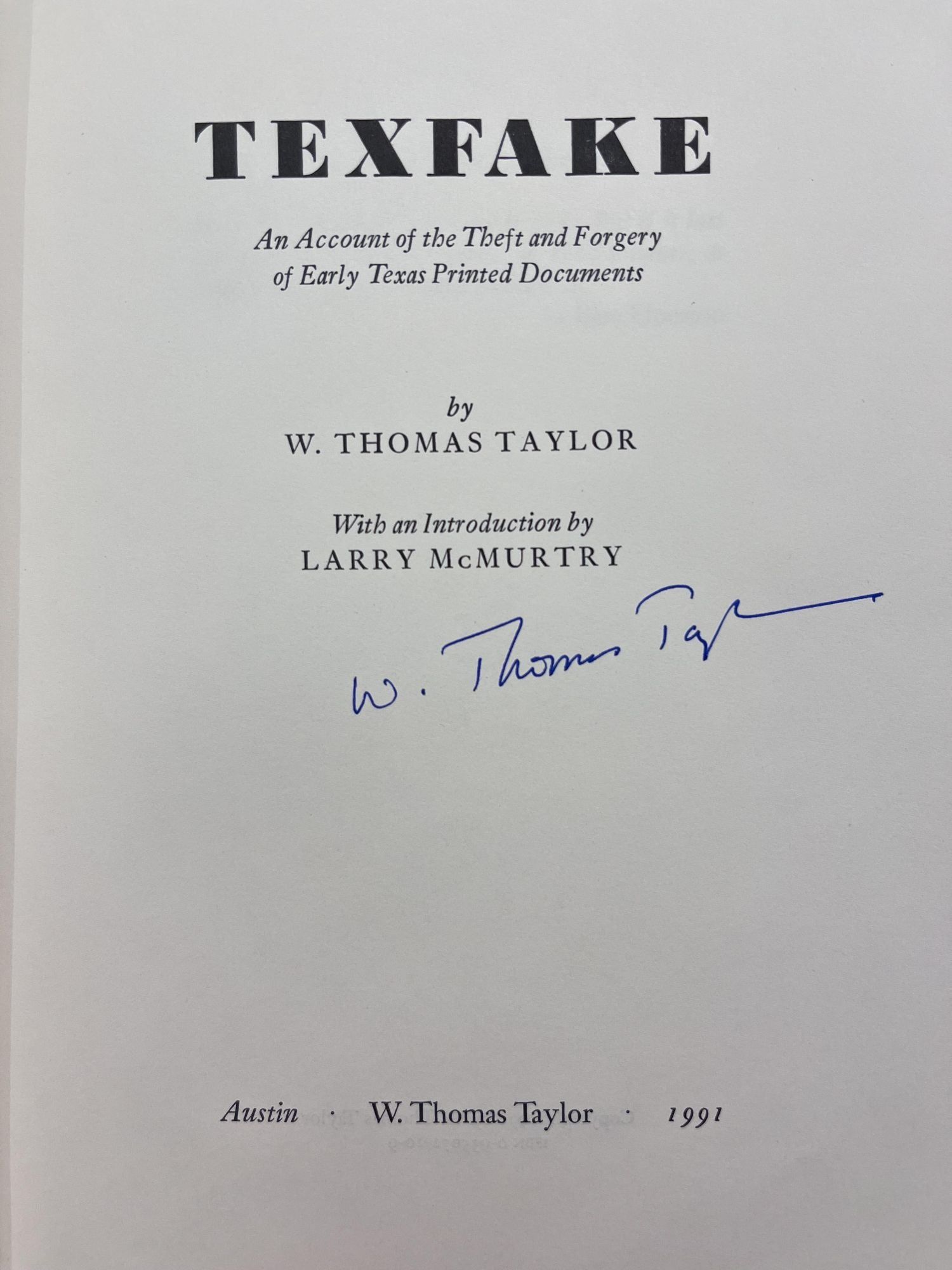Austin, Texas: W. Thomas Taylor, 1991. First edition. Hardcover. Near Fine. SIGNED. 158 pp. Quarto [26.2 cm]. 1/4 orange cloth over illustrated paper over boards. Title gild on the back strip. Toning on the back strip and 1" of upper portion of cloth on both boards. No dust jacket as intended. One of seventy copies specially bound and signed by the author, unnumbered. Letterpress printed. "Texfake is the result of three years of investigation into the scandal surrounding the 1988 discovery of forged copies of the Texas Declaration of Independence. The New York Times, Texas Monthly, and The New Yorker all carried articles on the affair, but this is the definitive account of the history and impact of the Texas forger and his wares." from the publisher.