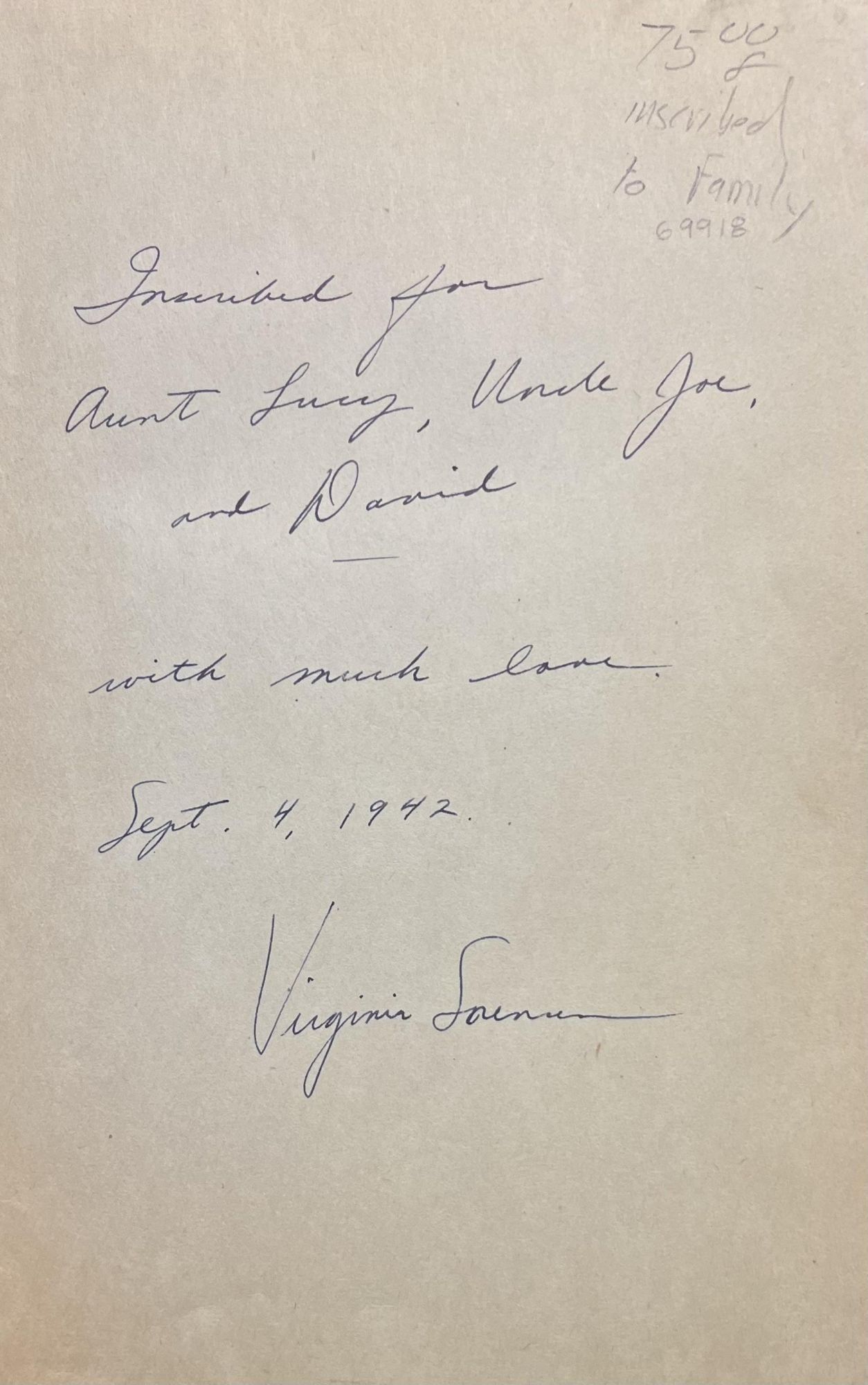 New York: Alfred A. Knopf, Inc, 1942. Later printing. Hardcover. Good +. SIGNED. 427 pp. Octavo [21.7 cm]. Beige cloth over boards. Title is printed on spine and front cover in blue and black. Includes Virginia Sorensen's inscription to family on front endpaper. Head of textblock dyed blue. Deckled edges. Minor stain on back cover. Corners and spine ends are bumped. This copy includes an inscription to the author's family from Virginia Sorenson.
