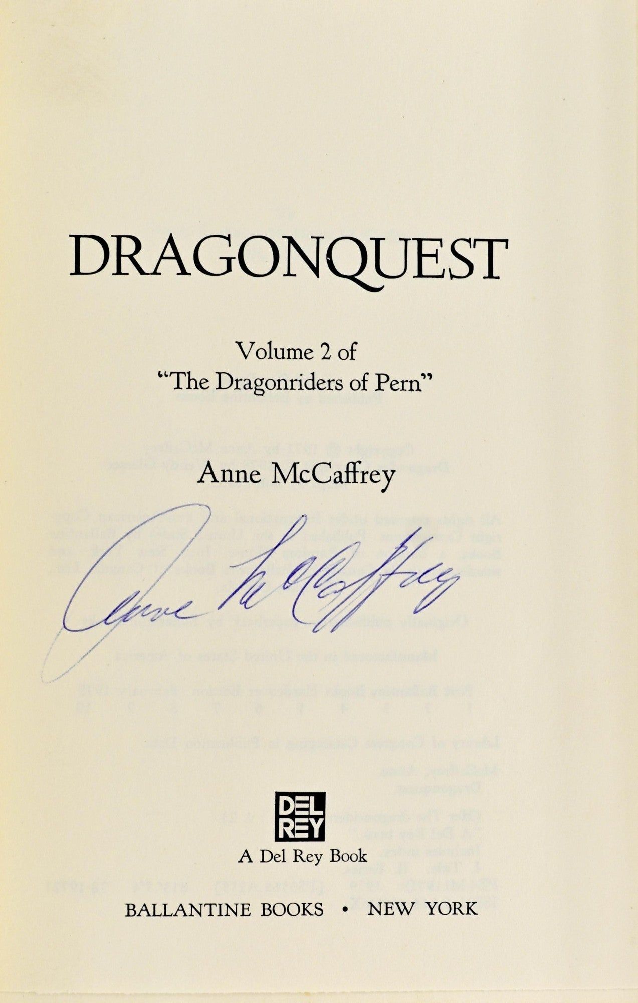 New York: Ballantine Books | Del Rey, 1979. First Edition. Hard Cover. Very Good binding/Very Good dust jacket. Large octavo; in publisher’s blue cloth binding backed in tan cloth, with a dustjacket which has not been price-clipped. this First Edition copy is signed on the title page by Ms. McCaffrey; there are small places of loss to the jacket at the folds of the flaps.~~This is the first hardcover edition. Very Good binding / Very Good dust jacket.