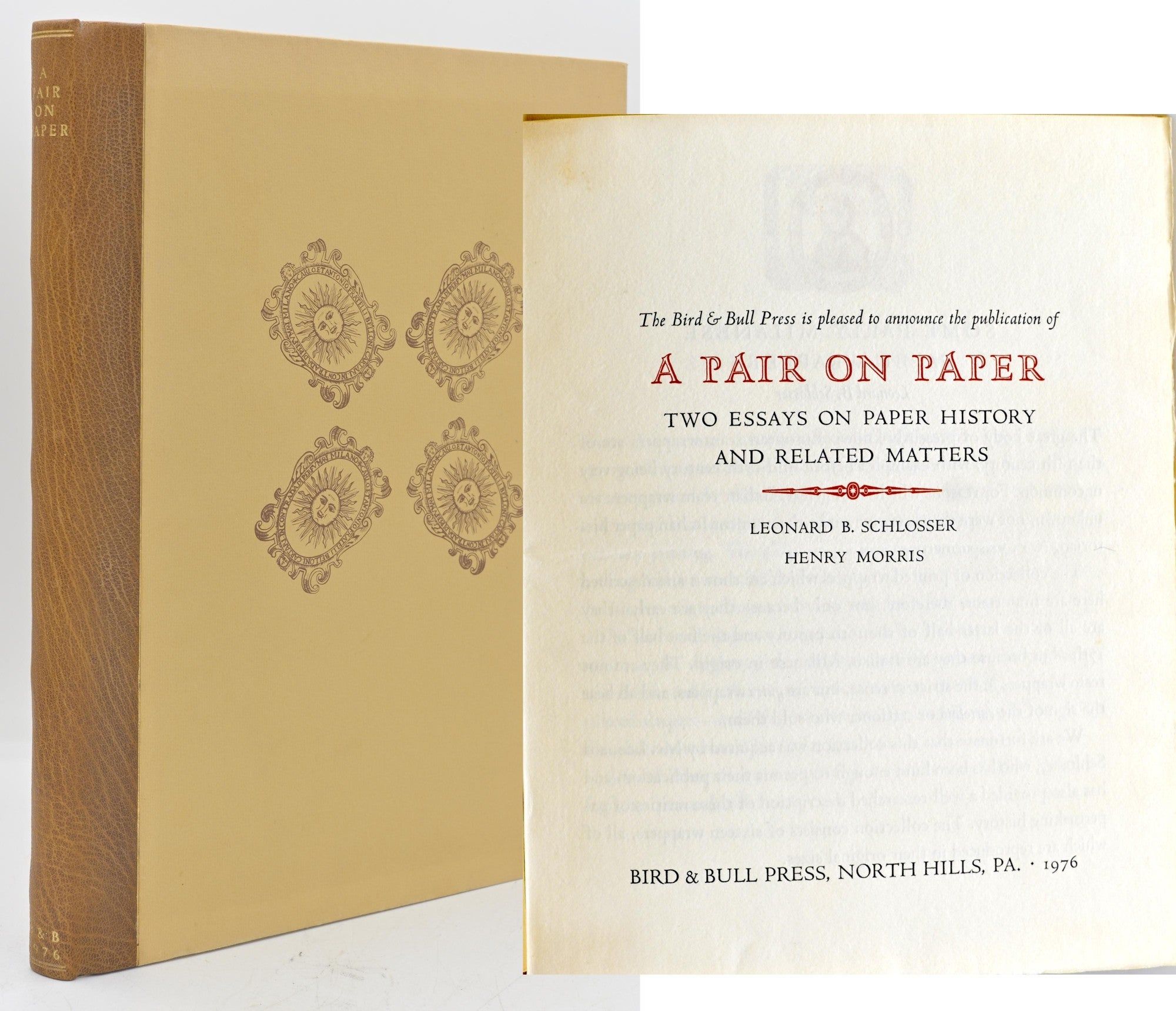 North Hills, PA: Bird & Bull Press, 1976. Quarter Leather. Near Fine binding. Taylor, Morris. Twenty-One A17. Quarter brown morocco over printed tan paper boards with illustrations of four quire wrappers printed on the upper board; spine lettered horizontally in gilt; 70, [1] pages, illustrated.~~More Adventures in Papermaking by Henry Morris [7-43]; Some Early Milanese Paper Wrappers by Loenard B. Schlosser [44-68].~~A section of illustrations are printed offset, [17-28]; a pair of 50 sol notes are in a pocket tipped on p. [28]; sixteen illustrations of Italian Quire wrappers “printed on specially made toned and flecked sheets which are suggestive of the papers originally used” on pages [53-68].~~This copy is trace of fade to the edges of the boards; With prospectus laid in.~~. Near Fine binding.