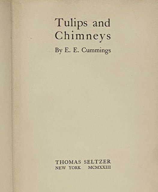 New York: Thomas Seltzer, 1923. First Edition. Hard Cover. Good/No Jacket. First edition (Firmage A3a). Corners rubbed and exposed, spine toned and just beginning to split along rear joint, owner bookplate with the surname Schubert on front endpaper. Includes acetate jacket (probably added later) with some loss from corners. 1923 Hard Cover. 125 pp. Beige cloth spine with paper label, brown paper over boards. Author's first poetry collection, and second book overall (after The Enormous Room), published before he did away with the capitalization and punctuation in his name. "Cummings expressed ideas through new grammatical usage: he employed verbs as nouns, and other locutions as new linguistic creations (for example, 'wherelings, whenlings / daughters of ifbut offspring of hopefear / sons of unless and children of almost / never shall guess'). He indulged in free play with punctuation and capitalization. Lowercase letters were the rule; capitals were used only for special emphasis; punctuation marks were omitted for ambiguous statement; others were introduced for jarring effects. His use of the lowercase letter 'i' not only became a well-known means of self-reference in his work, but also reflected a role that he created for himself: he was the underling, the unnoticed dreamer, the downtrodden one, the child in the man; yet by asserting his individuality in this way, he thrust himself forward and established a memorable persona. His first manuscript book of poems, 'Tulips & Chimneys,' was a gathering of work in traditional verse forms as well as in his newest unconventional forms of expressiveness. It included lush lyrics from his Harvard years, tender love poems, erotic epigrams, sonnets (some crammed with literary allusion, others merely attempting to depict ordinary scenes of life - on city streets, in cafes, in rooming houses), celebrations of the beauties of the natural world, and harsh satires directed at politicians, generals, professors, the clergy, and national leaders. The publishing world was not yet ready for some of Cummings's poems about drunks, prostitutes, Salvation Army workers, gangsters, or bums. Thus, the original version of Cummings's manuscript did not survive the forbidding selectivity of editors, and it eventually emerged as three books: Tulips and Chimneys (1923), XLI Poems (1925), and (privately printed) & (1925)." - Dictionary of National Biography