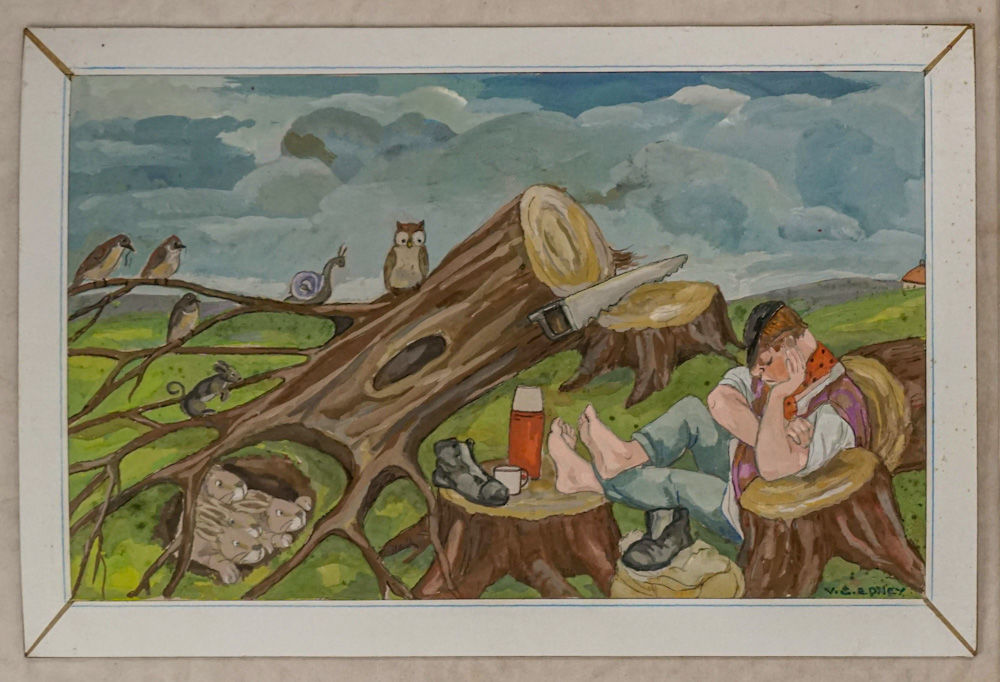 n.d. Original Art. Near Fine. V. G. Edney. Group of 9 ORIGINAL WATERCOLOR ILLUSTRATIONS on board, each about 10" x 15" and SIGNED by the artist. We were not able to find anything about the artist, but these are skillful enough in a folksy way to indicate that the artist might have been a professional and that these were for possible publication, possibly for a children's book. Subjects are mainly men working various jobs, but three of the illustrations are somewhat more dreamy. All of them are wrapped in clear plastic, as shown in the images.