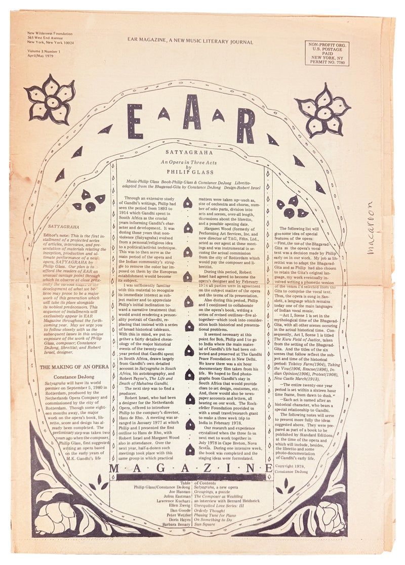 Single issue of this uncommon newspaper devoted to music culture and sound poetry. Contents include a portion of Philip Glass's opera "Satyagraha" along with Constance DeJong's short essay on the making of the opera.