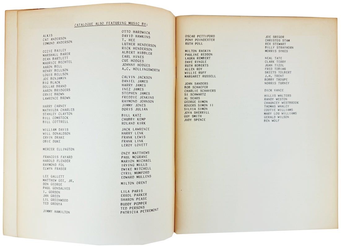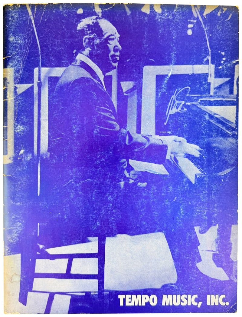 New York: Tempo Music, Inc, 1955. Very Good. New York: Tempo Music, Inc., [ca 1960]. First Edition. Small quarto; [40]pp. Photo-illustrated wraps. Wear and toning to edges of wraps; binding sound; ghost of a sticker to preliminaries, else unmarked; Very Good. Catalog of artists and songs under the umbrella of Tempo Music, Duke Ellington's music publishing company which was at the time run by his sister Ruth. Includes a list of artists with the bulk of the text devoted to song titles. We locate no copies in OCLC; date based on Ellington photo to cover and the featured artists' years of activity.