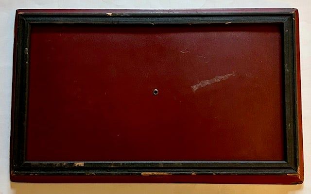 Colonial Sales Corporation, 1932. Ephemera. Very Good. 1932 framed silver tray (15 1/2" wide x 8 1/2" tall), wonderfully illustrated, very Art Deco in feel. Designed as a bartender's guide to mixing drinks, with 2 separate pinwheels (still functioning very well) revealing the ingredients of a particular drink through 4 small dye-cut squares. Essentially a stylish bartender's cheat sheet. And no wonder, given that some of the drinks (such as "The Bosom Caresser", "Between the Sheets", "The Apple Jack Rabbit", "The Charley Horse", "The Side Car" and "The Side Swipe", for example) must have stumped all but the very most seasoned bartenders. All told, 20 numbered cocktails are listed, the elusive ingredients to each revealed through turning the pinwheels and spying the 4 squares. The condition has held up very nicely to boot. The silver cardboard is bright and relatively clean (especially given its age and undoubted use), the original brown wooden frame lightly-scuffed but still very presentable. A charming Prohibition-era, Art Deco curio.