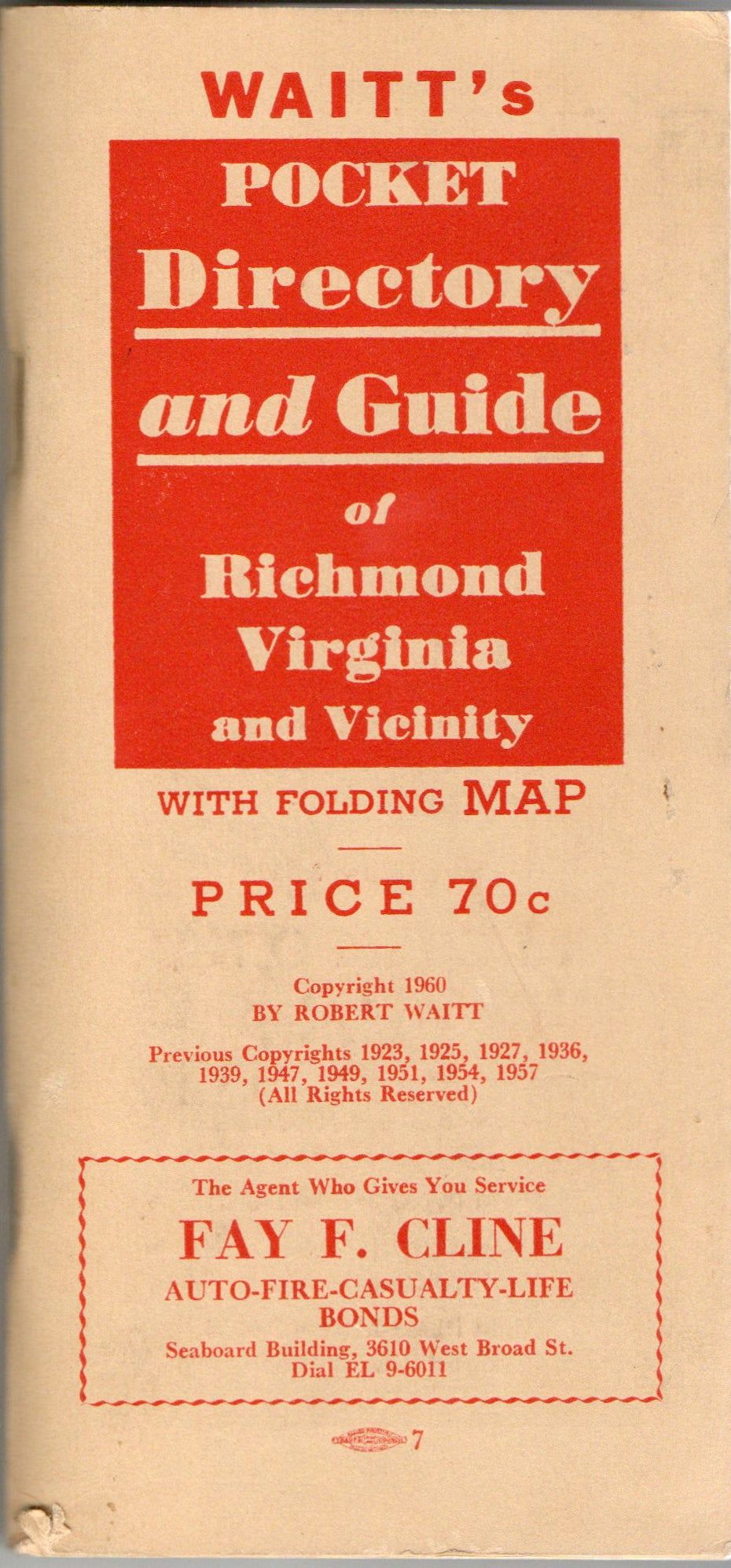 Waitt Publications, 1960. 6 1/2” x 3” Waitt’s Pocket Directory and Guide of Richmond Virginia and Vicinity, with folding map. First published in 1923, this 70 cent, 175pp guide was a complete A-Z guide filled with advertisements from local businesses. A 20 1/2” x 17” folding map is attached at the back, showing a June 1957 map of Richmond by the Department of Public Works. Not found elsewhere. Very good.