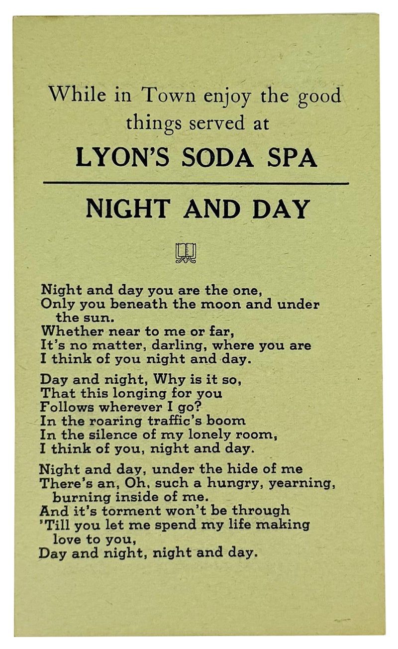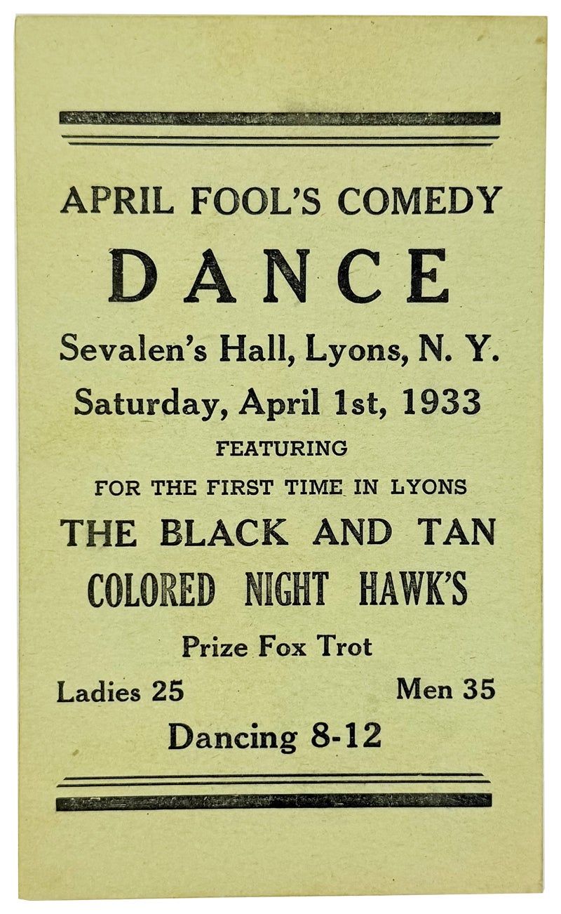 Lyons, NY: Sevalen's Hall, 1933. Very Good +. Lyons, NY: Sevalen's Hall, 1933. Broadsheet palm card; printed promotional card (12.8x7.5cm) for an "April Fool's Comedy Dance" in the New York Hamlet, featuring the Colored Night Hawk's [sic] band; advertisements for Lyons Soda Spa to verso. Light rubbing and a couple smudges; Very Good or better.
