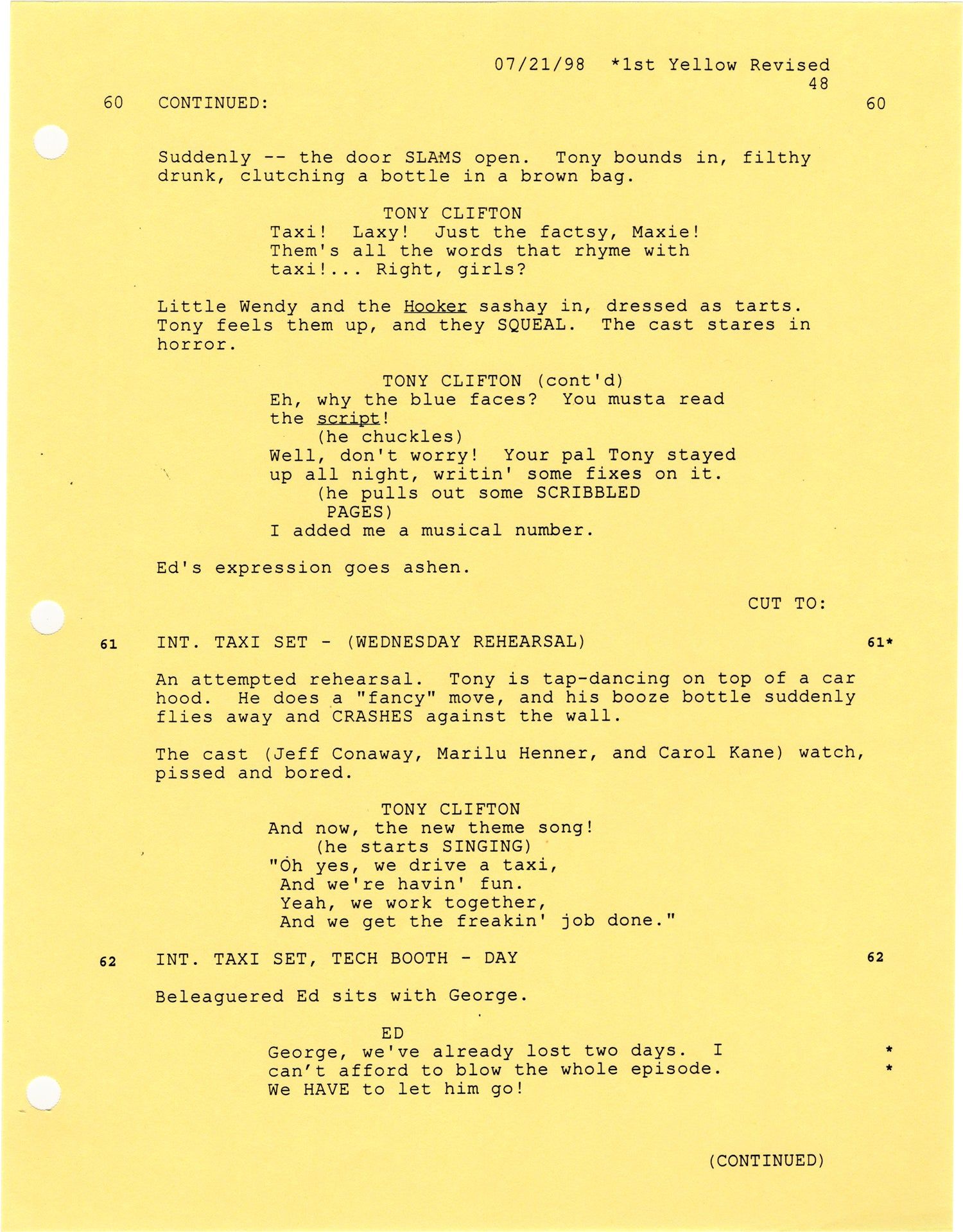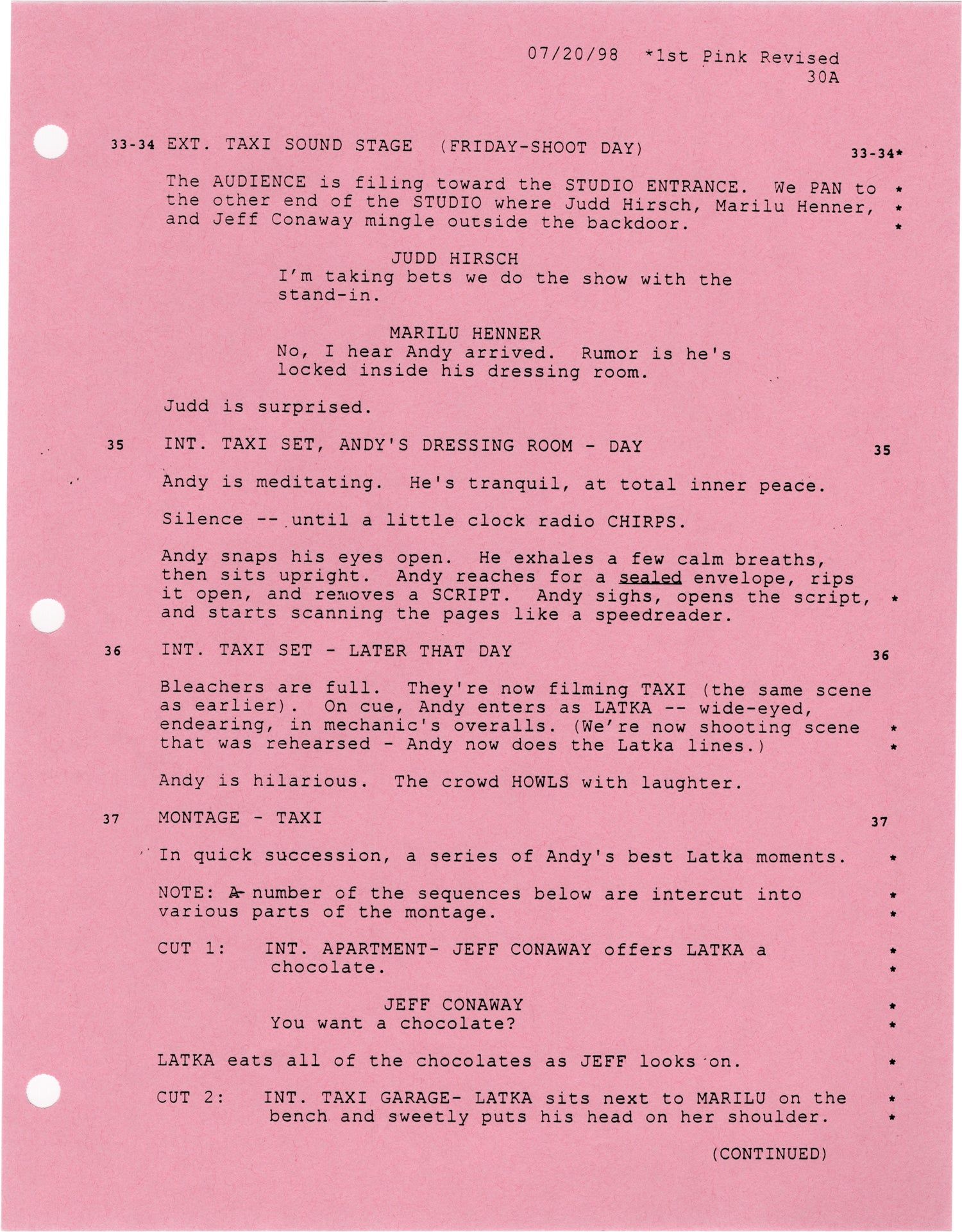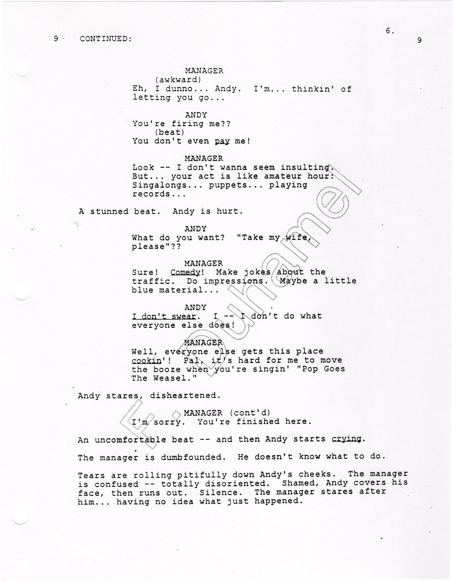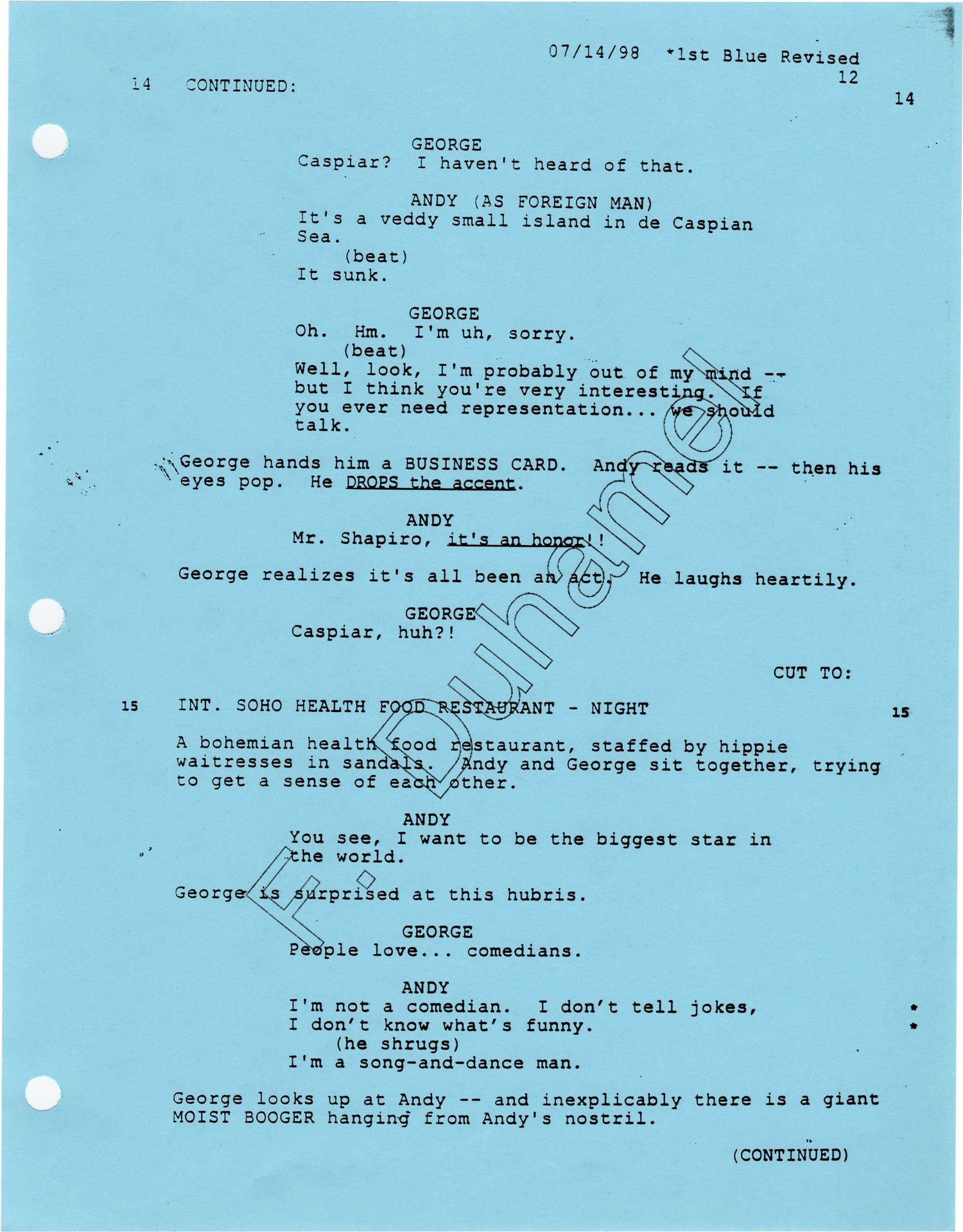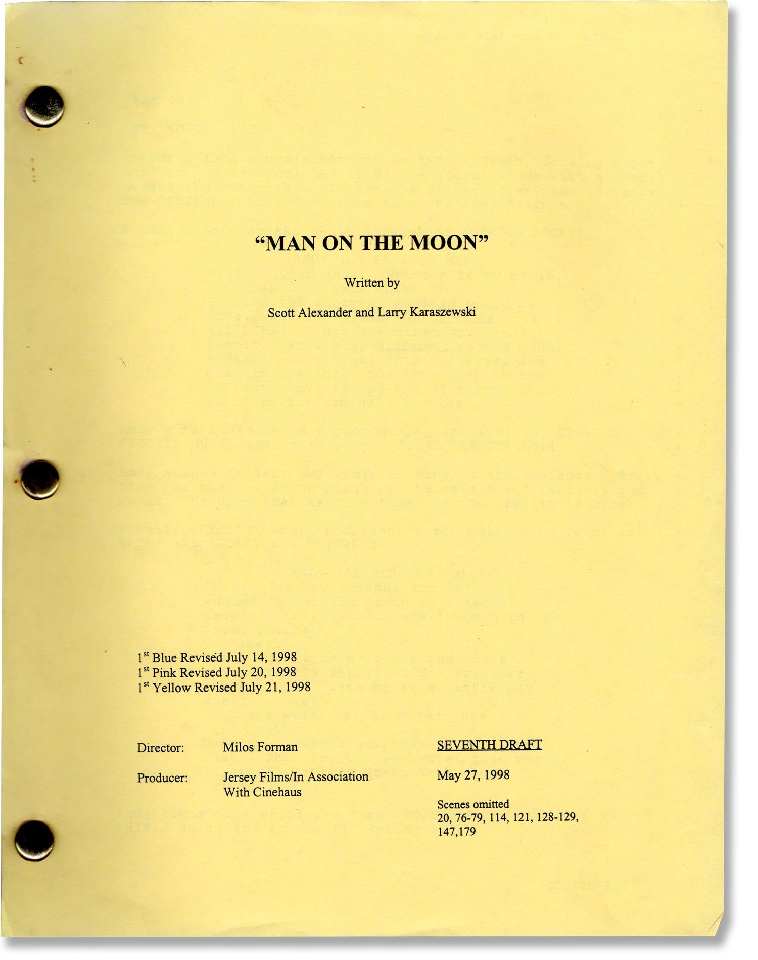 Self wrappers. Title page present, dated May 27, 1998, noted as SEVENTH DRAFT, with credits for screenwriters Scott Alexander and Larry Karaszewski and director Milos Forman (sic). 140 leaves, with last page of text numbered 130. Xerographic duplication, rectos only, with yellow, blue, and pink revision pages throughout, dated variously between May 28 and July 21, 1998. Pages Near Fine, bound with three gold brads.