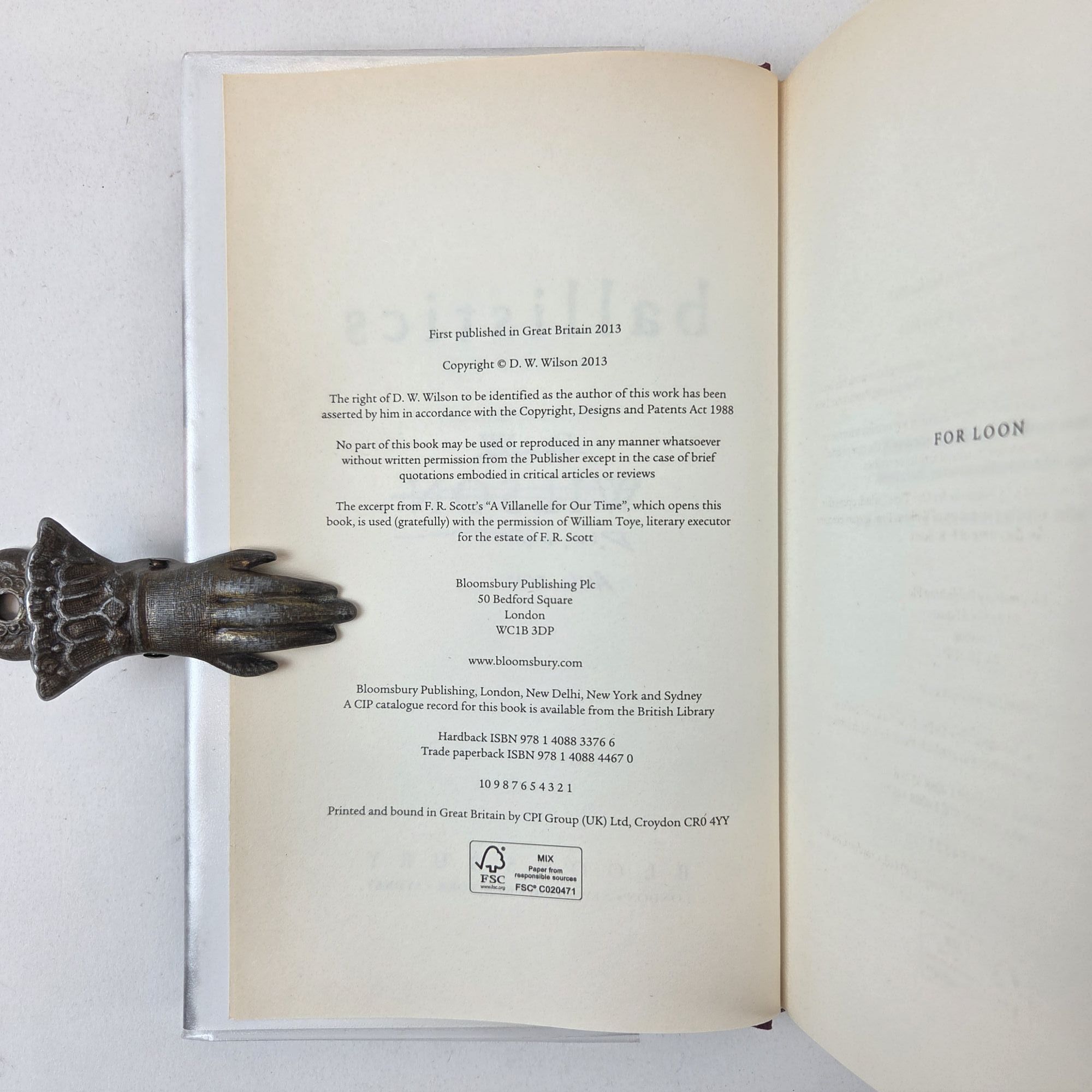 London, UK: Bloomsbury, 2013. First Edition, First Printing. Hardcover. Octavo, 384 pages. In Very Good condition with Very Good condition dust jacket. Spine is white with black lettering. Dust jacket protected by mylar covering, price uncut: "£12.99" on front flap. Boards have mild shelving wear along spine head and tail. Textblock has moderate age-toning along edges and throughout interior. Signed flat and dated "Aug 2013" on title page by D.W. Wilson. Shelved Room C overflow. 1404868. Special Collections.