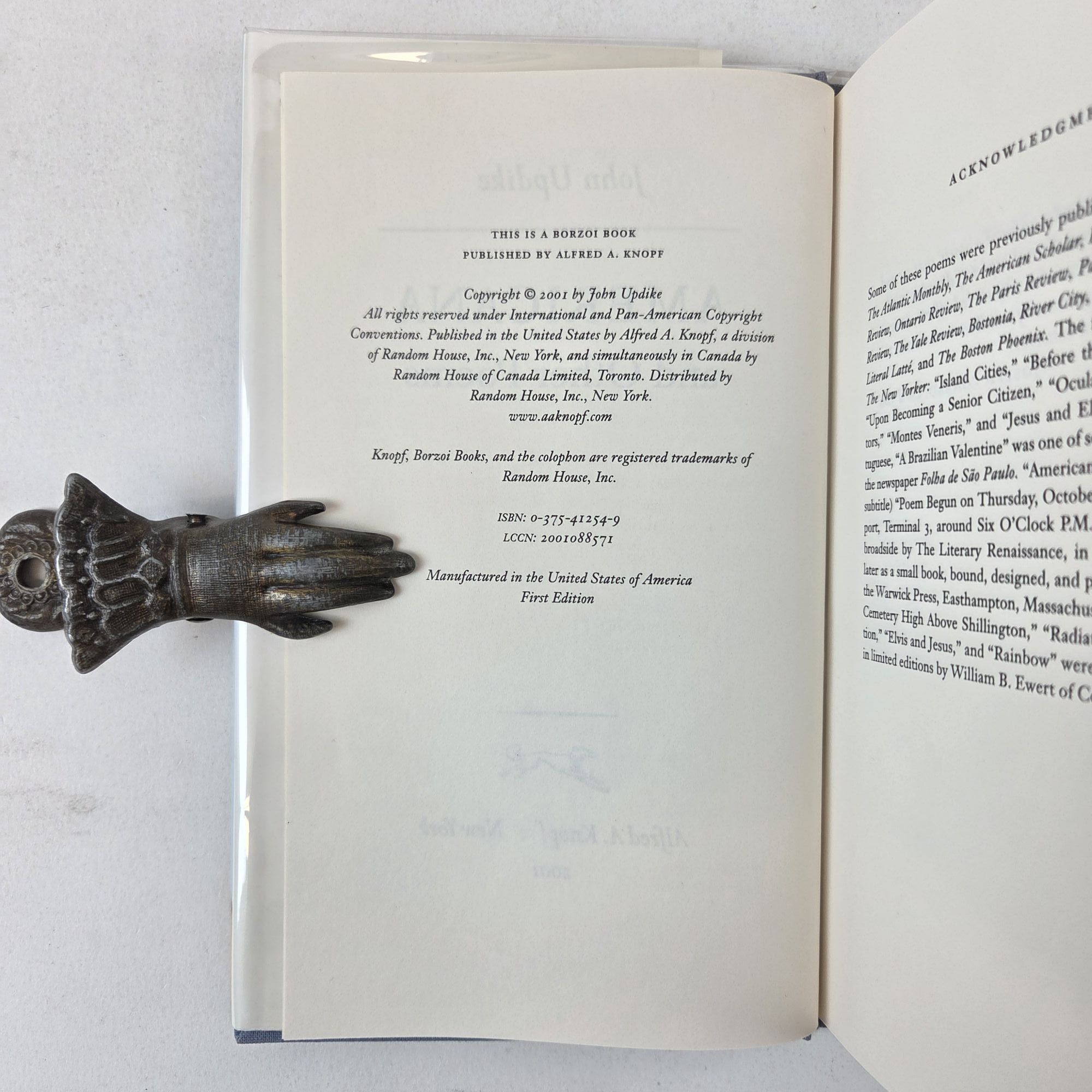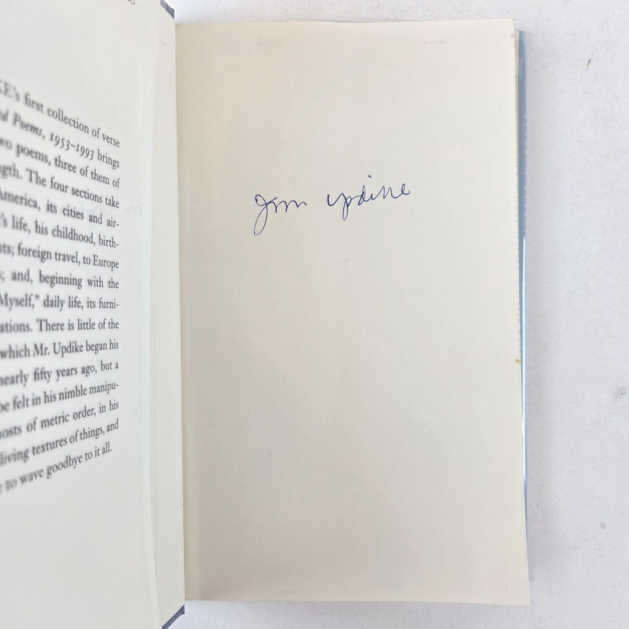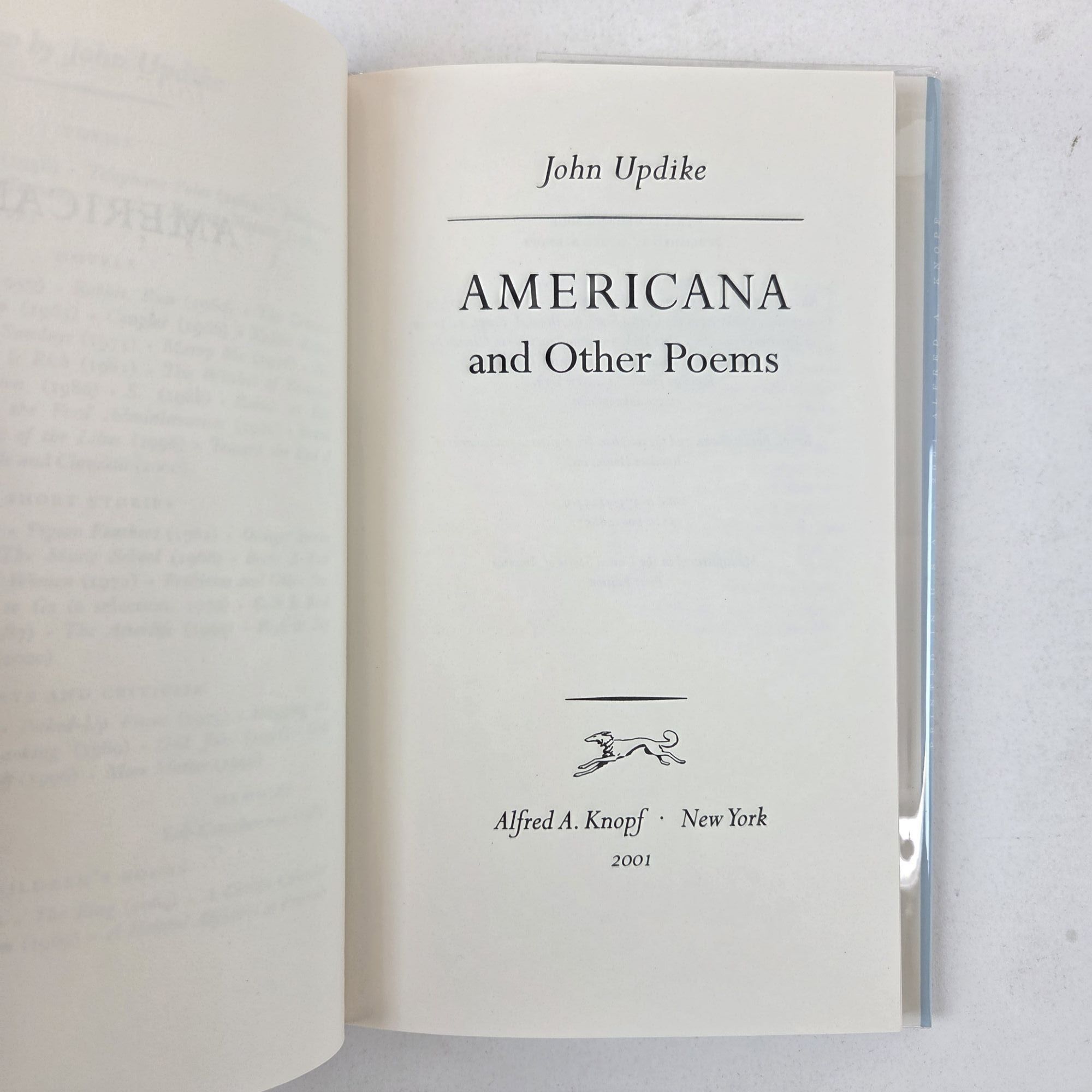 New York, New York: Alfred A. Knopf, 2001. First Edition, First Printing. Hardcover. Small octavo, 95 pages. In Very Good condition with Very Good condition dust jacket. Spine is faint blue and camel with dark red and white lettering. Dust jacket protected by mylar covering, price uncut: "$23.00" on front flap, has moderate sun-fading along spine. Boards fully bound in publisher's periwinkle cloth, have mild shelving wear along spine tail and moderate sun-bleaching along spine tail and tail edges. Textblock head edge dyed butter yellow. Signed flat on title page by John Updike. Shelved Room C overflow. 1404891. Special Collections.