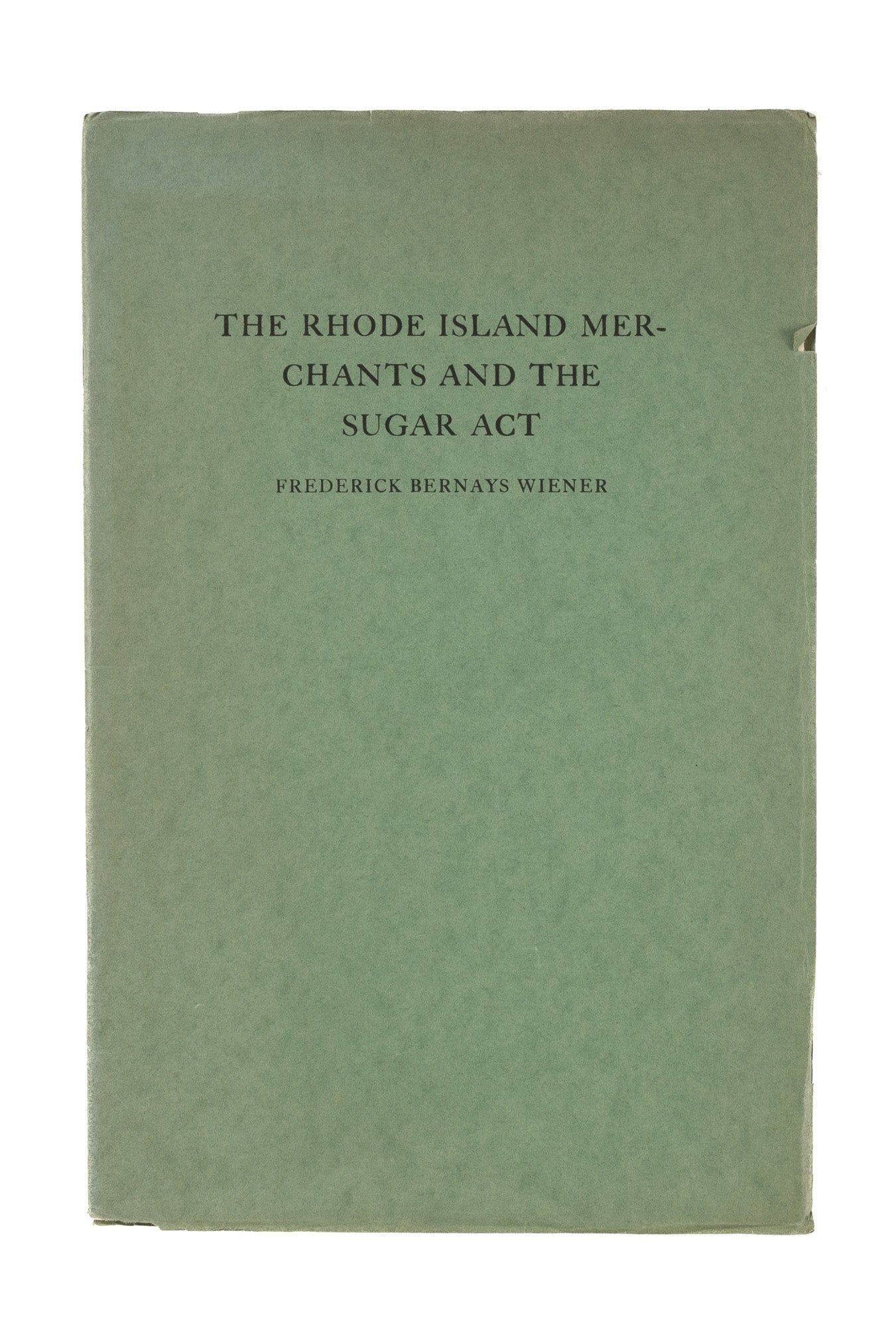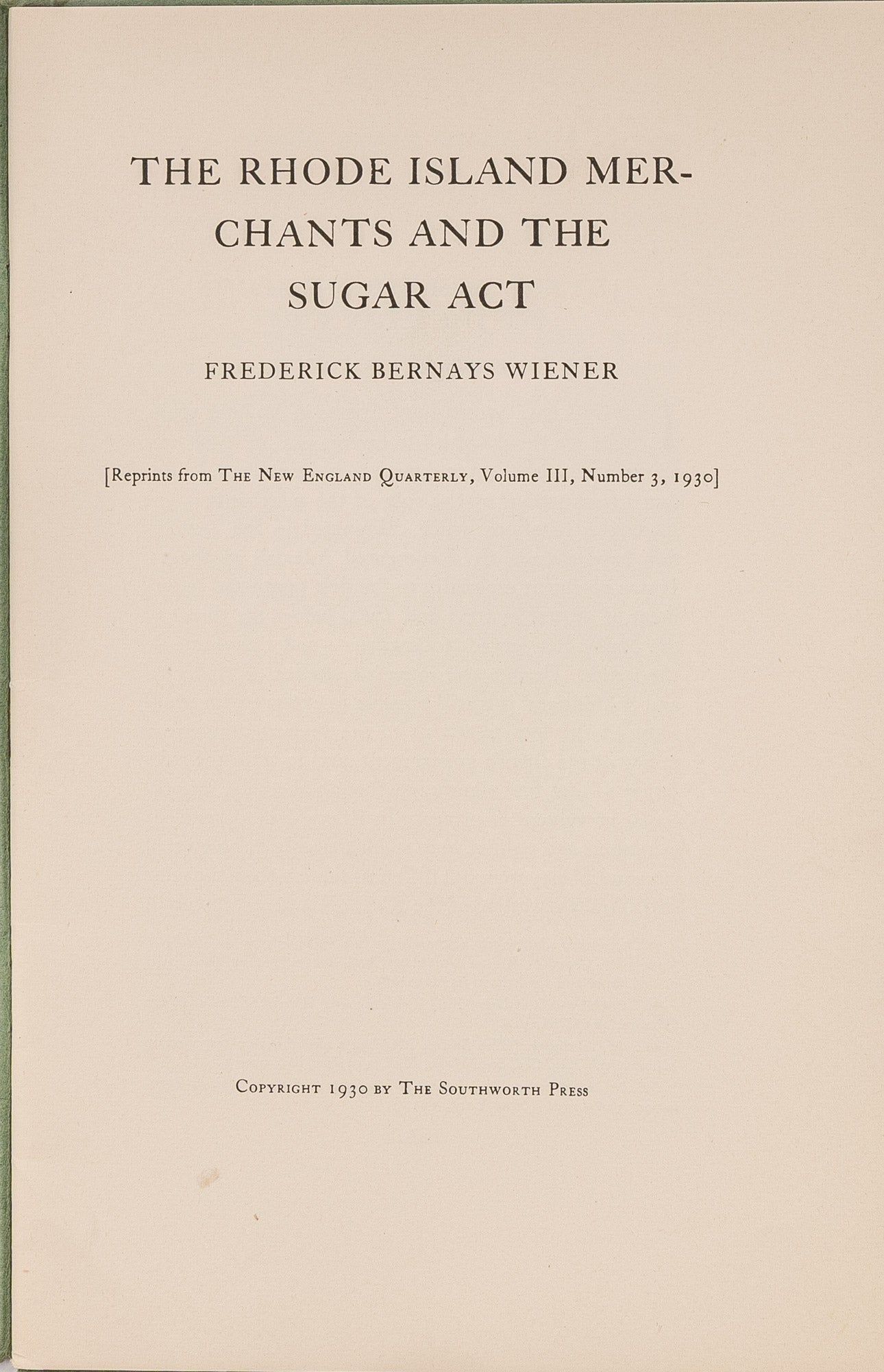 1930. Wiener, Frederick Bernays. The Rhode Island Merchants and the Sugar Act. [Place of publication not identified], Southworth Press, 1930. 464-500 pp. Green printed wraps. Light wear to edges, else near fine. $45. * Reprints from the New England Quarterly, Vol. III, No. 3, 1930.