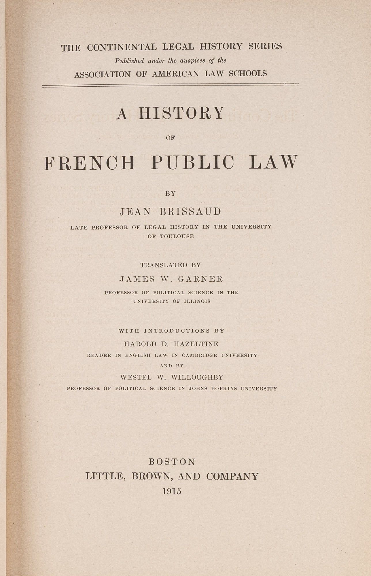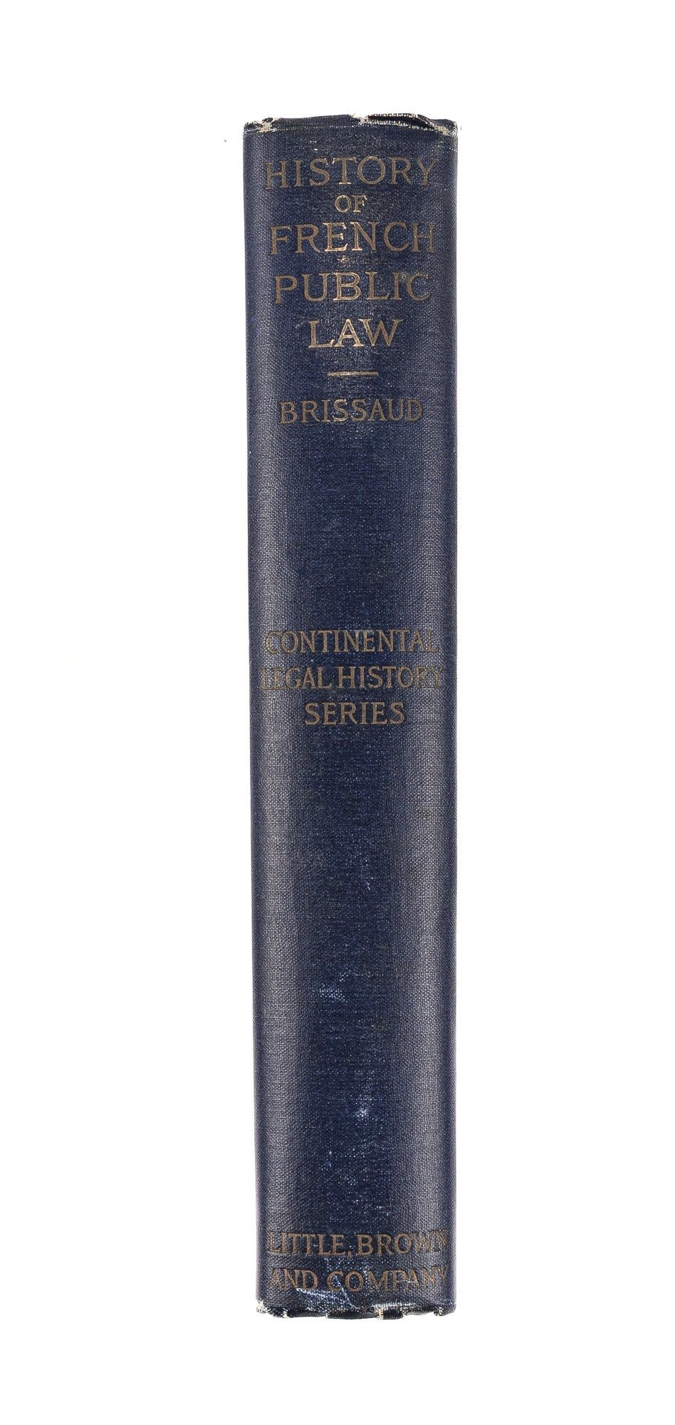 1915. Brissaud, Jean. A History of French Public Law. Translated by James W. Garner. With Introductions by Harold D. Hazeltine & Westel W. Willoughby. Boston: Little, Brown, and Company, 1915. lviii, 581 pp. Original blue cloth, with gilt stamped spine. Light wear to spine and corners, spine ends starting to fray. Internally clean. A very good copy. $25. * Volume IX of the Continental Legal History Series. The previous owner of this book was the Harvard-educated lawyer George David Ayers (1857-1933) of Boston. A biographical article on Ayers, plus a photographic portrait, can be found in Richard Herndon and Edwin M. Bacon, Men of Progress (Boston, 1896), 195.