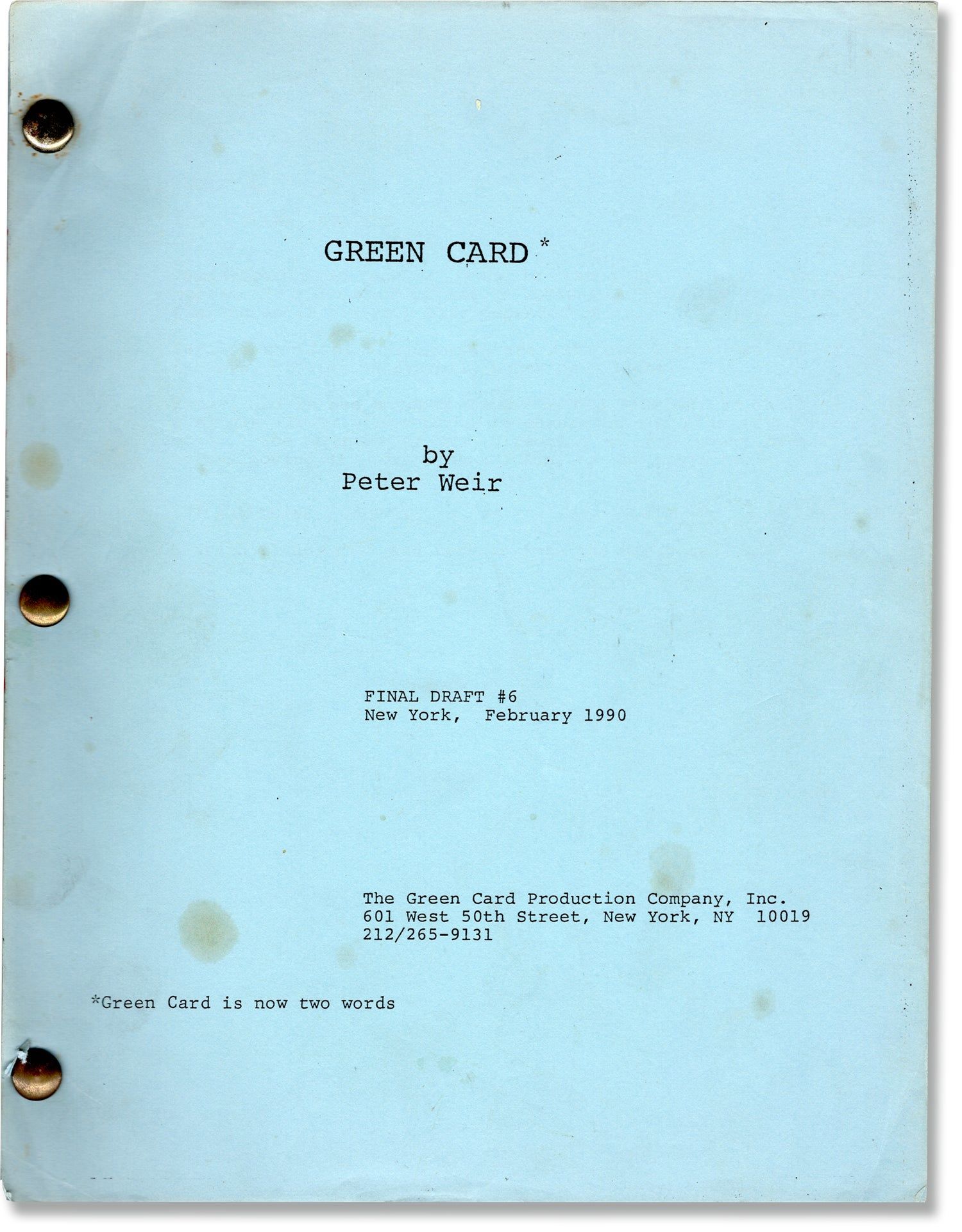 New York: The Green Card Production Company, 1990. Sixth Final Draft script for the 1990 film. Copy belonging to an unidentified crew member, with annotations in manuscript ink throughout, highlighting filming locations.