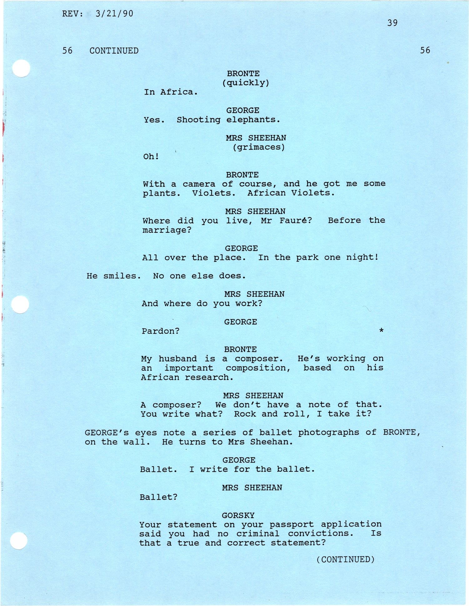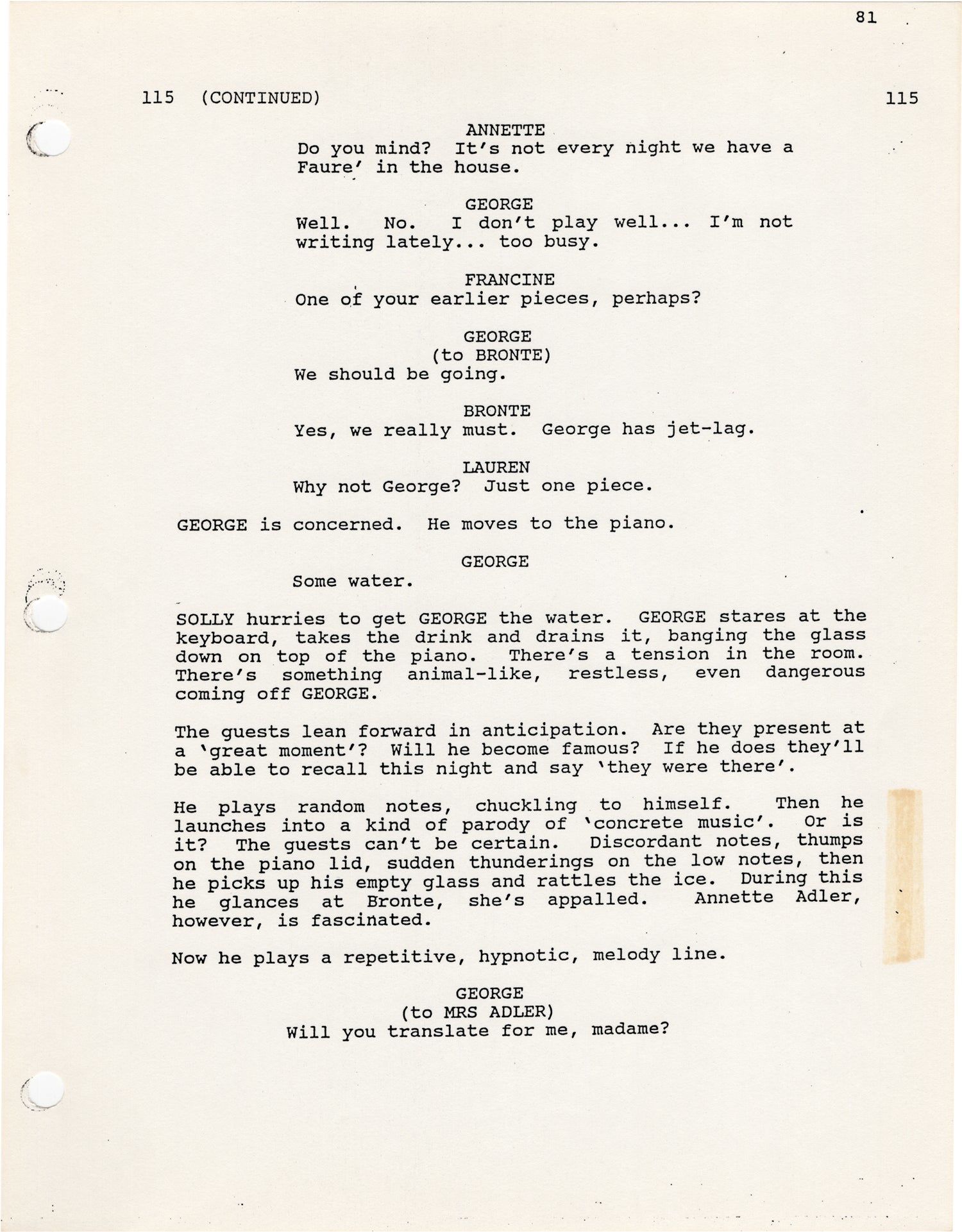 Self wrappers. Title page present, dated February 1990, noted as FINAL DRAFT #6, with credit for screenwriter Peter Weir. 138 leaves, with last page of text numbered 120. Xerographic duplication, rectos only, with blue revision pages throughout, dated March 20, 1990. Pages Very Good plus, bound with three gold brads.