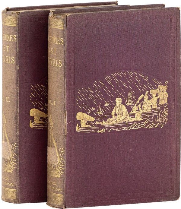 London: John Murray, 1874. First Edition. First printing. Octavo (23cm). Two volumes in purple cloth, stamped in gilt on front and spine; brown coated endpapers; xvi,360,6pp;[viii],346,20pp; 6pp publisher's catalogue at rear of vol. I, 20pp catalogue in vol. II; frontispieces, 3 lithographic facsimiles of leaves from Livingstone's journal, 17 full-page wood-engraved plates, 24 in-text wood engravings, color folding map in vol. II, large color folding map in pocket at rear of vol. I. Ex-library, with marks of spine labels, circulation slips to rear endpapers, and perforated stamps to title pages. Lightly rubbed, spines sunned but boards bright, vol. I hinges cracked, one leaf of ads in vol. II detached: Good or better.
