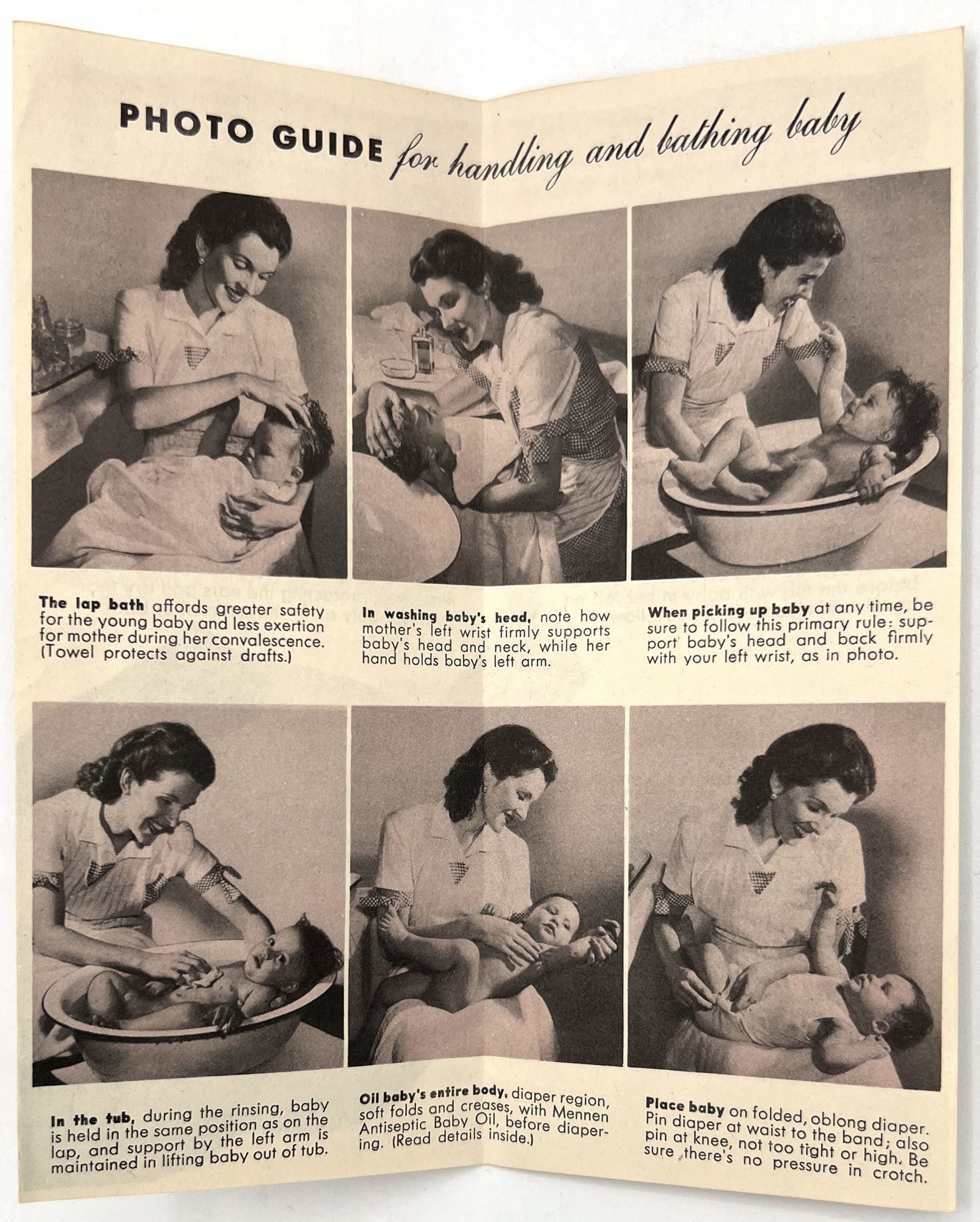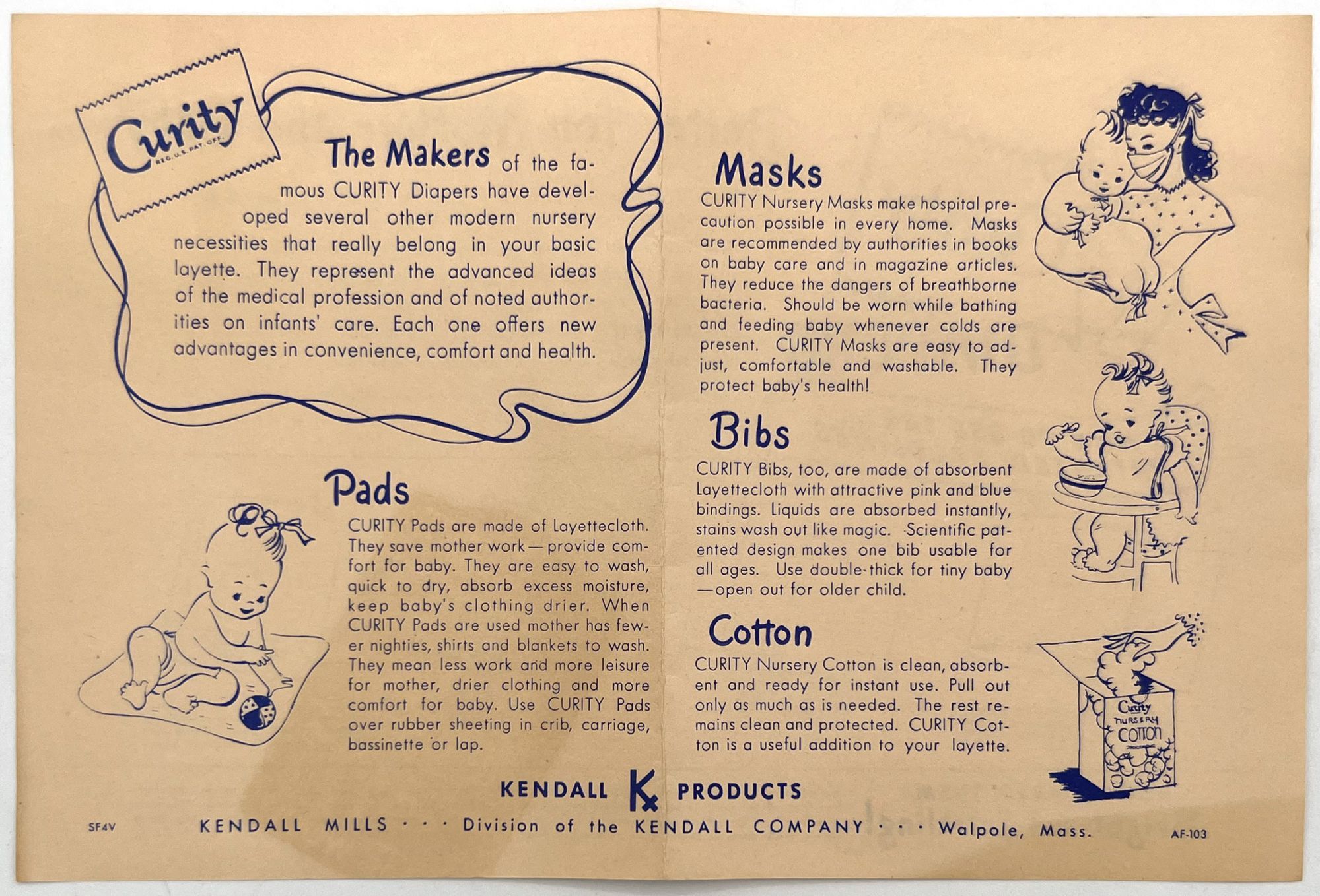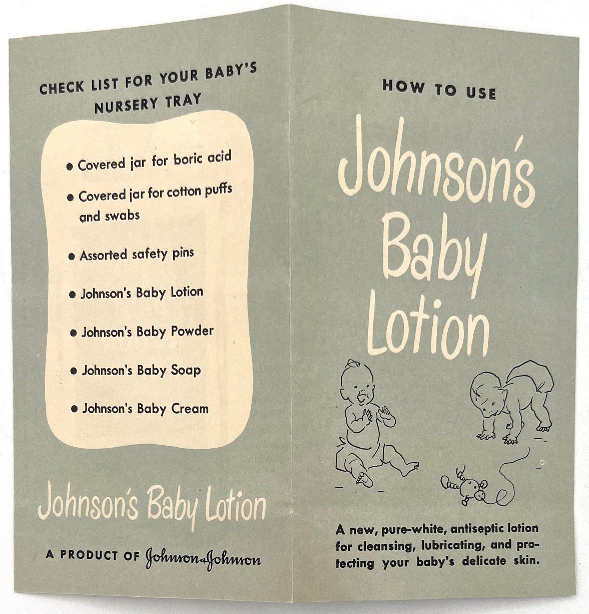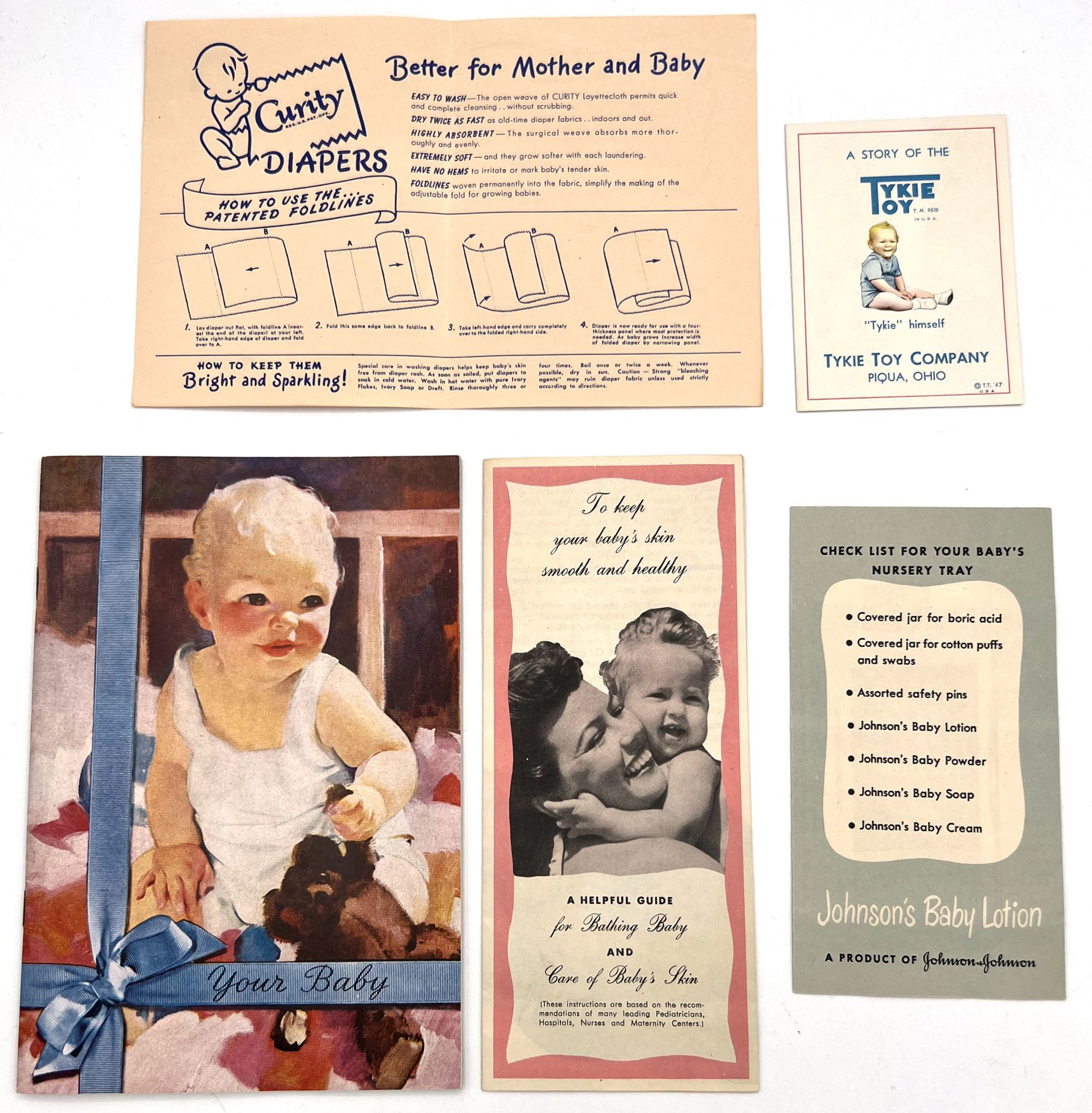 United States, 1947. Very good. Light toning.. A set of five (5) items advertising products to new parents between 1946 and 1947, at the beginning of the postwar "Baby Boom" in the United States. Provides excellent insight into parenting advice at the time, and how companies advertised their products to new parents (i.e. new mothers). Companies represented include: Pet Milk; Tykie Toys; Johnson & Johnson; Mennen Baby Oil; and Kendal Mills, makers of Curity brand masks, bibs, diapers, and cotton. Interesting to see the inclusion of face masks in recommended infant care supplies: "Masks are recommended by authorities in books on baby care and magazine articles. They reduce the dangers of breathborne bacteria. Should be worn while bathing and feeding baby whenever colds are present." Also interesting is the emphasis of learning through play (Tykie Toy advert), and the subjects covered in the Pet Milk booklet (8" by 5.5", pp. 62): nutrition and preparing formula, bathing and hygiene, weighing, sleeping, illness, teething, growth and psychology, and behavior management. Includes blank charts for baby's "firsts", "gifts", "birth record", and "immunizations". Interesting to see how parenting advice has or has note changed over the years, and how companies (still) market their products to new mothers.