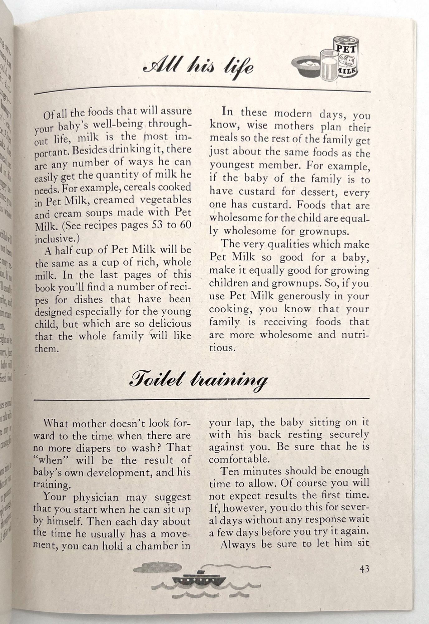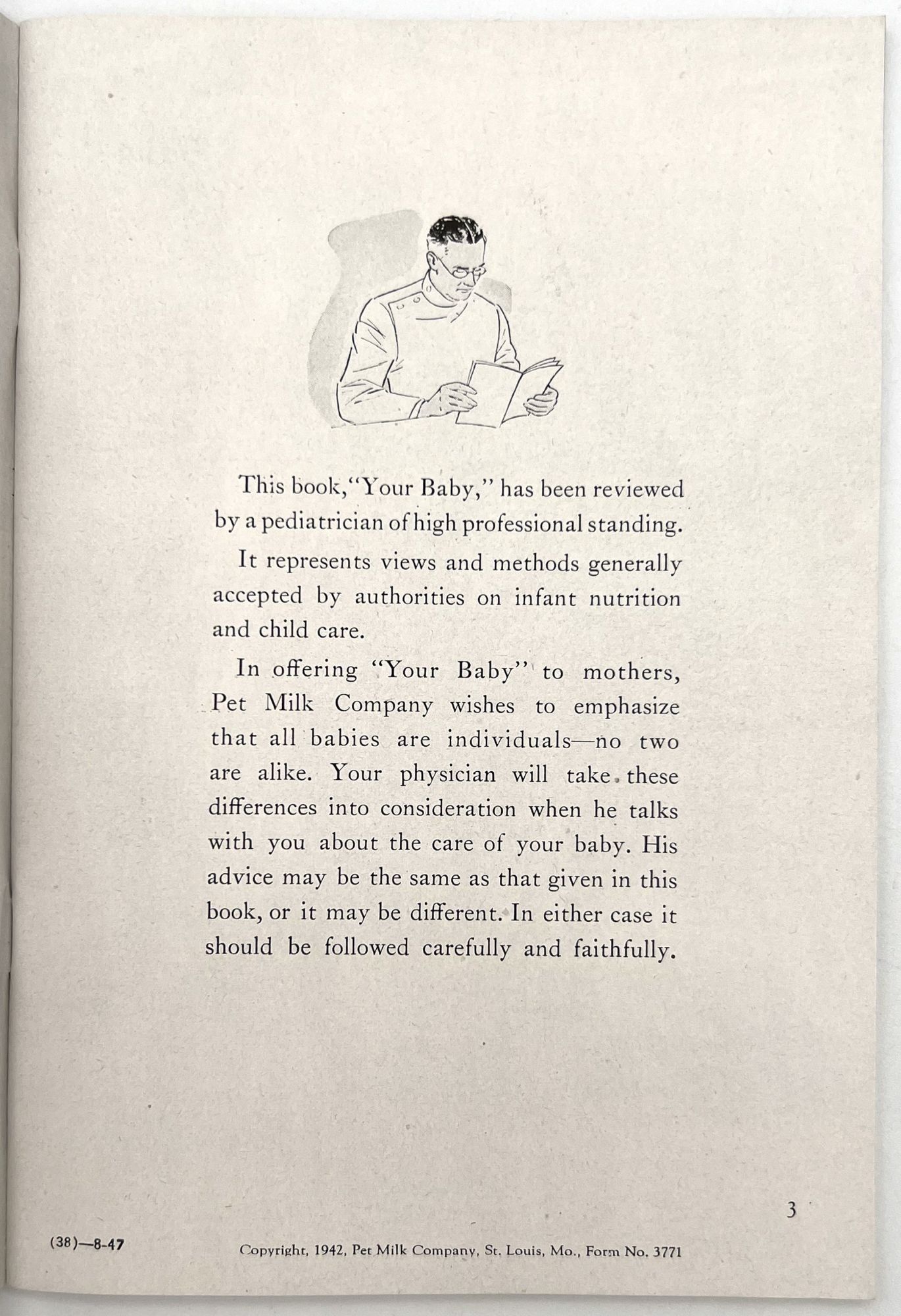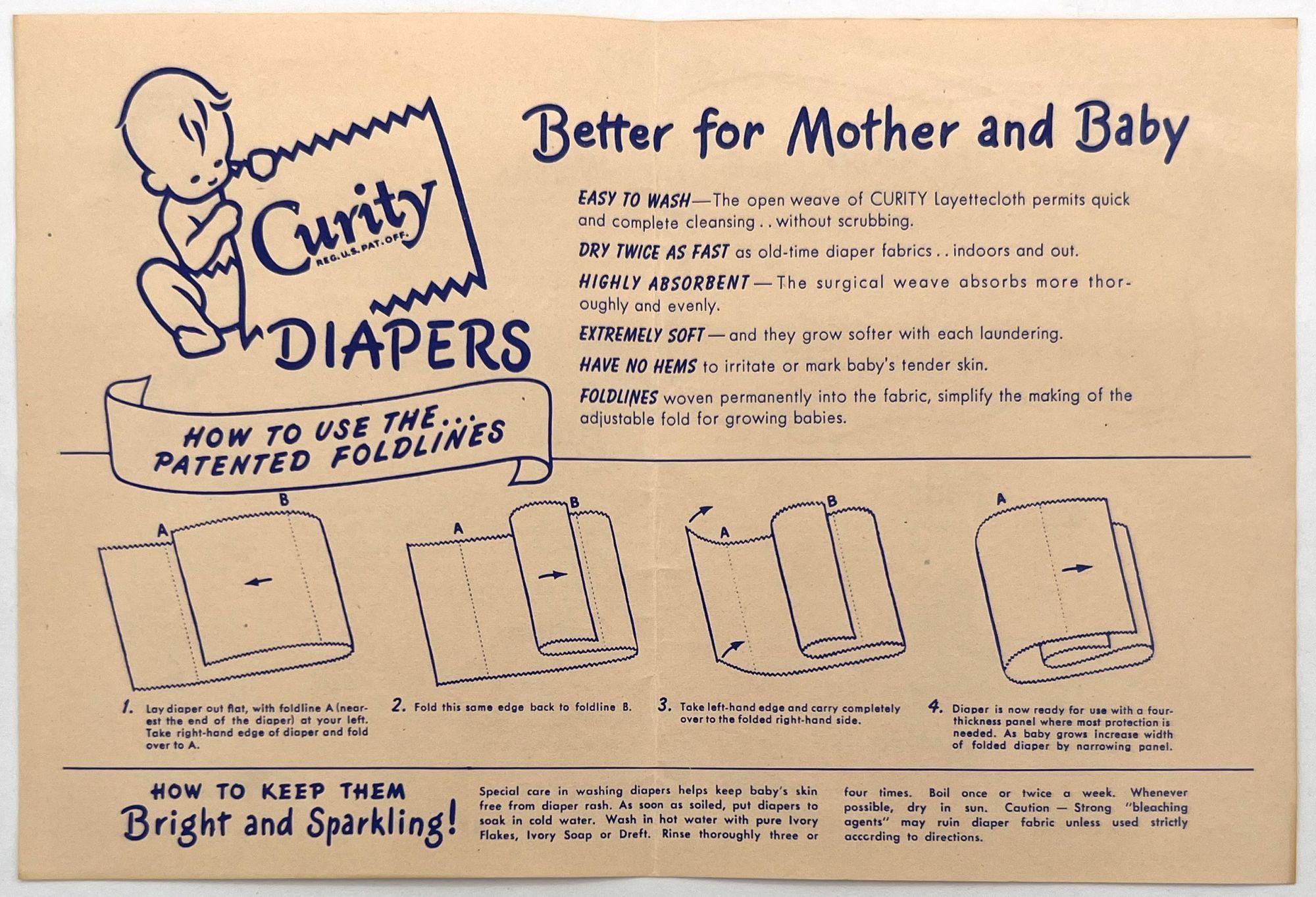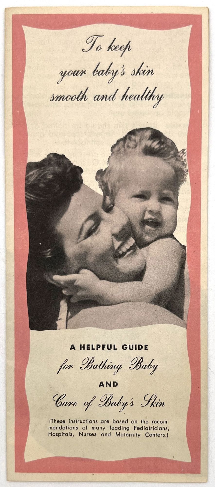 United States, 1947. Very good. Light toning.. A set of five (5) items advertising products to new parents between 1946 and 1947, at the beginning of the postwar "Baby Boom" in the United States. Provides excellent insight into parenting advice at the time, and how companies advertised their products to new parents (i.e. new mothers). Companies represented include: Pet Milk; Tykie Toys; Johnson & Johnson; Mennen Baby Oil; and Kendal Mills, makers of Curity brand masks, bibs, diapers, and cotton. Interesting to see the inclusion of face masks in recommended infant care supplies: "Masks are recommended by authorities in books on baby care and magazine articles. They reduce the dangers of breathborne bacteria. Should be worn while bathing and feeding baby whenever colds are present." Also interesting is the emphasis of learning through play (Tykie Toy advert), and the subjects covered in the Pet Milk booklet (8" by 5.5", pp. 62): nutrition and preparing formula, bathing and hygiene, weighing, sleeping, illness, teething, growth and psychology, and behavior management. Includes blank charts for baby's "firsts", "gifts", "birth record", and "immunizations". Interesting to see how parenting advice has or has note changed over the years, and how companies (still) market their products to new mothers.
