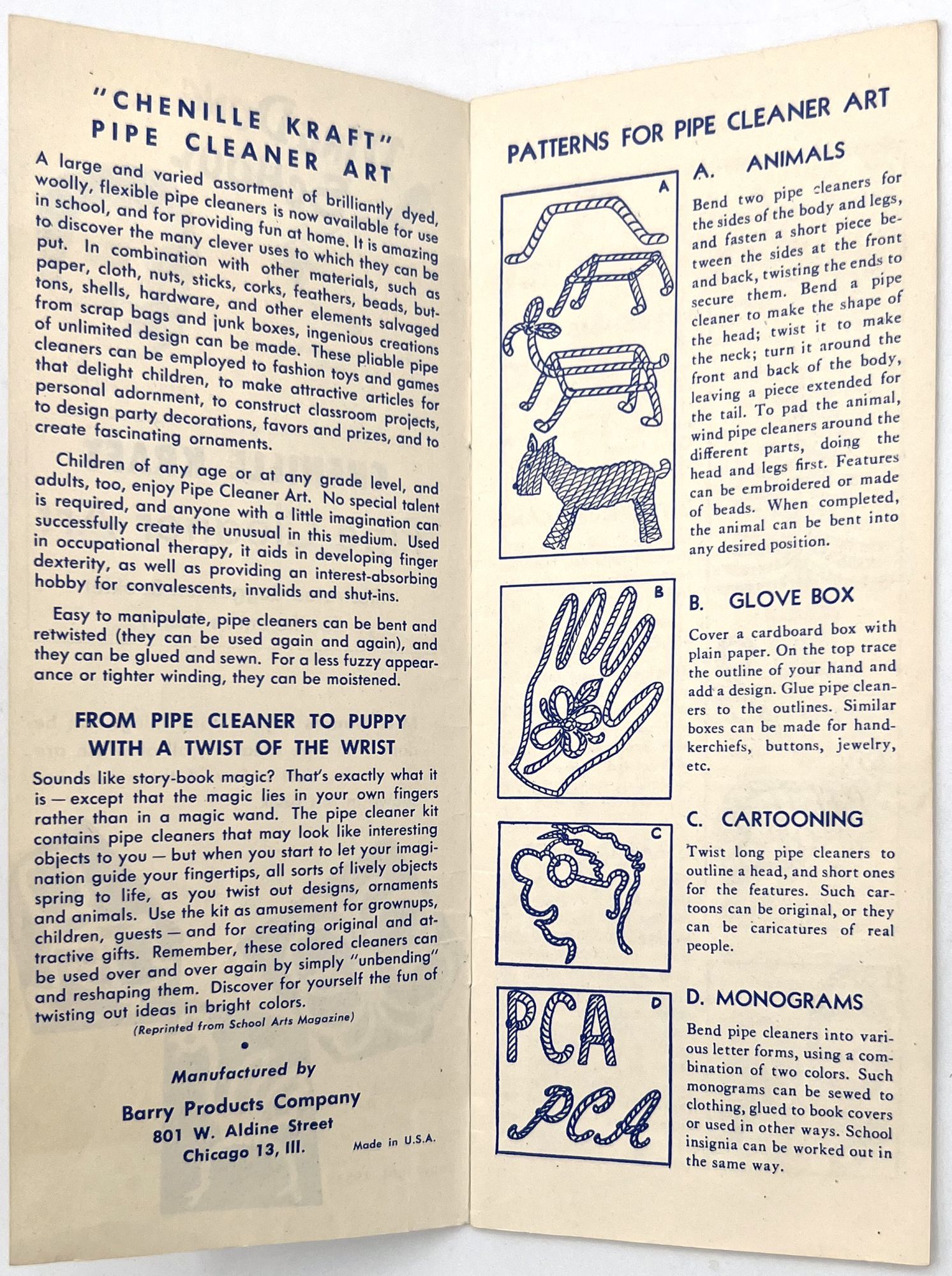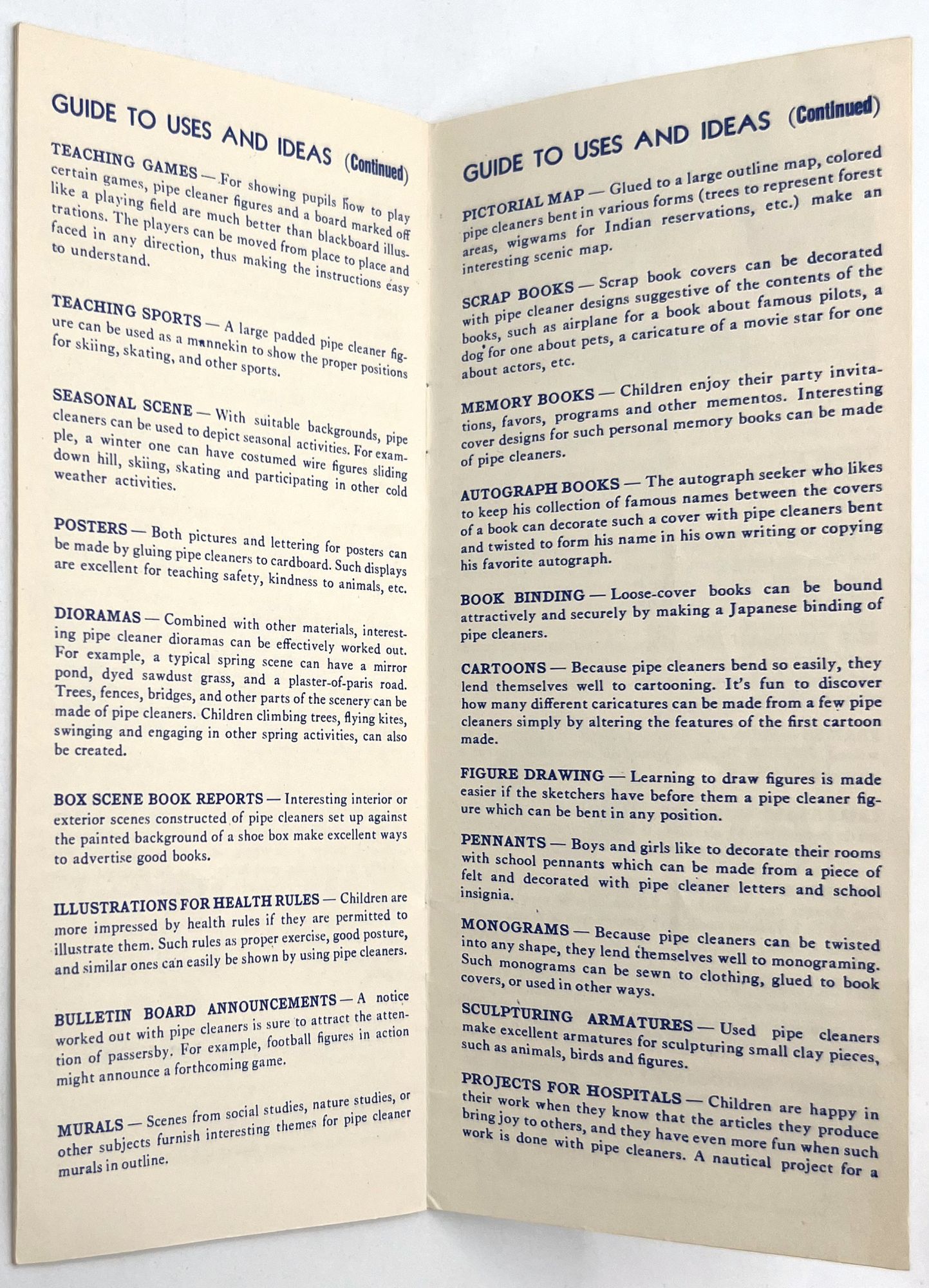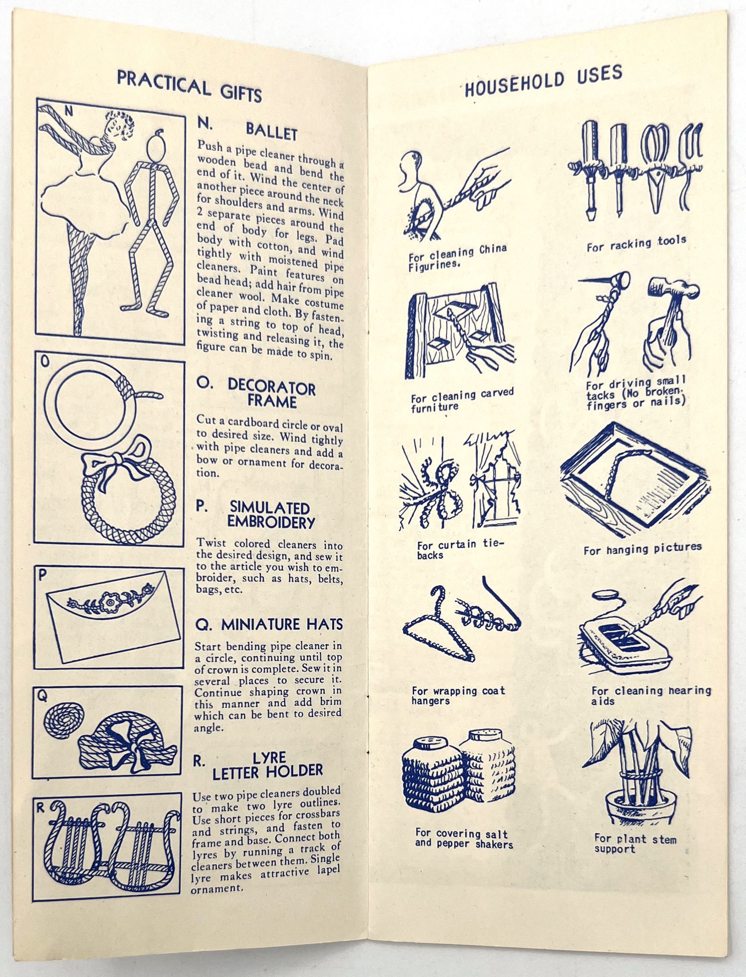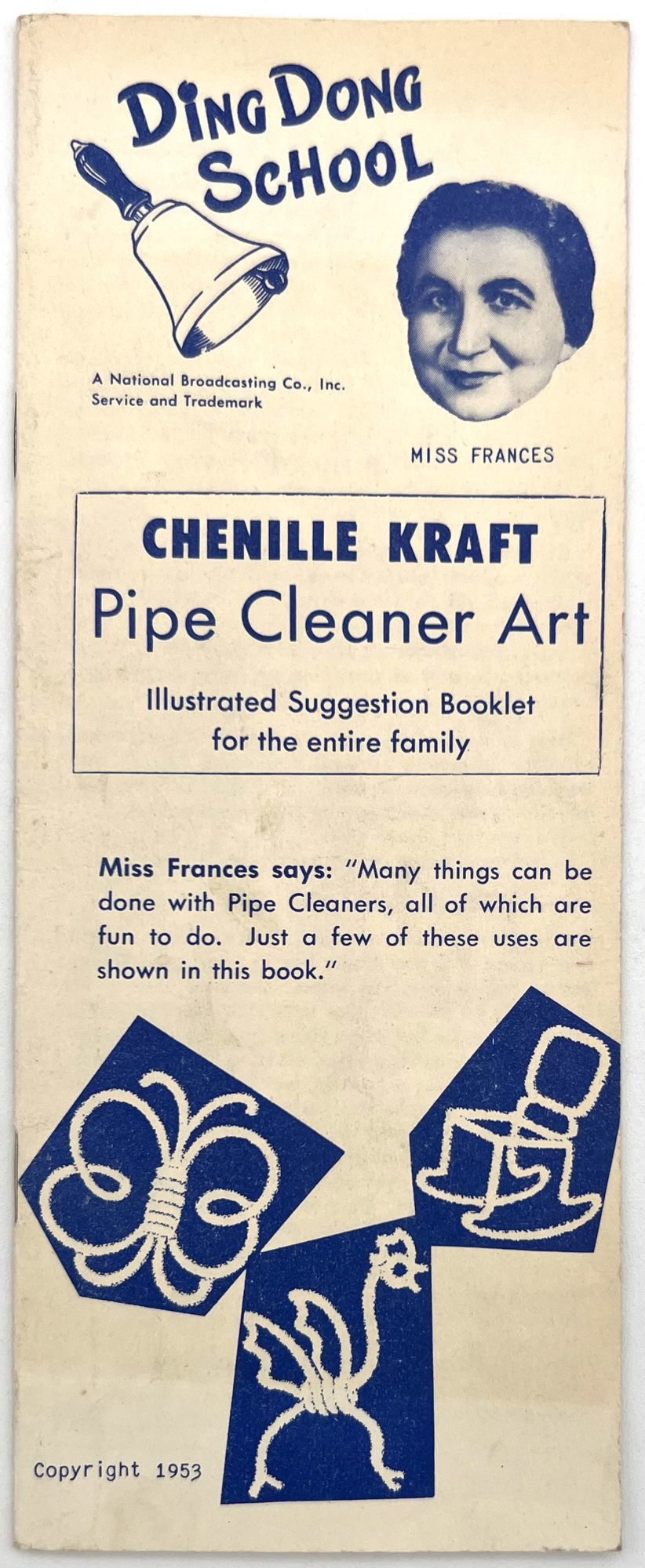 Chicago, Illinois: Barry Products Company, 1953. Very good. Minor toning/soiling.. A pocket guide to pipe cleaner art promoting the beloved children's television program "Ding Song School" with Miss Francis, as well as "Chenille Kraft" brand pipe cleaners. Includes instructions for crafts with diagrams for making cartoons, animals, monograms, holiday decorations, and party favors, as well as common household uses (e.g. cleaning hearing aids, plant stem support, tying back curtains). Includes dozens of miscellaneous ideas ranging from hospital craft projects for children to making frames for photos and lamp shade trimming. Single vol. (8" by 3.25"), pp. [16], illus., in original illus. self wrps with image of pipe cleaner art and Miss Frances on front.