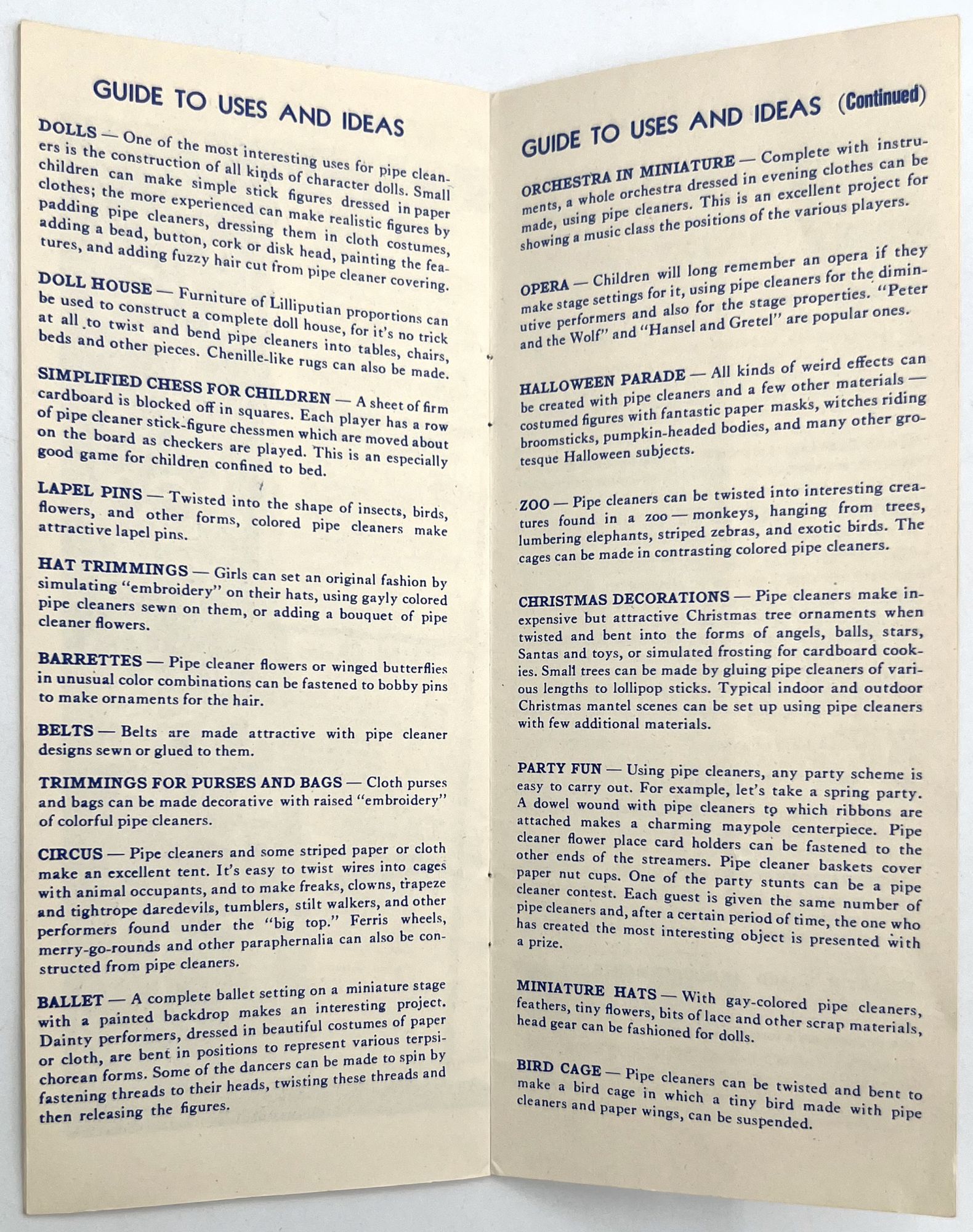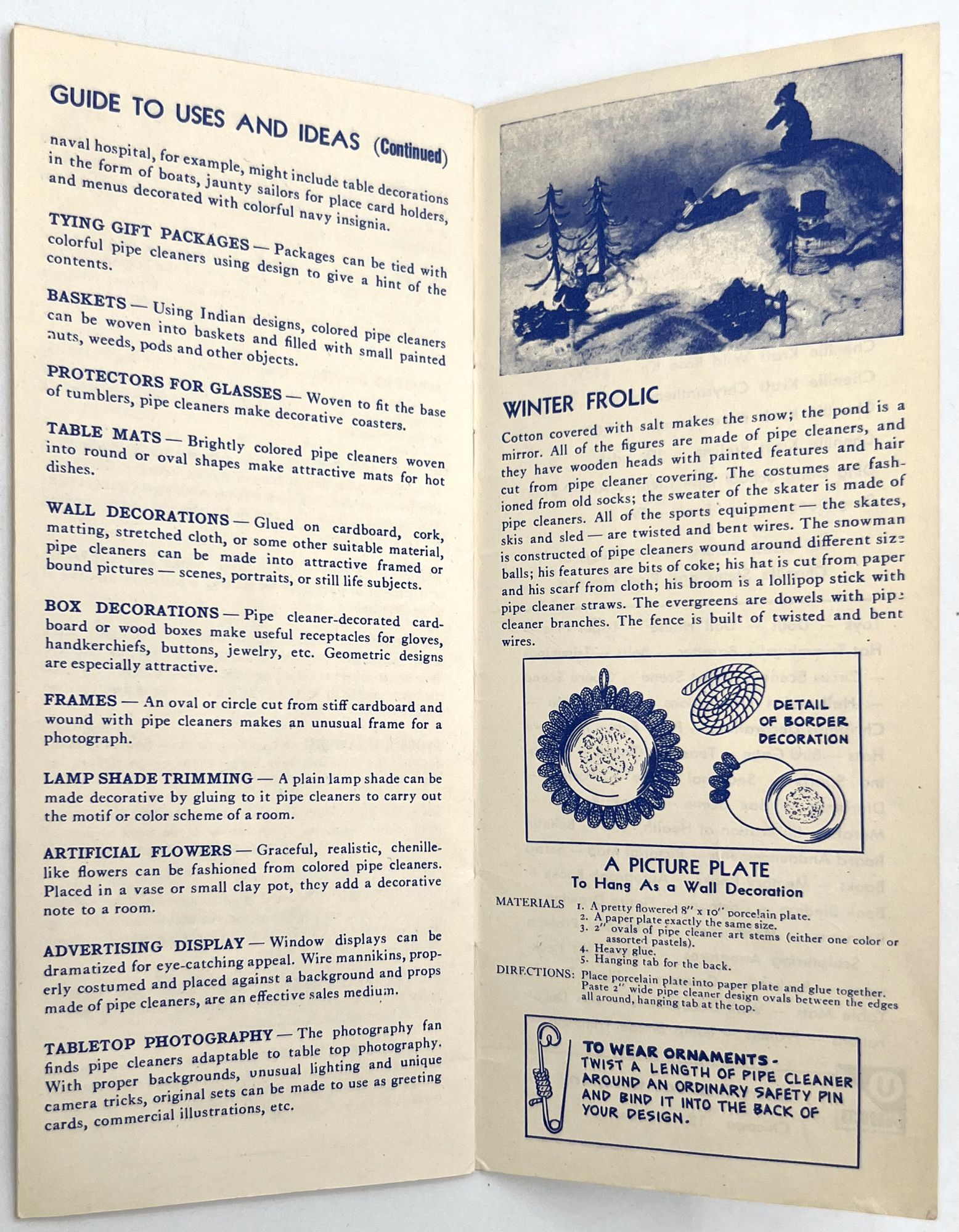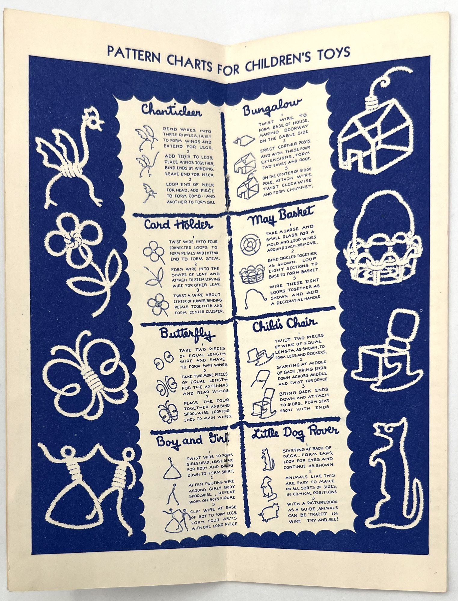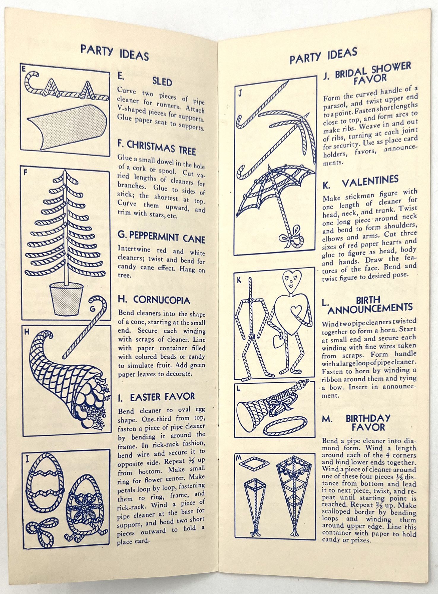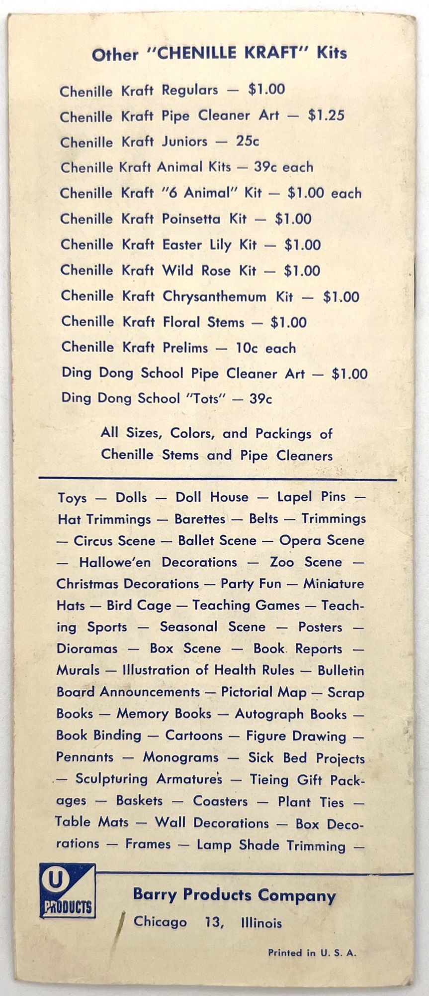 Chicago, Illinois: Barry Products Company, 1953. Very good. Minor toning/soiling.. A pocket guide to pipe cleaner art promoting the beloved children's television program "Ding Song School" with Miss Francis, as well as "Chenille Kraft" brand pipe cleaners. Includes instructions for crafts with diagrams for making cartoons, animals, monograms, holiday decorations, and party favors, as well as common household uses (e.g. cleaning hearing aids, plant stem support, tying back curtains). Includes dozens of miscellaneous ideas ranging from hospital craft projects for children to making frames for photos and lamp shade trimming. Single vol. (8" by 3.25"), pp. [16], illus., in original illus. self wrps with image of pipe cleaner art and Miss Frances on front.