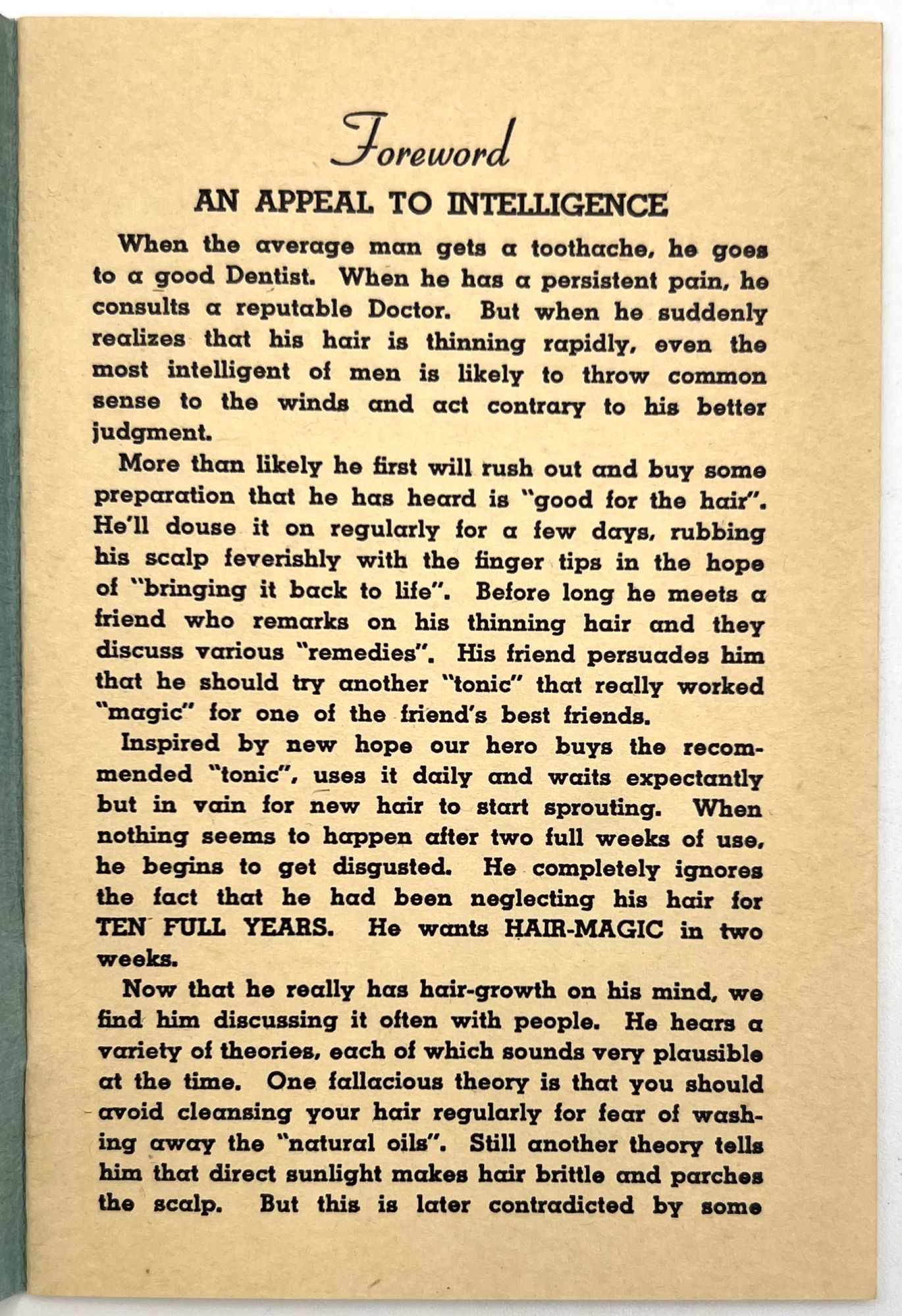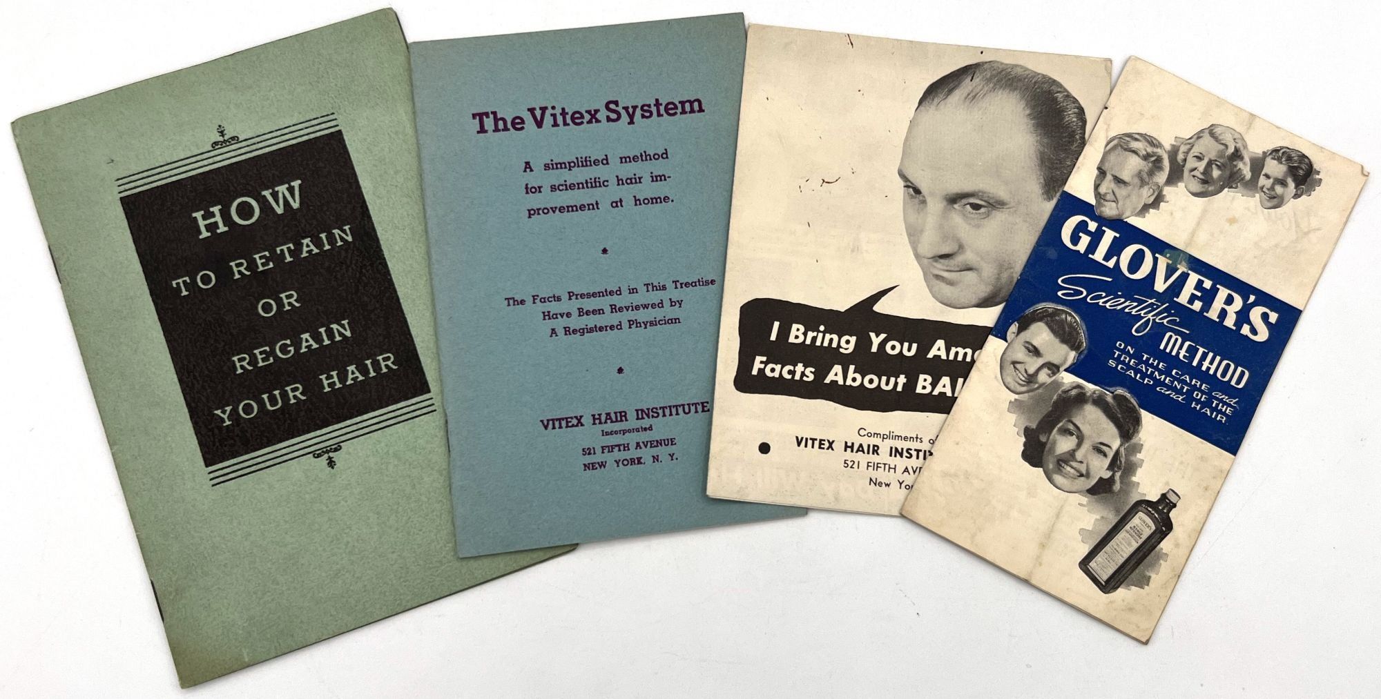 United States, 1940. Very good. Light toning or soiling.. A group of four (4) booklets advertising remedies or treatments for baldness and thinning hair in the 1930s and 1940s. Provides and interesting window into how companies advertised products to Americans, and how highly thick hair was (is) valued in Western society. The items include: