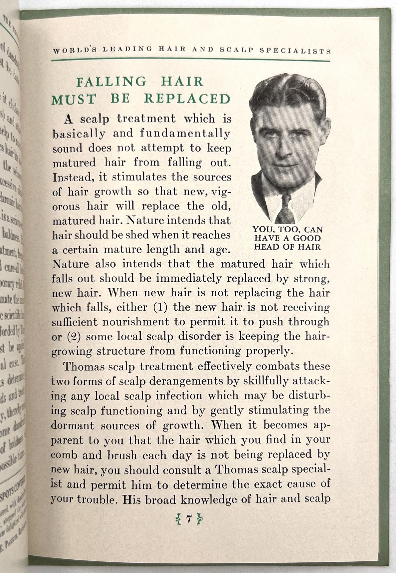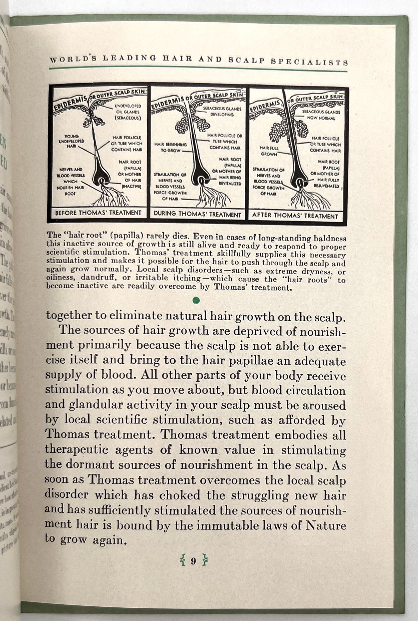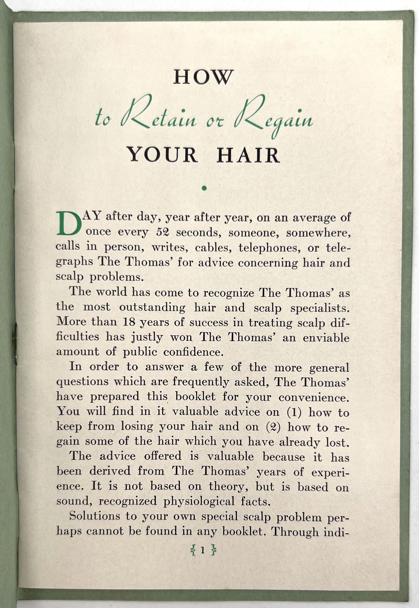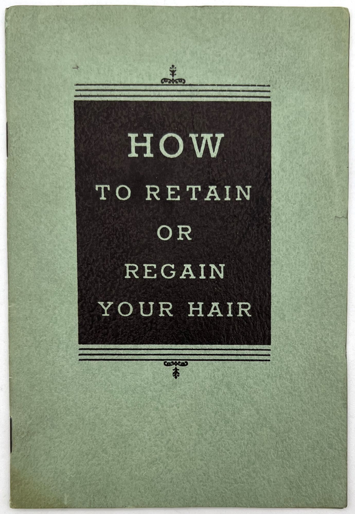 "How to Retain or Regain Your Hair". N.pl.: Paul A. Thomas, 1934. Single vol. (6.5" by 4.25"), pp. 20, photo illus., in original printed green wrps. Promotes Thomas brand scalp treatments for hair loss in men and women. Includes testimonials from stage stars and orchestra leader.