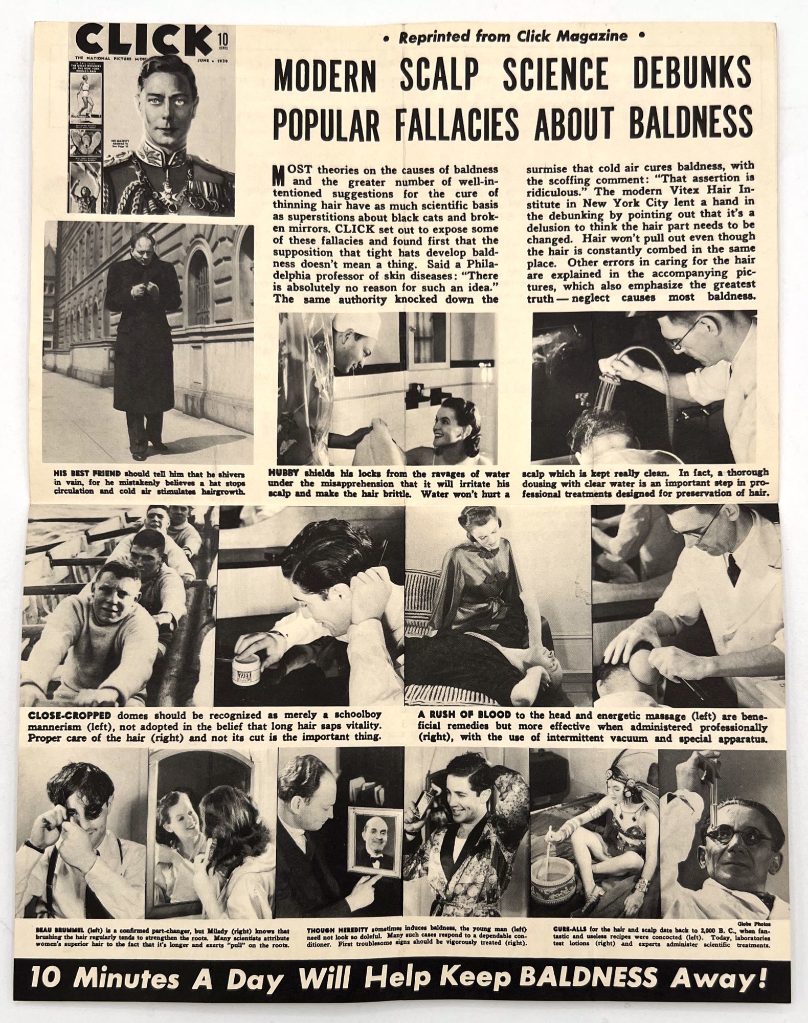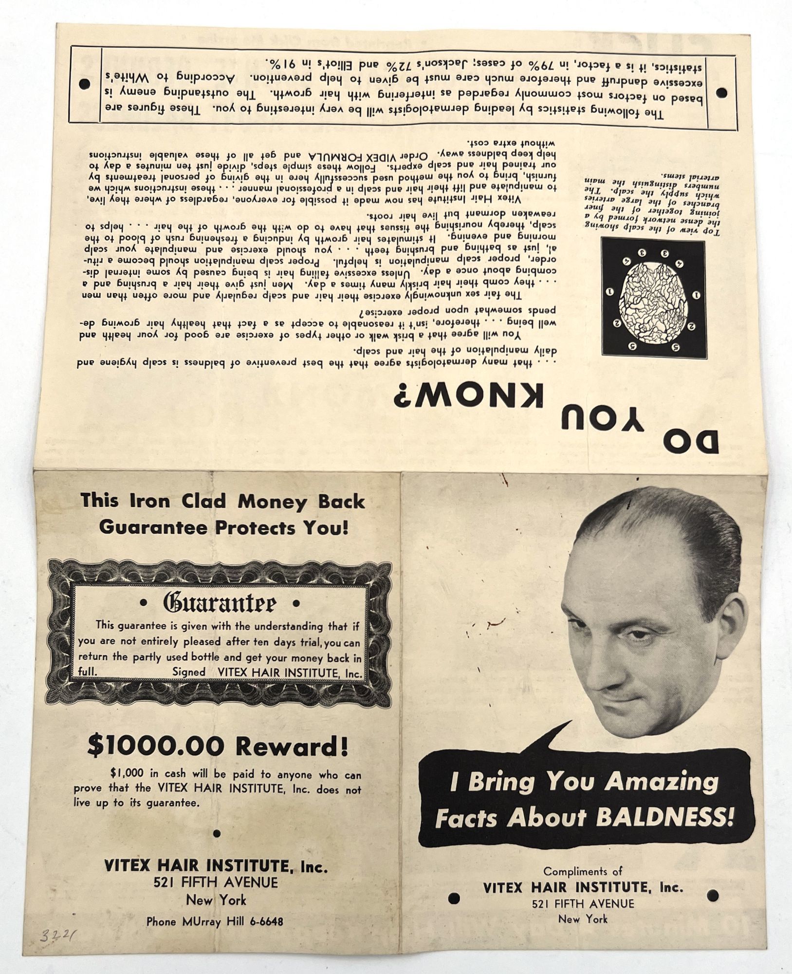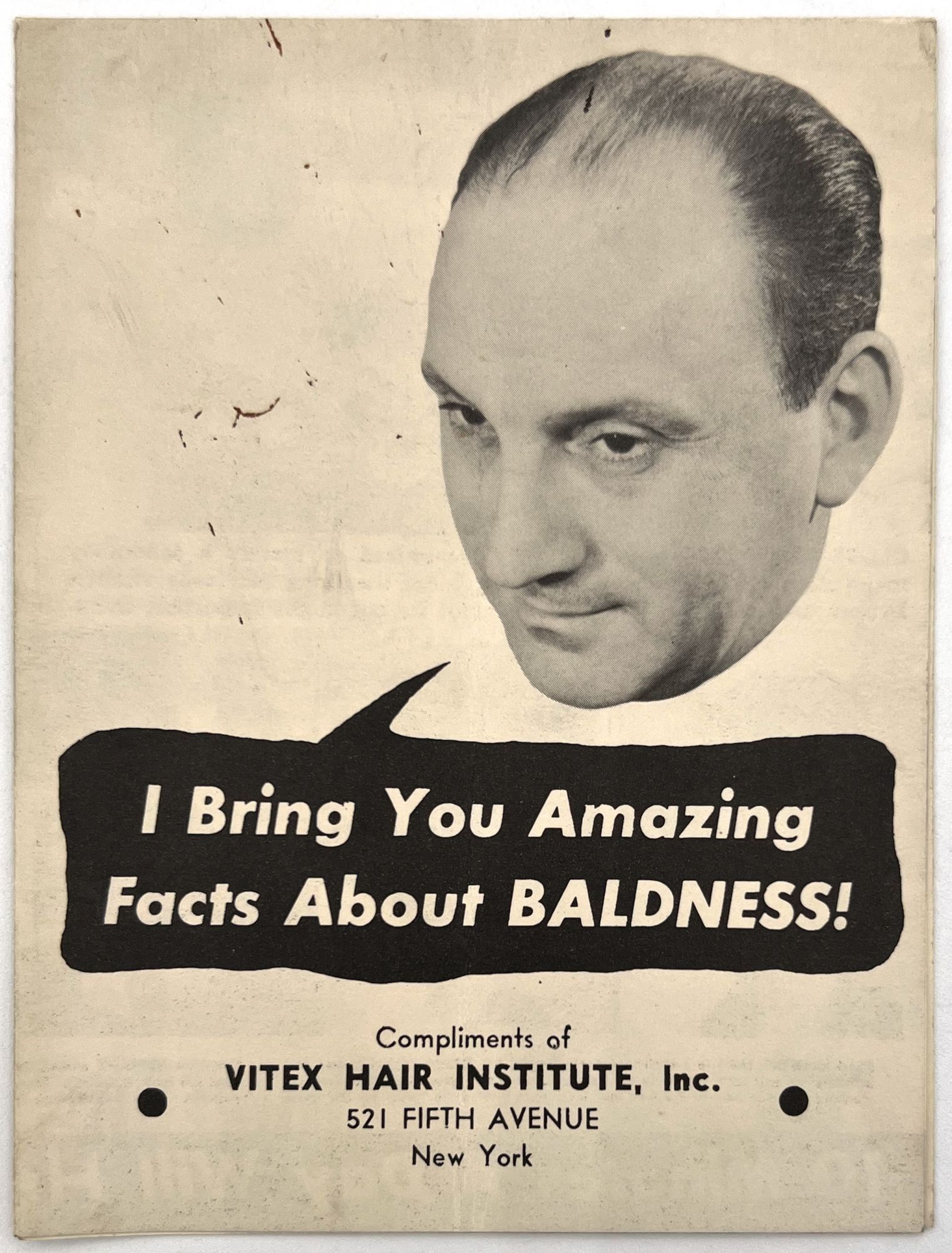 "I Bring You Amazing Facts About Baldness". New York: Vitex Hair Institute, 1940s. Folding leaflet measuring approx. 11" by 8.5" unfolded with many photos of happy customers using the product. Encourages men to not wear hats (apparently cold air stimulates hair growth).