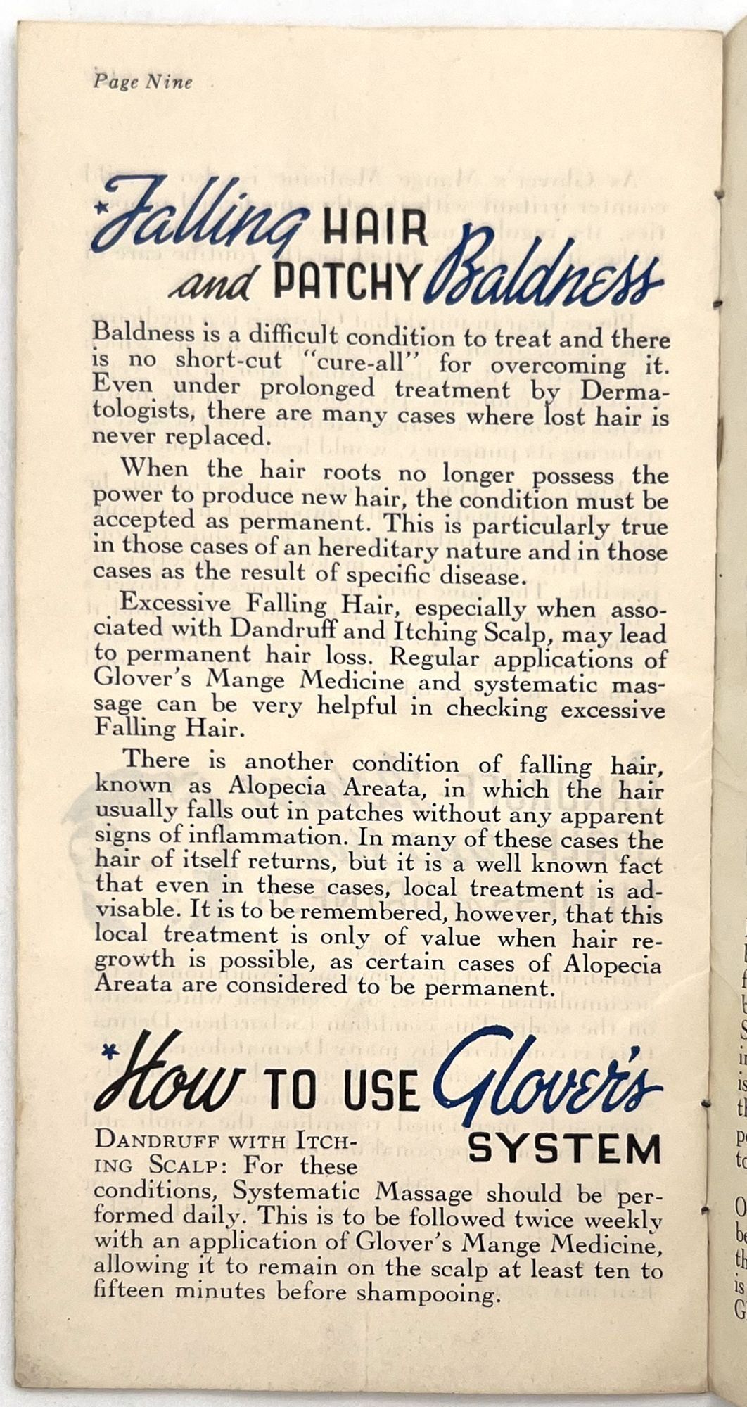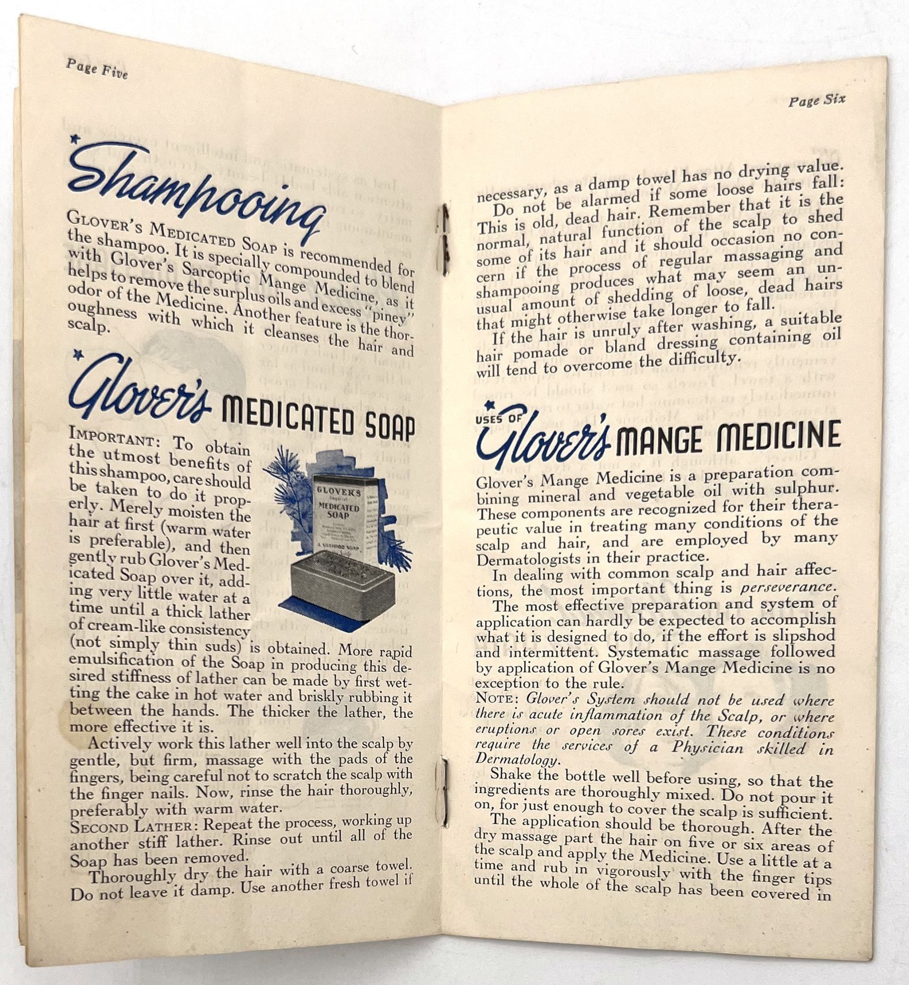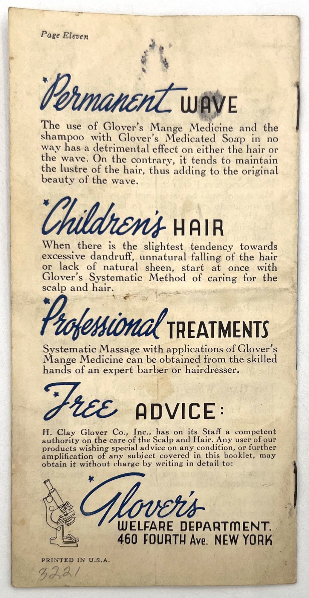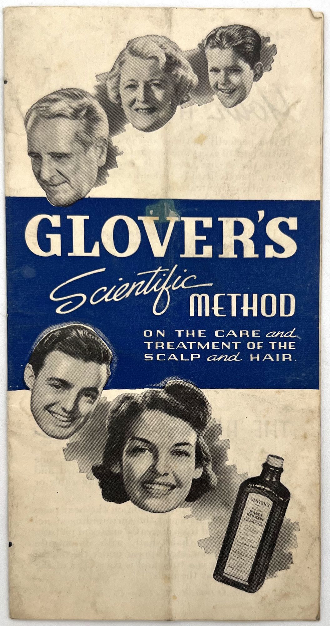 "Glover's Scientific Method". New York, New York: H. Clay Glover Co., Inc., 1940. Single vol. (6" by 3"), pp. [1], 10, [1], illus., in original illus. wrps with photos of happy customers on front. Promotes the product with detailed instructions for massaging the scalp and hygiene.