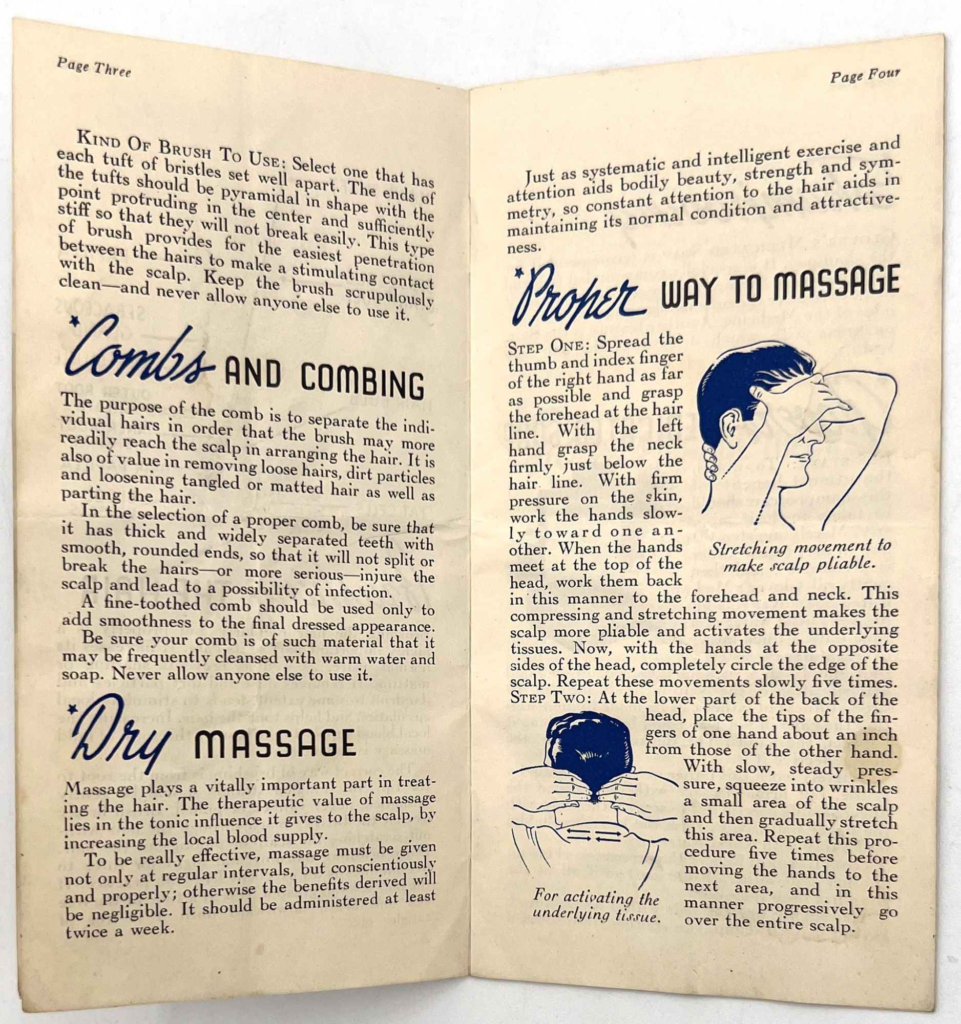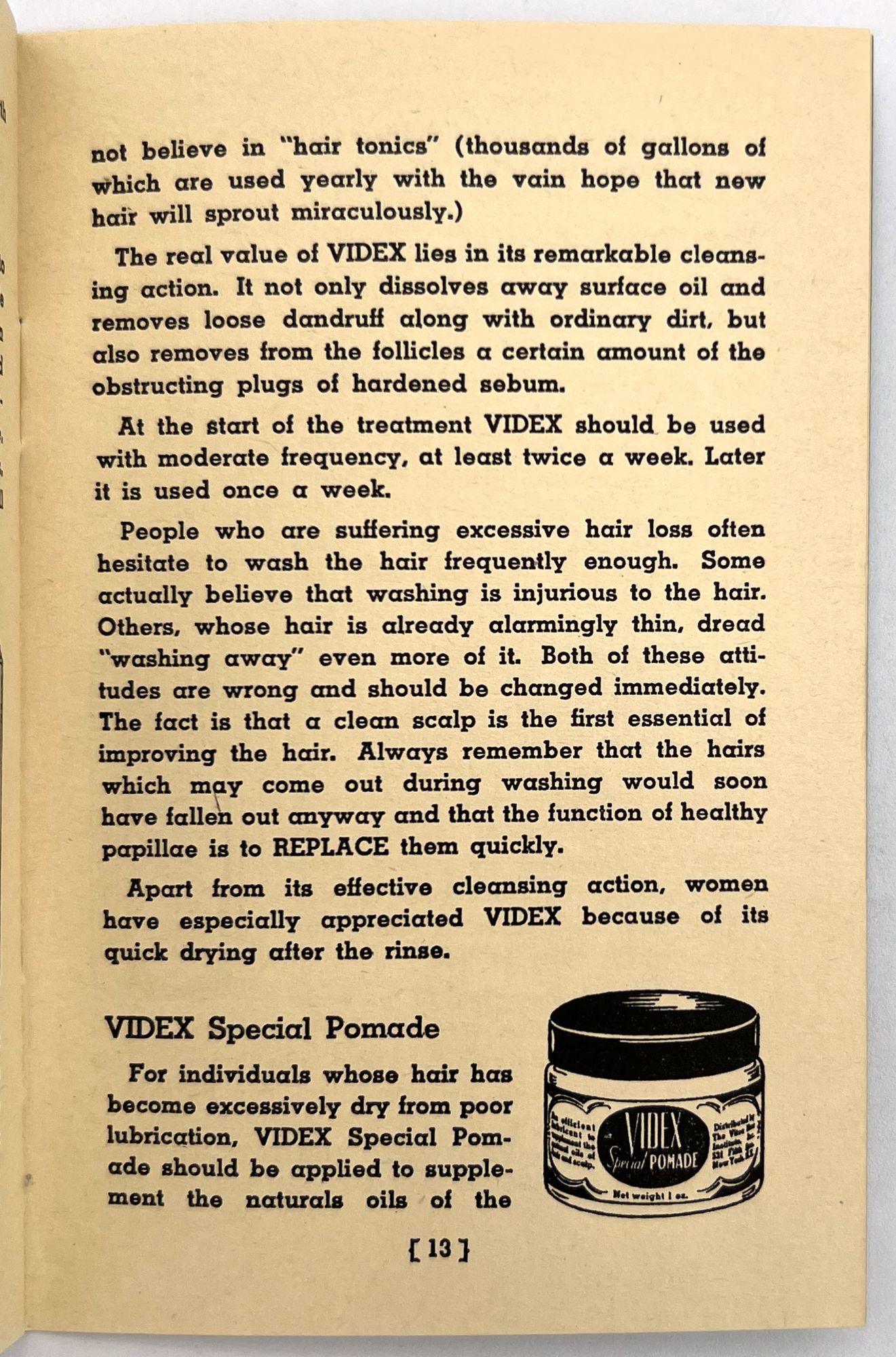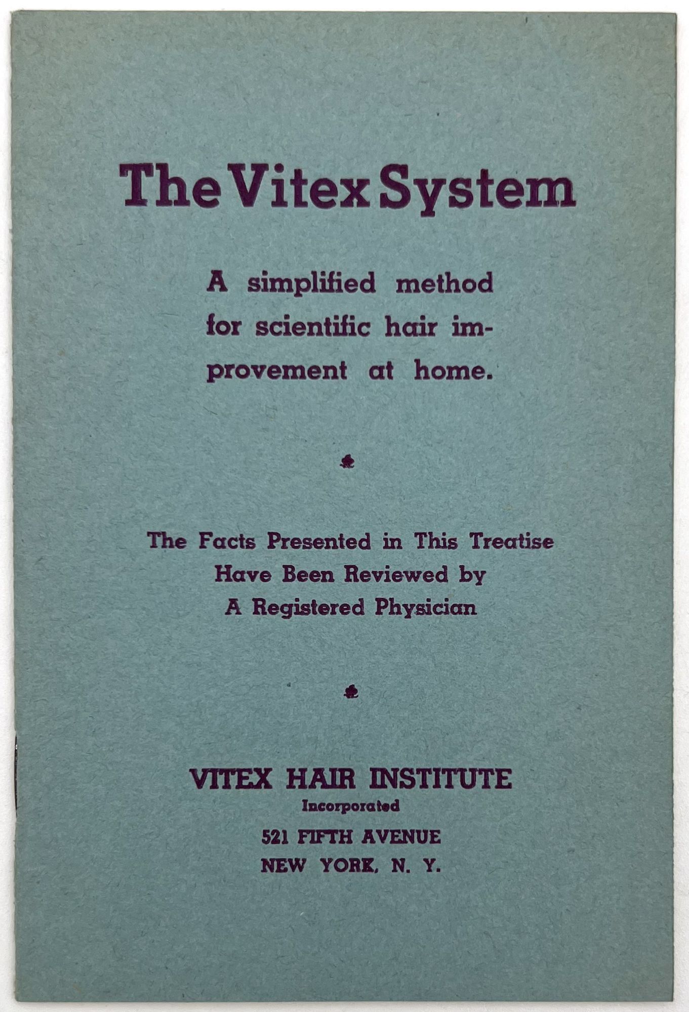 "The Vitex System". New York: Vitex Hair Institute, c.1940. Single vol. (5.75" by 3.75"), pp. 16, in original blue wrps. Promotes "Vitex System" of hair loss prevention.