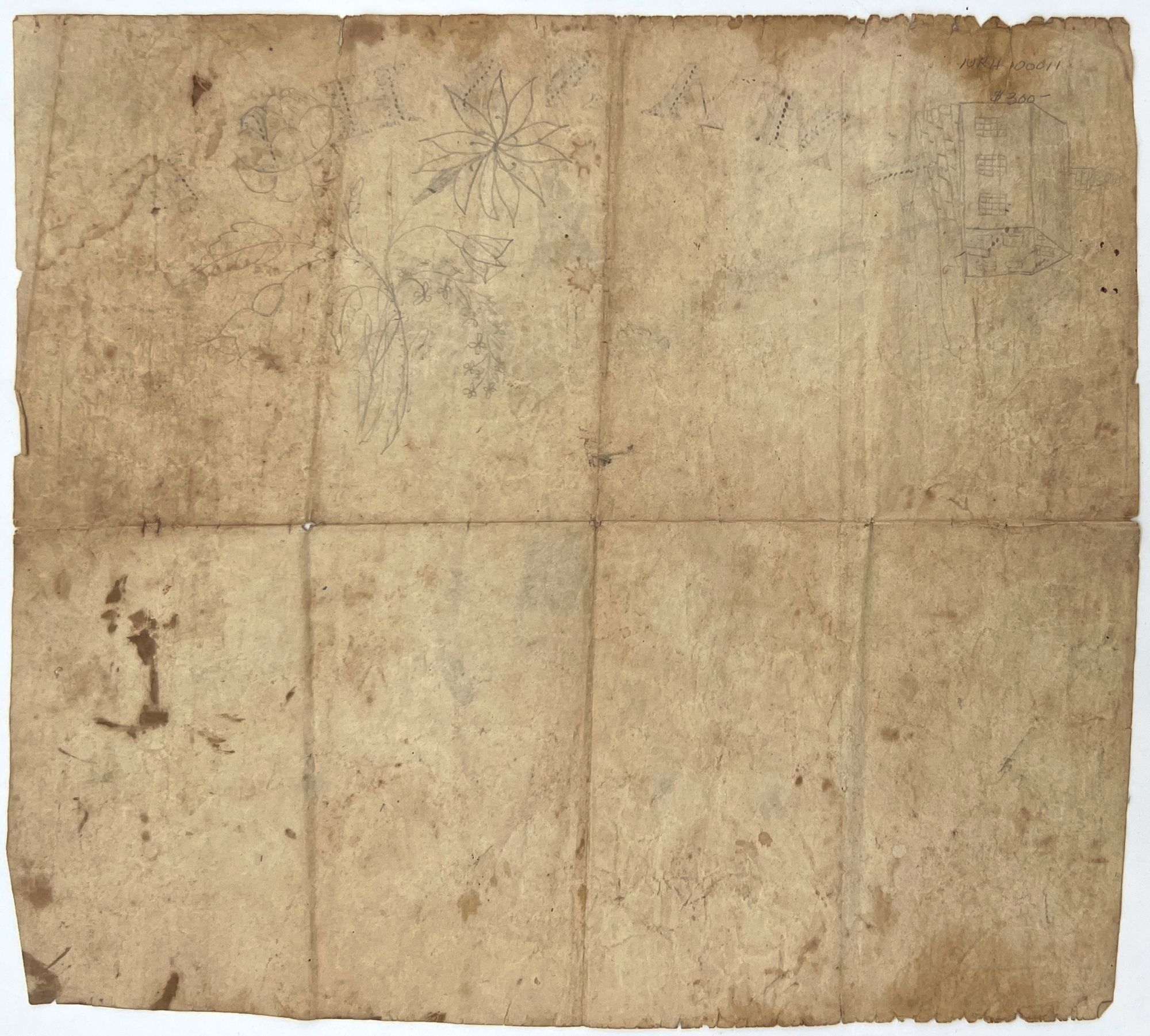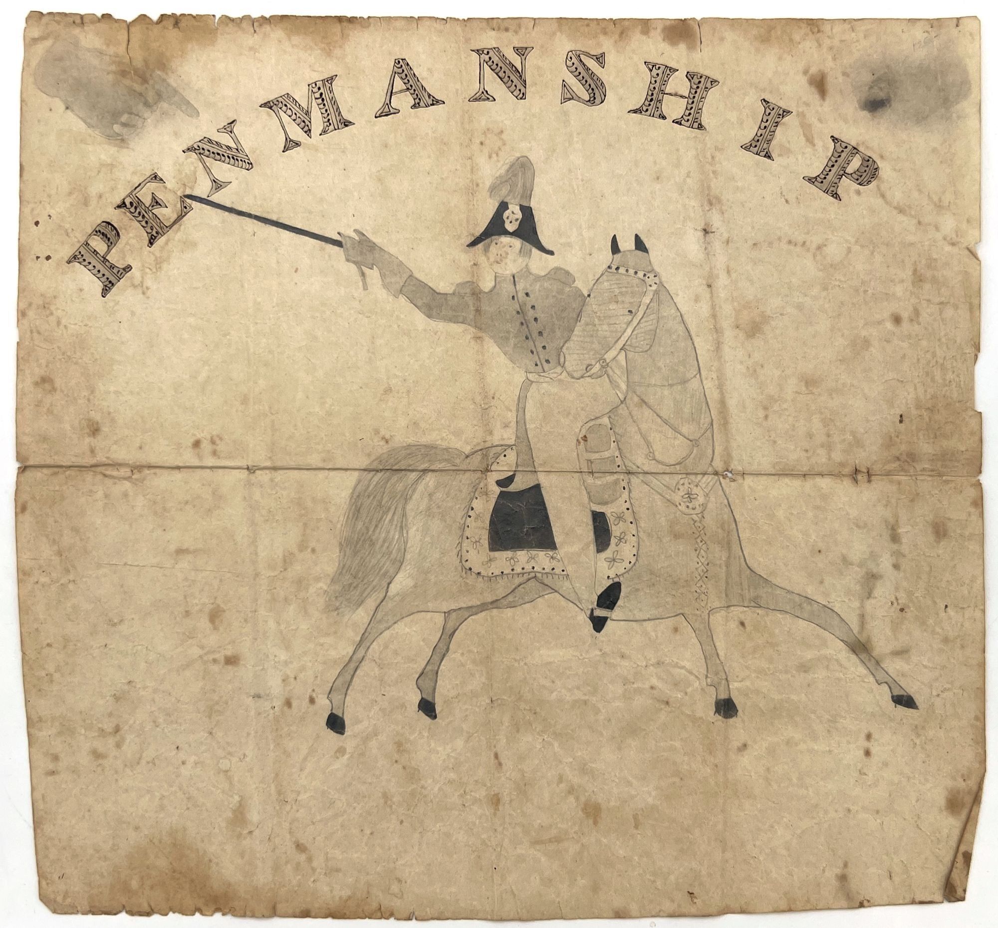 United States, 1840. Poor to fair. Toning, staining, letter folds and short tears/nicks.. An attractive example of original artwork by an adolescent learning penmanship and art. Each letter of the word "Penmanship" has been rendered in flourishes. There is also a manicule in the upper left-hand corner pointing to the word, and below a pencil drawing of a soldier on horseback holding his sword aloft. Measures approx. 9.75" by 10.5". Pencil with ink wash. Could perhaps have been used as a title page or cover for a penmanship sketchbook/notebook.