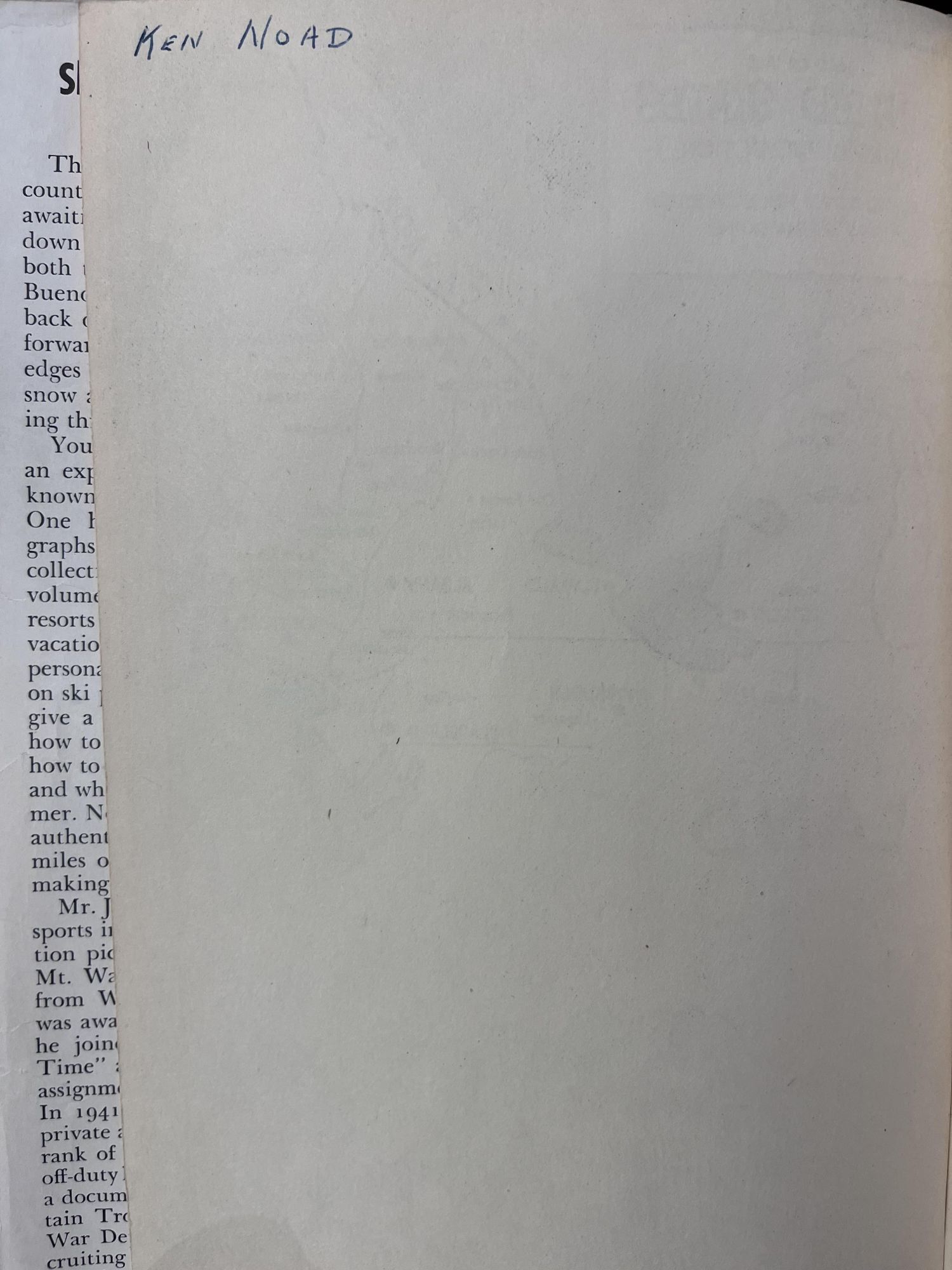 New York: The Macmillan Company, 1947. First printing. Hardcover. Near Fine/Fair. 257 pp. Octavo [25.3 cm]. Blue cloth over boards. Title is stamped in white on the cover and spine. Corners and spine ends are bumped. Ownership mark on front endpaper, and dust jacket. Dust jacket is tearing at the head and foot of the spine. Decent amount of wear around the edges; the corners on the front flap have been cut. Scarce copy. "Thousands of ski-enthusiasts the country over have been eagerly awaiting this book that zooms you down the breath-taking ski trails of both the Americas...You'll be doing your skiing with an expert, for John Jay is a well-known name in the skiing world. One hundred magnificent photographs, culled from Mr. Jay's huge collection, illustrate this handsome volume..." -from the dust jacket.