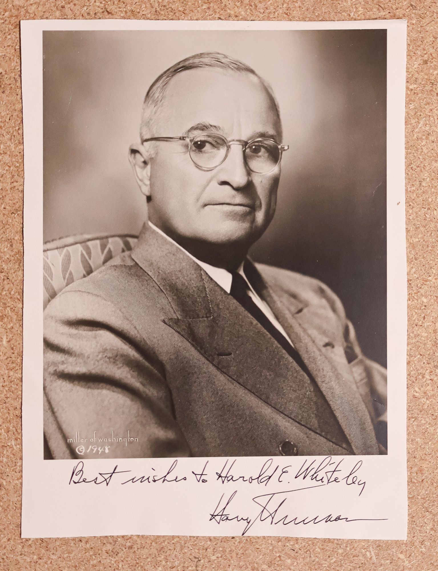 1948. Photograph, w. 8.5 in. x h. 11 in. In Very Good condition. Black and white photographic portrait of former U.S. President Harry S. Truman. Inscribed and signed by Truman in black ink: "Best Wishes to Harold E. Whiteley". Photograph taken in Truman's first term. Photo shows some faint scuffing and smudging, with sparse stress marks near the edges. Shelved in Case 1 1/2 Binder. 1405021. Shelved Dupont Bookstore.